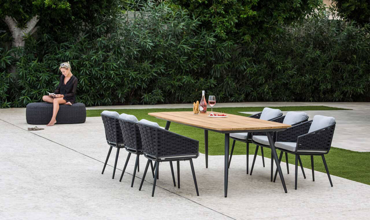 Jati & Kebon fertigt das Amazone Tischgestell für ovale -oder besser gesagt- bootsförmige Tischplatten. Die Tischform hat durch ihre abgerundete Oberfläche keine störenden Ecken und erscheint in Kombination mit passenden Stühlen als eine harmonisch und schöne Sitzgruppe. Das Gestell besteht aus Aluminium in der Farbe „eisengrau“ und ist für Tischplatten der Größe 180x100cm vorgesehen. Die Tischhöhe beträgt ca. 72cm.  Eine Vielzahl an Tischplatten in unterschiedlichen Materialien und Farben ermöglichen die Gestaltung Ihres ganz persönlichen Gartentisches. Witterungsfeste Oberflächen der Tischplatten aus Dekton® oder Keramik komplettieren den Tisch zu einem perfekten Möbel für den Außenbereich. Dies Größe ist geeignet für 6-8 Sitzplätze.