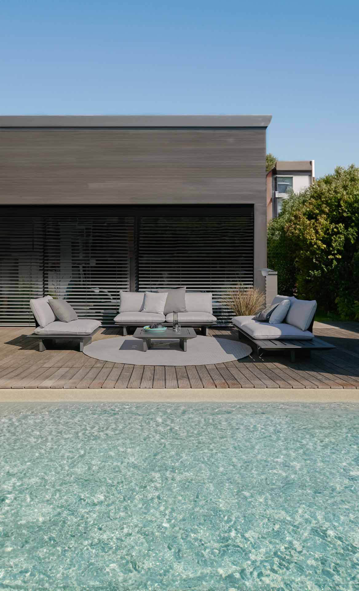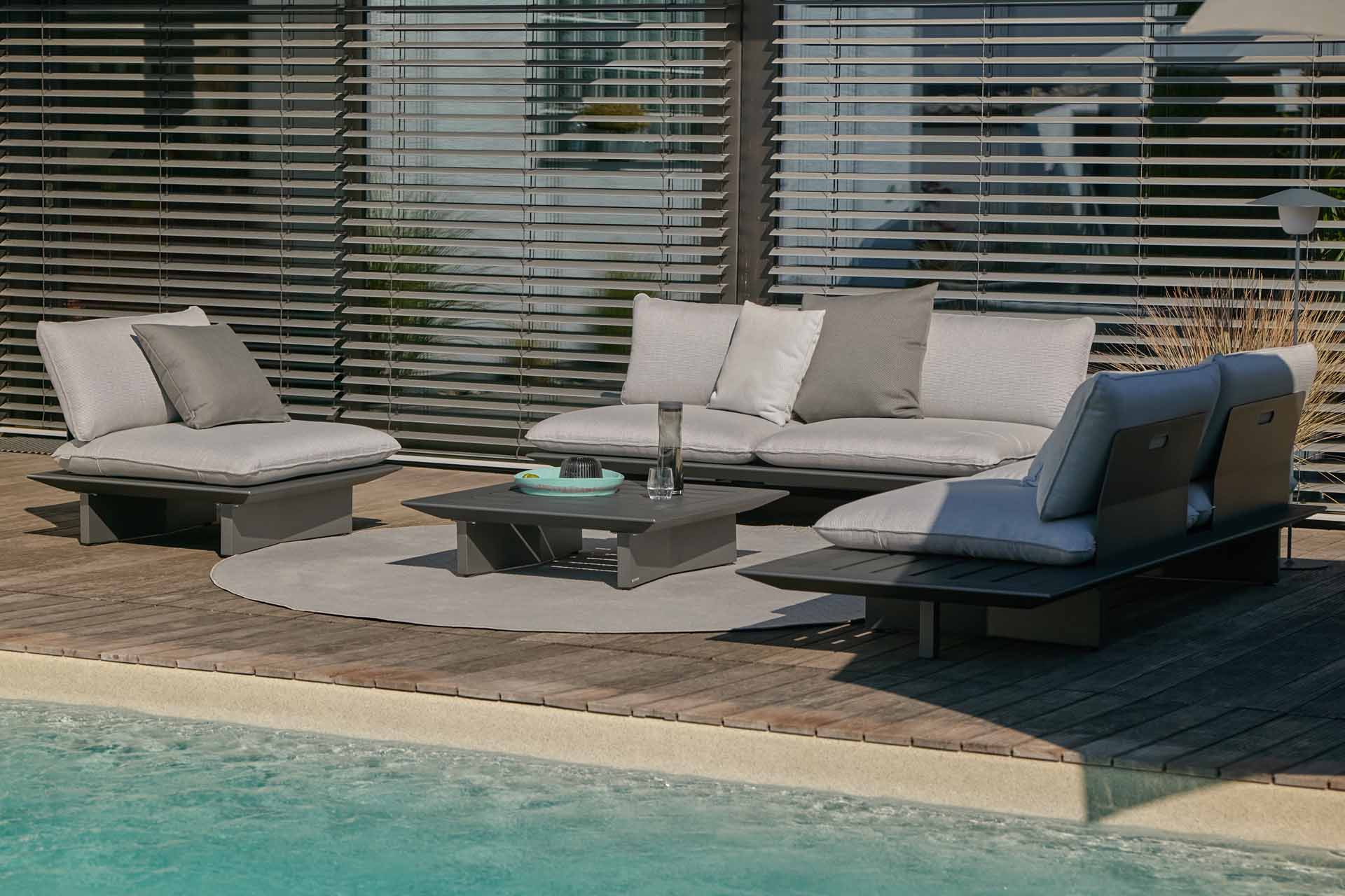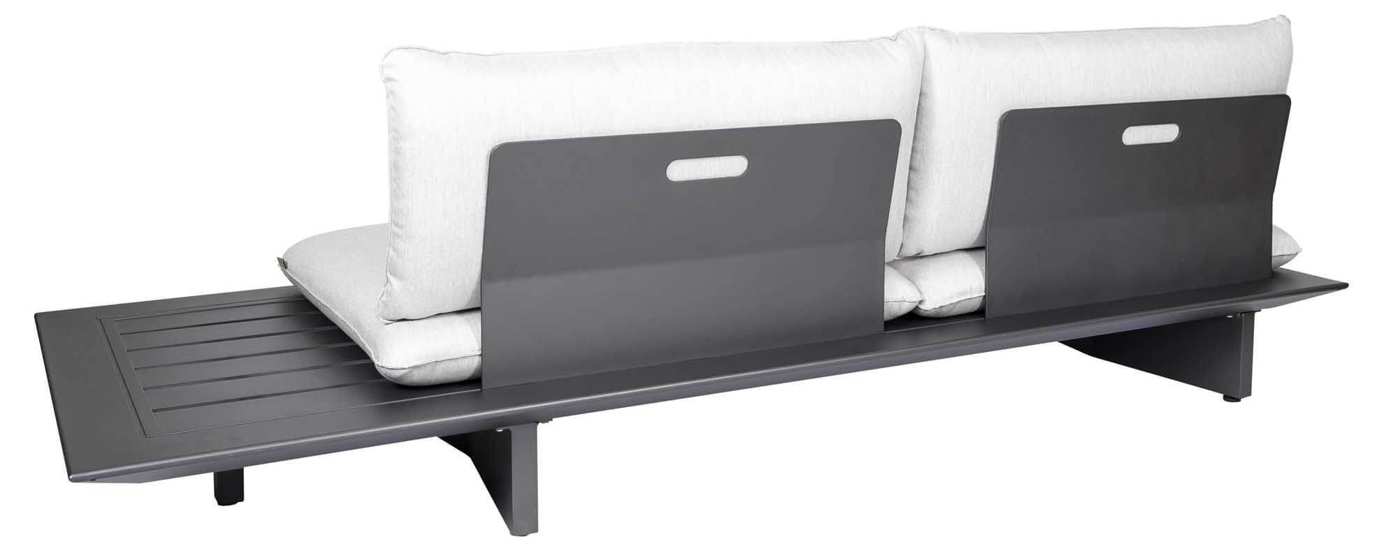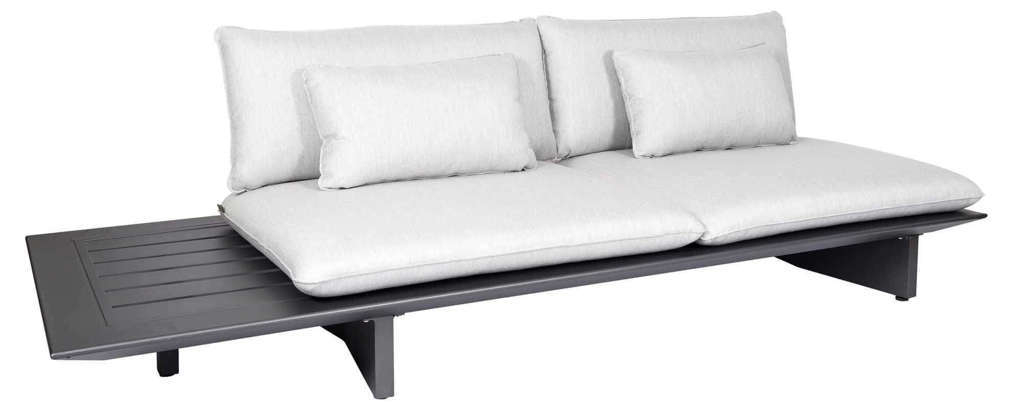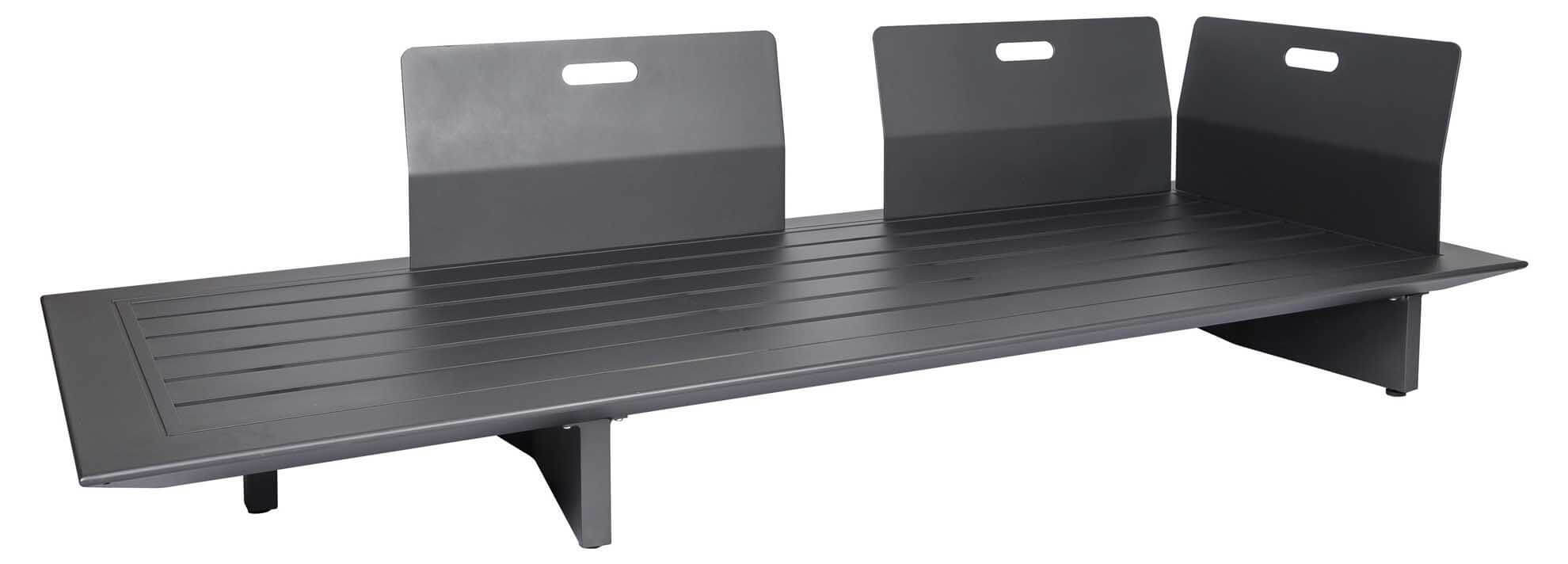 Arbon Lounge 2-Sitzer Basismodul mit seitlicher Ablage. Als Liege, Sofa oder Ecksofa nutzbar (Rückenlehnen gegen Aufpreis). Eisengrau matt pulverbeschichtet. Die Rückenlehnen passen an alle Seiten, daher kann der seitliche Kaffeetisch, je nach Wunsch sowohl an der rechten, wie auch an der linken Seite positioniert werden.