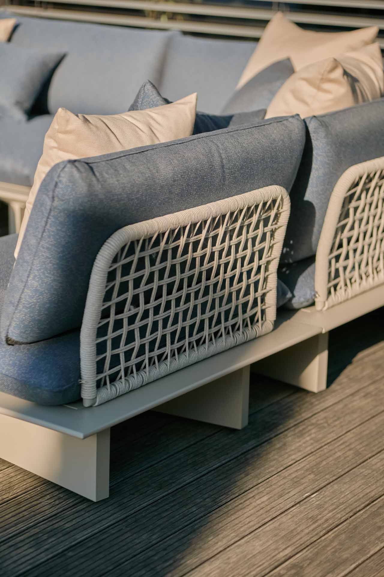 Seilmöbel - Qualitätsfasern mit natürlichem Aussehen. Die Polyolefinfaser hat ein natürliches Aussehen, ist jedoch pflegeleicht und unempfindlich gegen die Kräfte von Mutter Natur. Das Seil ist sowohl für den Innen- als auch für den Außenbereich geeignet. Wie keine andere synthetische oder natürliche Faser ist sie resistent gegen Pilze, Bakterien, Sonnenlicht, Feuchtigkeit, Chlor, Lebensmittelflecken und Schweiß. Es ist extrem leicht, waschbar, umweltfreundlich und vollständig recycelbar. Kombinieren Sie die Sitze und Stühle aus Rope-Geflecht mit maßgeschneiderten, wetterbeständigen Kissen.