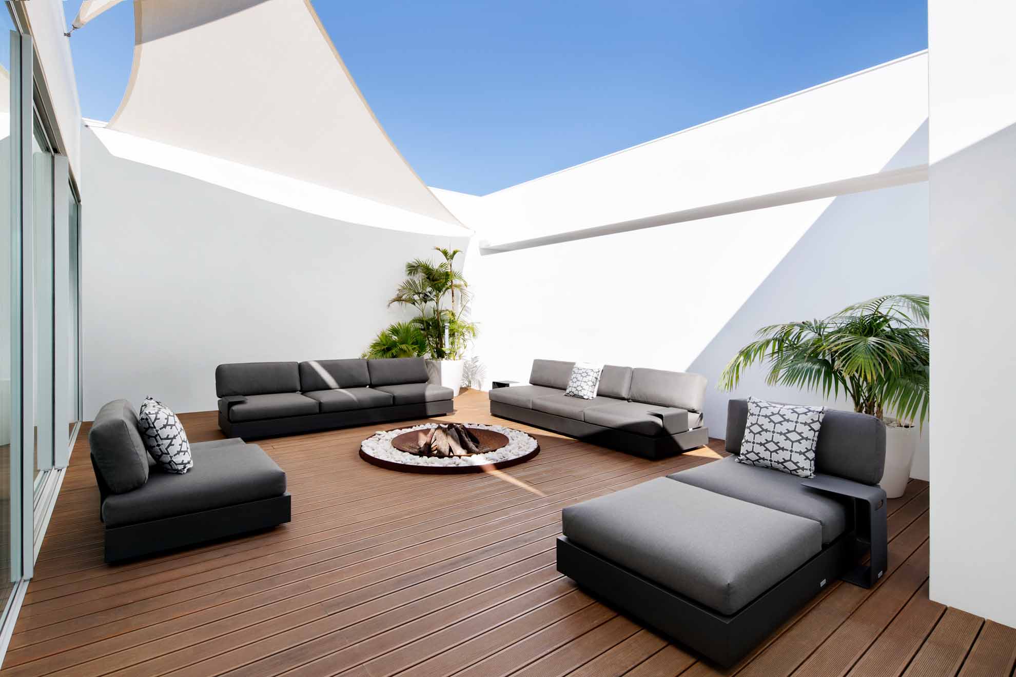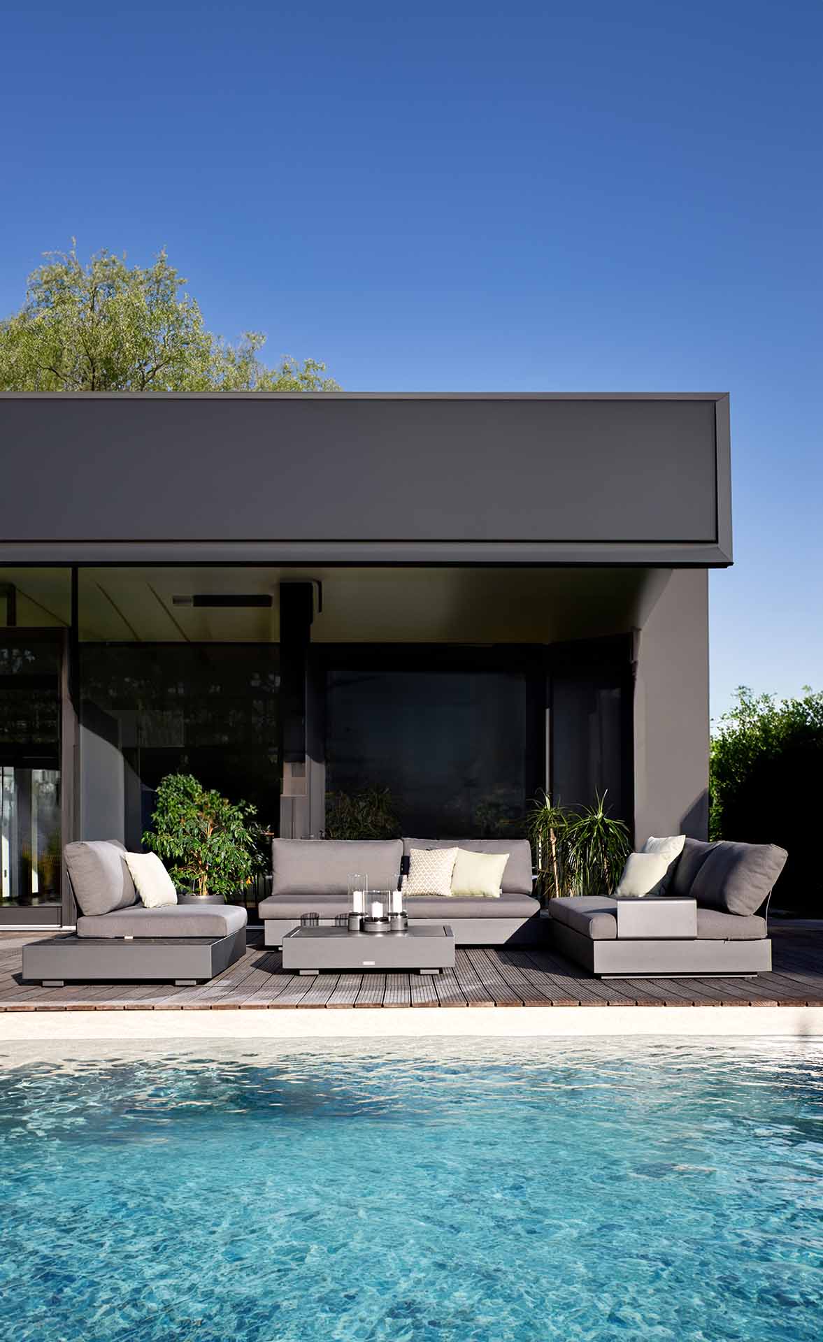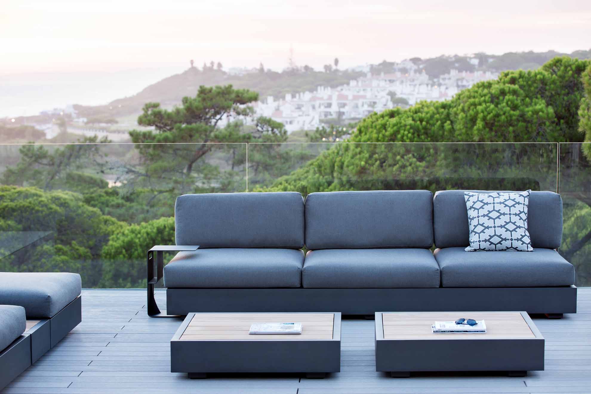 Das Bari Loungemodul von Jati & Kebon ist ein vielseitig verwendbares 3-Sitzer Sofa. Es kann als Liege oder Sofa freistehend genutzt werden, ist aber auch mit zusätzlichen Modulen zu einer Sitzgruppe über Eck erweiterbar. Rückenlehnen, sowie Sitz- und Rückenkissen sind separat im Zubehör bestellbar. Bari Module haben den Vorteil, daß man sie in 3 unterschiedlichen Höhen montieren kann und so lässt sich immer eine bequeme Sitzhöhe finden. Material/Farbe: Aluminium, Pulverbeschichtung in "eisengrau" Maße: B 270cm T 90cm Sitzhöhe (verstellbar, ohne Kissen) 22cm, 27cm, 32cm
