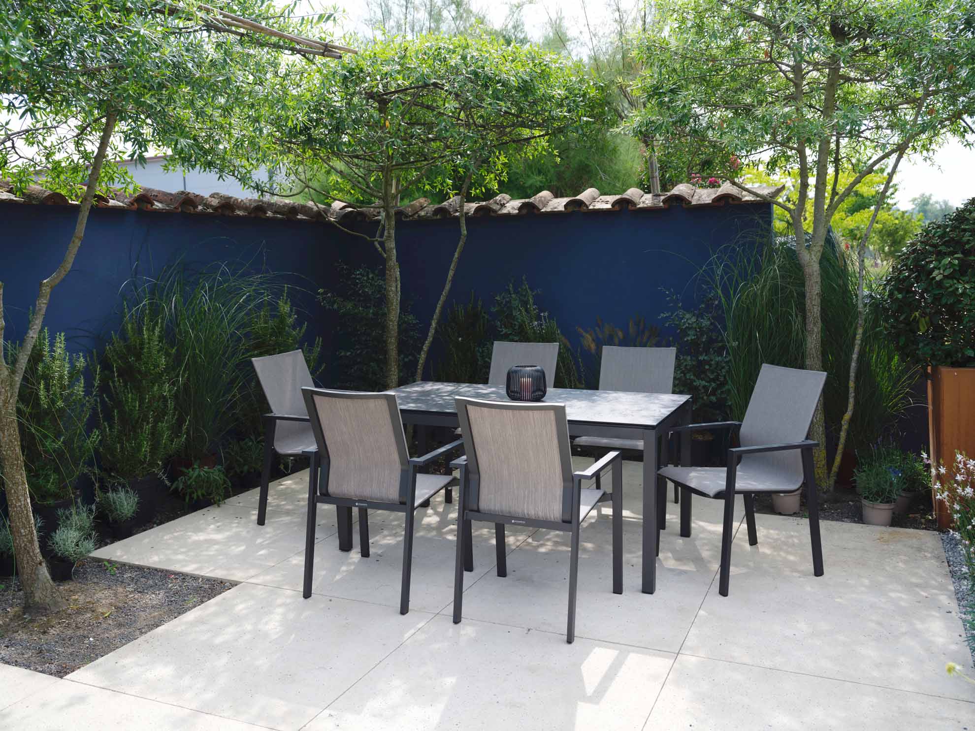 Der robuste Beja Gartensessel von Jati & Kebon besteht aus einem hochwertigen Aluminiumgestell mit Pulverbeschichtung und einer Bespannung aus Jatex-Gewebe. Die Armlehnen aus Teakholz sind ein visuelles sowie haptisches Highlight, das den eleganten Look des Stuhls noch abrundet. Armlehnen aus Holz sorgen nicht nur für ein angenehmes, natürliches Sitzgefühl sondern werden auch bei starker Sonneneinstrahlung nicht heiß. Für bequemes und entspanntes Sitzen sorgt auch die ergonomisch geformte und leicht geneigte Rückenlehne. Die Bespannung aus Jatex-Gewebe ist robust und langlebig und auch ohne Kissen sehr bequem. Der Beja Stapelsessel ist dank hochwertiger Materialien und penibler Verarbeitung absolut wetterfest und ganzjährig einsatzbereit. Bis zu sechs Beja Sessel können ineinander gestapelt werden.