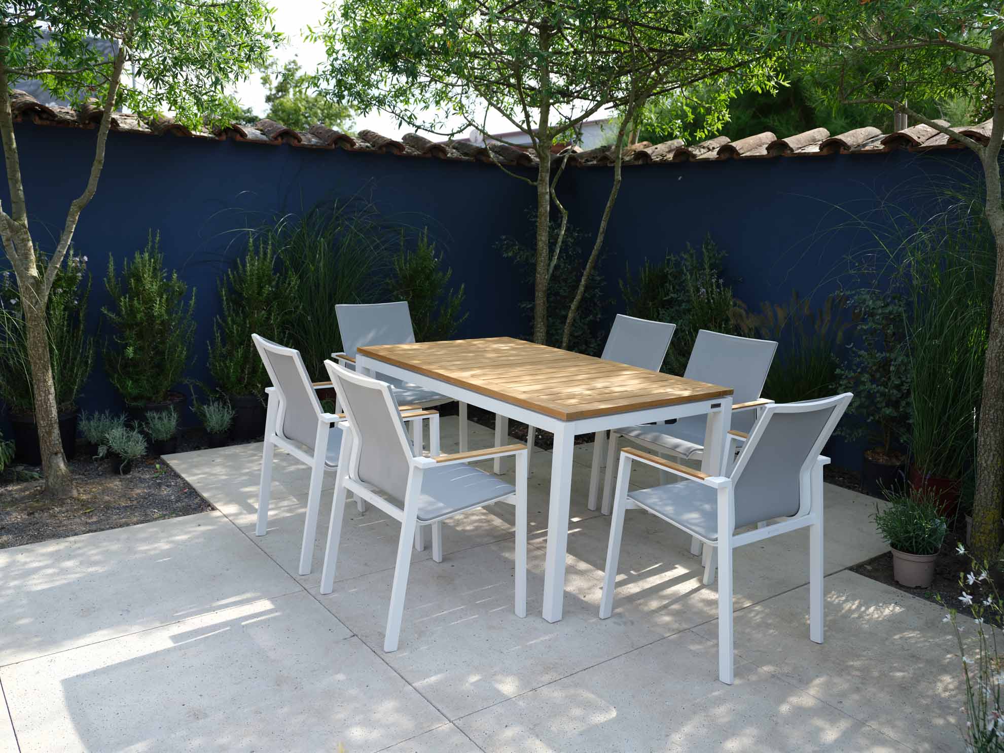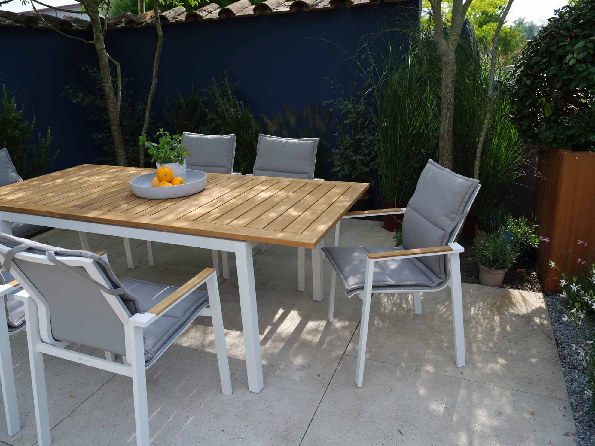 Wir verwenden ausschließlich Teakholz aus kontrolliertem Anbau. Teakholz gehört zu den wertvollsten Nutzhölzern der Welt. Ein hoher Kautschukgehalt bewirkt unter anderem eine starke Wasserabweisung. Das Holz widersteht nicht nur problemlos Nässe, Sonne, Frost und Temperaturschwankungen, sondern besitzt auch eine hohe Resistenz gegen Ungeziefer und Insekten. Teakholz ist zum Dauereinsatz im Freien besonders geeignet. Die meisten Teakmöbel werden naturbelassen geliefert. Im Laufe der Zeit bekommt das Holz durch Witterungseinflüsse eine silbergraue Patina.