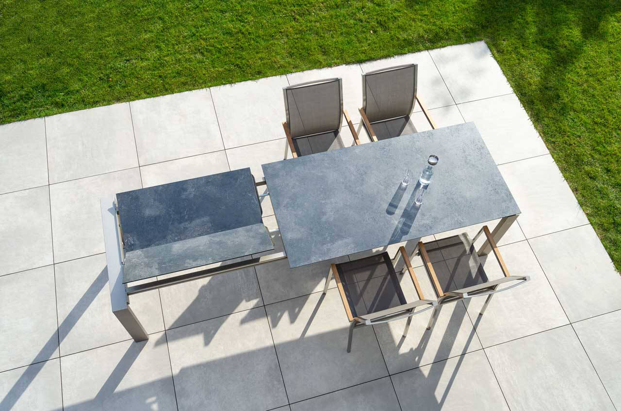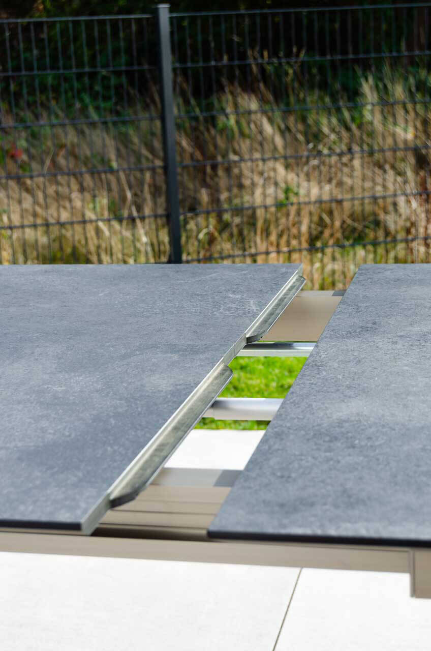 In Bezug auf Design sticht der exklusive Bologna Ausziehtisch von Jati & Kebon mit ganz besonderer Finesse hervor. Auf den rechteckigen Tischbeinen scheint die Tischplatte zu schweben und der silberfarbene Rahmen ergibt einen eindrucksvollen und modernen Kontrast. Im Grundmaß hat der Tisch die Größe 220x95cm und ist um 100cm verlängerbar auf 320x95cm. Das besondere an Bologna Tischen ist die Ausziehtechnik: Durch die Form der Unterkonstruktion lässt sich der Rahmen mit den Tischbeinen verschieben, deshalb hat die Tischplatte keinen Überhang. So stört kein Tischbein an der Tafel und darüber hinaus ist der Bologna Tisch in ausgezogener Größe eine imposante Erscheinung. Das Gestell besteht aus Aluminium mit einer Pulverbeschichtung in der Farbe weiß-matt. Die 3-teilige Tischplatte ist aus HPL im Design zement grau. Die Tischgröße eignet sich für 10-12 Sitzplätze.
