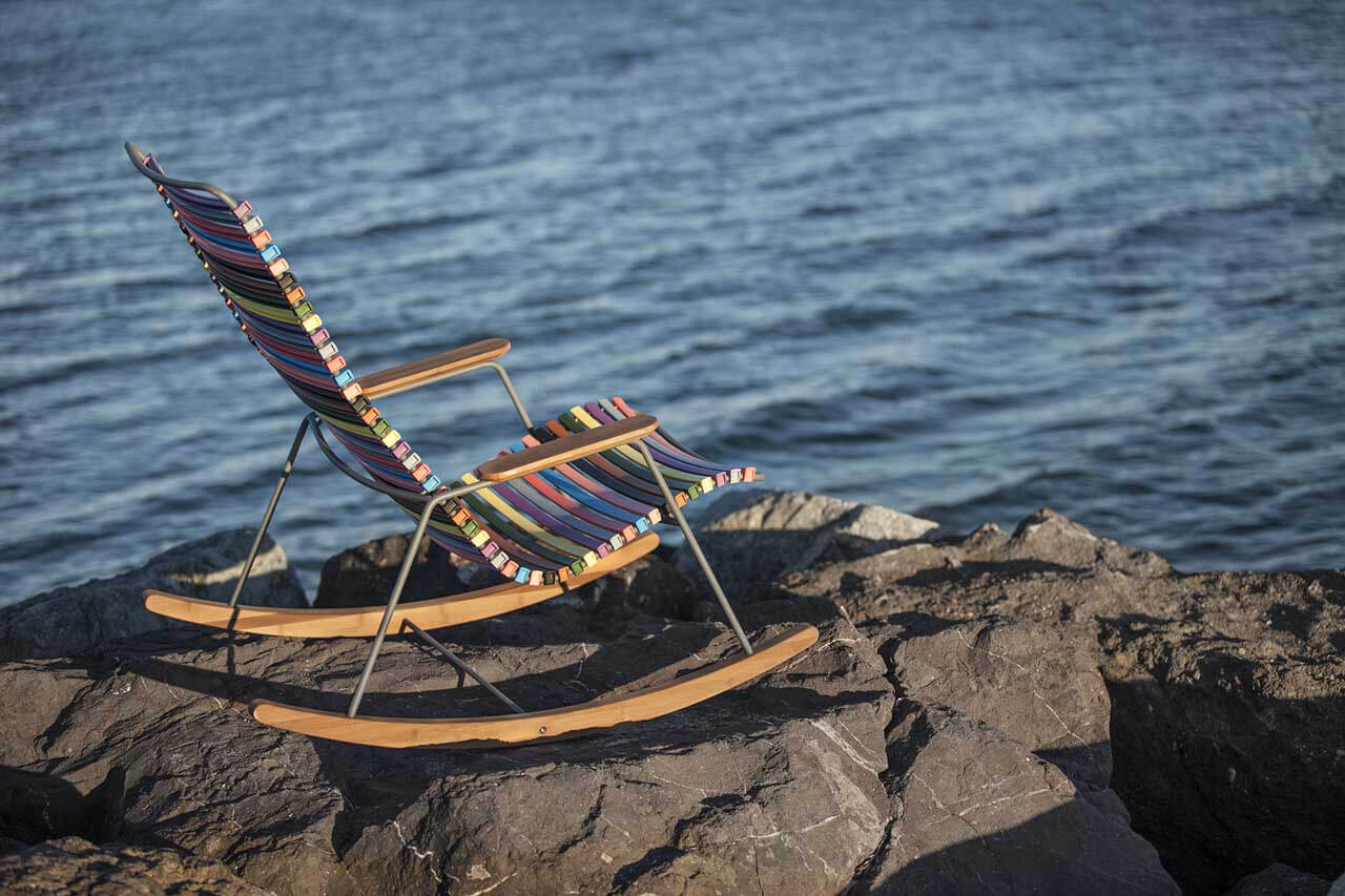 Die meisten Menschen sitzen gerne in einem Schaukelstuhl. Der Körper kommt in der dynamischen Schaukelbewegungen zur Ruhe und es lässt sich kaum sanfter entspannen. Der Schwingstuhl ist wieder in Mode gekommen und wird in neuen Formen und Materialien zum Highlight der Terrasse. Houe hat den modernen Click Rocking Chair entworfen in einem ansprechendem, frischen Design das zum hineinsetzen einlädt. Das Gestell besteht aus grauem, pulverbeschichtetem Stahl und die Lamellen aus Kunststoff im Farbmix " multi color1 ". Die Armlehnen und Kufen sind aus Bambus hergestellt und geben dieser spannenden Materialkombination seine besondere Note. Genießen Sie den angenehmen Sitzkomfort in einem Click Schaukelstuhl . Farbe: 45 lemon zest