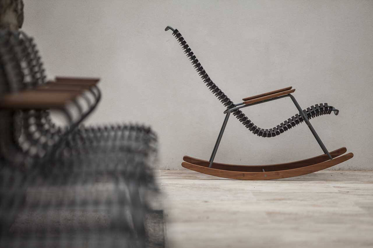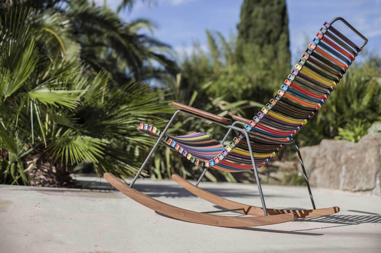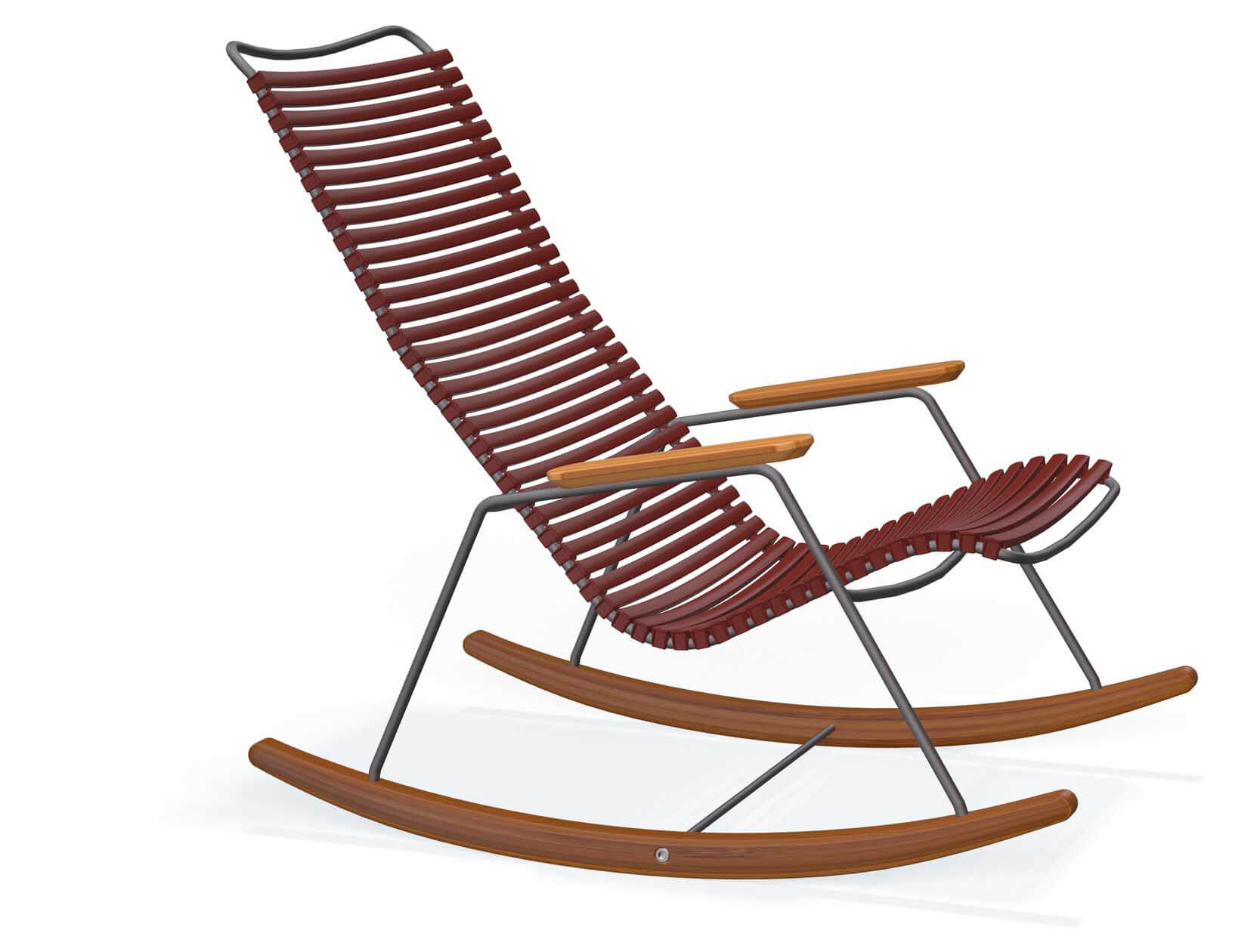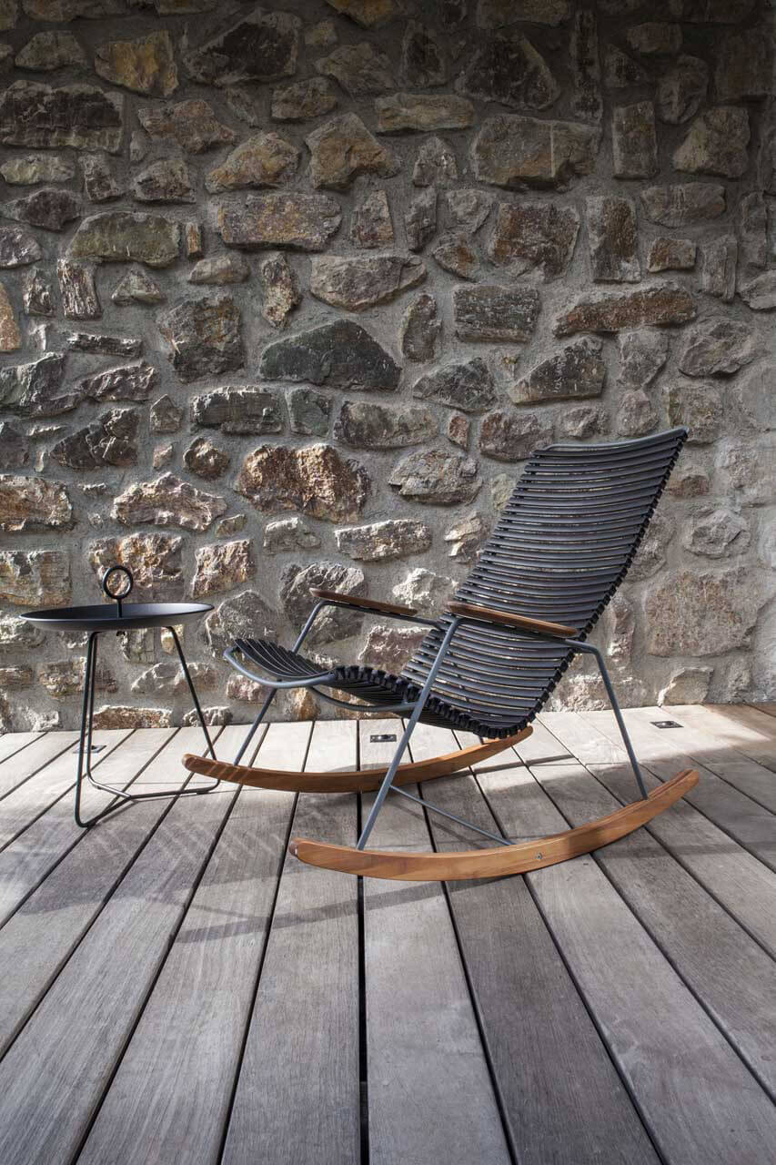 Die meisten Menschen sitzen gerne in einem Schaukelstuhl. Der Körper kommt in der dynamischen Schaukelbewegungen zur Ruhe und es lässt sich kaum sanfter entspannen. Der Schwingstuhl ist wieder in Mode gekommen und wird in neuen Formen und Materialien zum Highlight der Terrasse. Houe hat den modernen Click Rocking Chair entworfen in einem ansprechendem, frischen Design das zum hineinsetzen einlädt. Das Gestell besteht aus grauem, pulverbeschichtetem Stahl und die Lamellen aus Kunststoff im Farbmix " multi color1 ". Die Armlehnen und Kufen sind aus Bambus hergestellt und geben dieser spannenden Materialkombination seine besondere Note. Genießen Sie den angenehmen Sitzkomfort in einem Click Schaukelstuhl . Farbe: 83 multi colour 1 Art.NR.: 10804-8318
