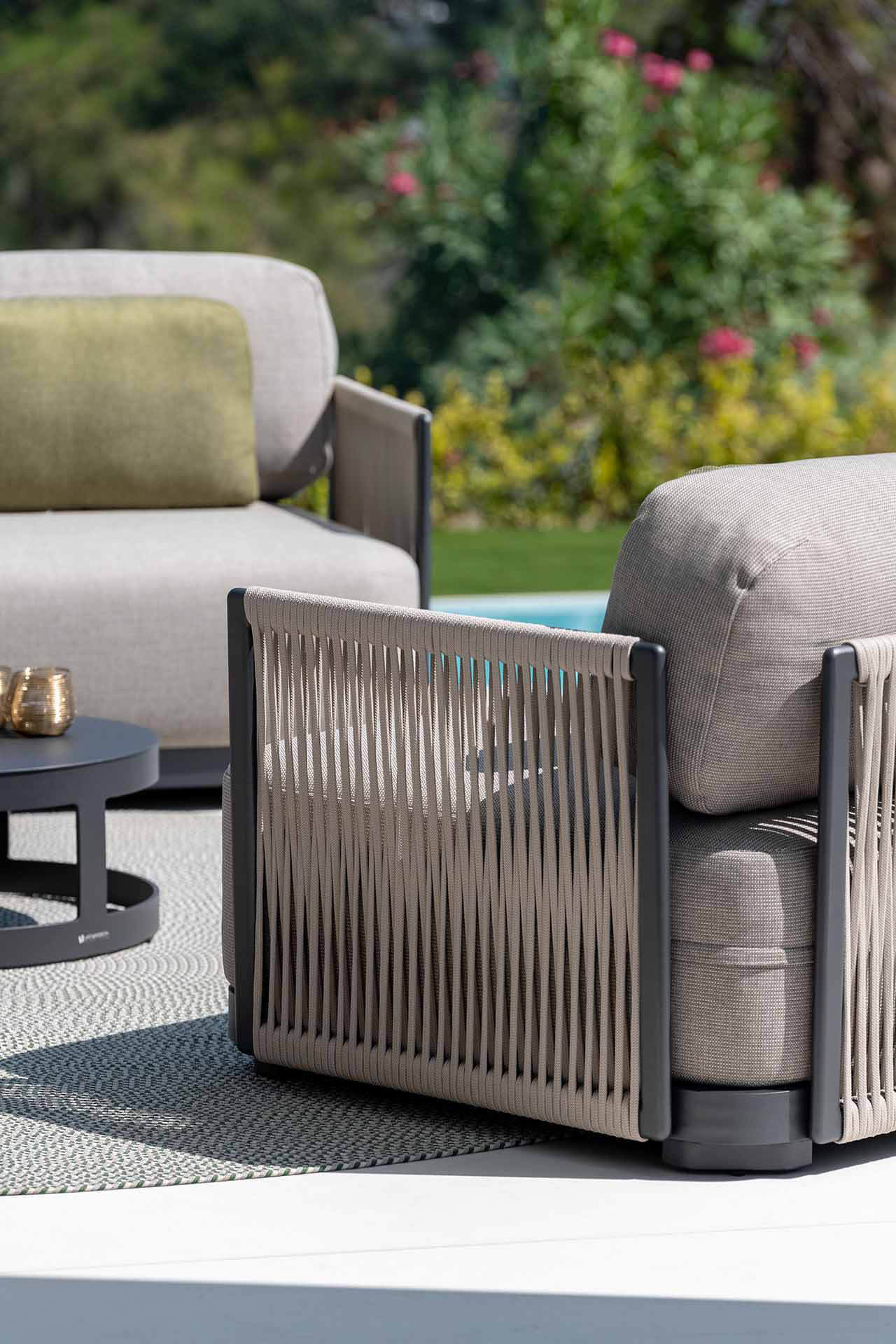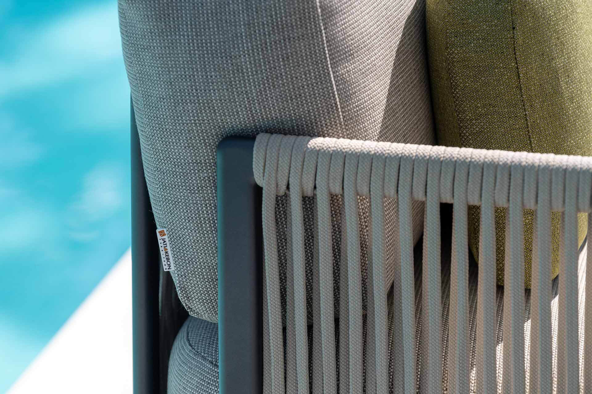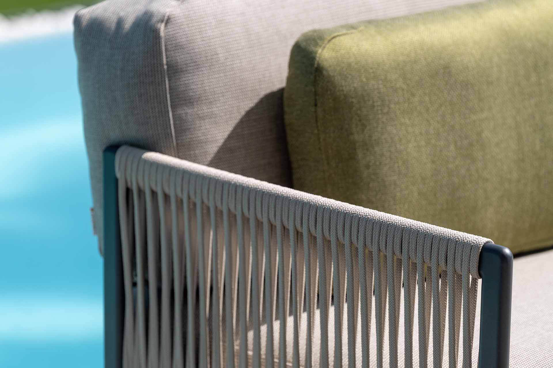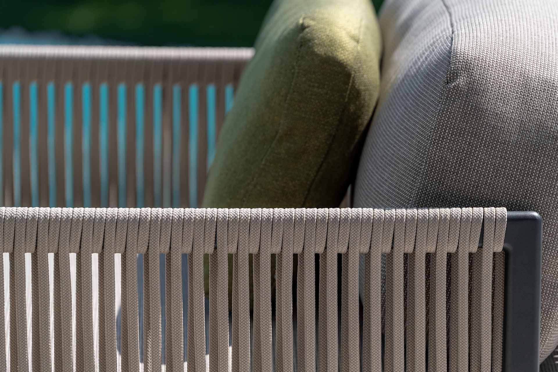 Seilmöbel - Qualitätsfasern mit natürlichem Aussehen. Die Polyolefinfaser hat ein natürliches Aussehen, ist jedoch pflegeleicht und unempfindlich gegen die Kräfte von Mutter Natur. Das Seil ist sowohl für den Innen- als auch für den Außenbereich geeignet. Wie keine andere synthetische oder natürliche Faser ist sie resistent gegen Pilze, Bakterien, Sonnenlicht, Feuchtigkeit, Chlor, Lebensmittelflecken und Schweiß. Es ist extrem leicht, waschbar, umweltfreundlich und vollständig recycelbar. Kombinieren Sie die Sitze und Stühle aus Rope-Geflecht mit maßgeschneiderten, wetterbeständigen Kissen.