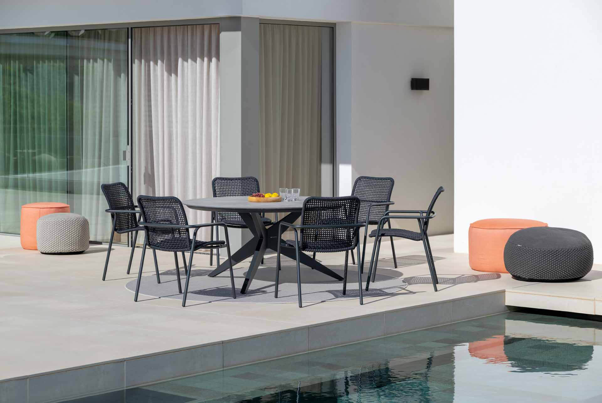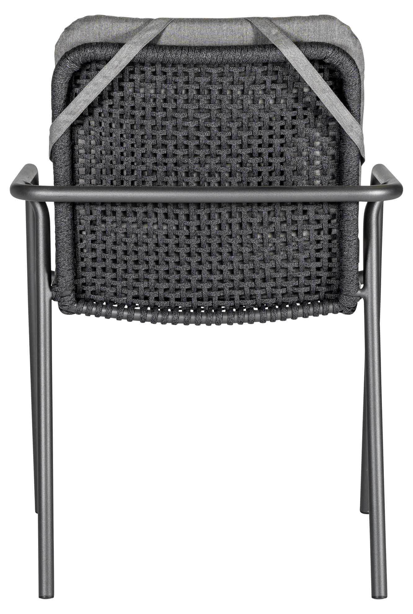 Sitz- und Rückenfläche sind mit einer wetterfesten Kunststofffaser in Rope-Optik umflochten, die harmonisch um das Gestell geführt wird. Das Geflecht ist robust, formstabil und zugleich angenehm im Sitzgefühl. So entsteht ein komfortabler Stapelsessel, der auch bei längerem Sitzen überzeugt.