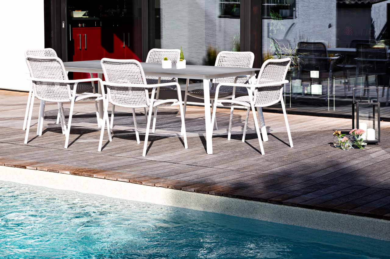 Gartenmöbel aus Aluminium sind geradezu ideal für den Einsatz im Freien geeignet. Das geringe Gewicht, die Wetterbeständigkeit, sowie die außerordentliche Langlebigkeit machen Aluminium zur 1. Wahl bei Gartenmöbeln aus Metall. Damit das Material nicht „ausblüht“ sind unsere Aluminium-Gartenmöbel mit hochwertigen Pulverbeschichtungen versehen. Viele Artikel sind in verschiedenen Farben erhältlich. Fast alle Aluminium-Gartenmöbel aus unserem Sortiment werden in aufwendiger Handarbeit gefertigt. Die Schweißnähte werden geschliffen und poliert, sodass Verbindungen anmuten als wären sie „aus einem Guss“.