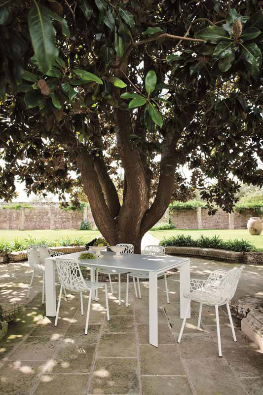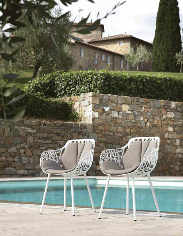 Forest Sessel von Fast bestehen aus druckgegossenem Aluminium sind ein Verweis auf die grafischen Muster, die zwischen Licht und Schatten in der Natur entstehen. Die in mehreren Farben erhältliche Stuhlkollektion ist für den Einsatz im Freien und für gesellige Anlässe gedacht: Drinks, ein Brunch im Freien oder ein gemütliches Abendessen. Forest Stühle sind stapelbar und die Beine sind abschraubbar.