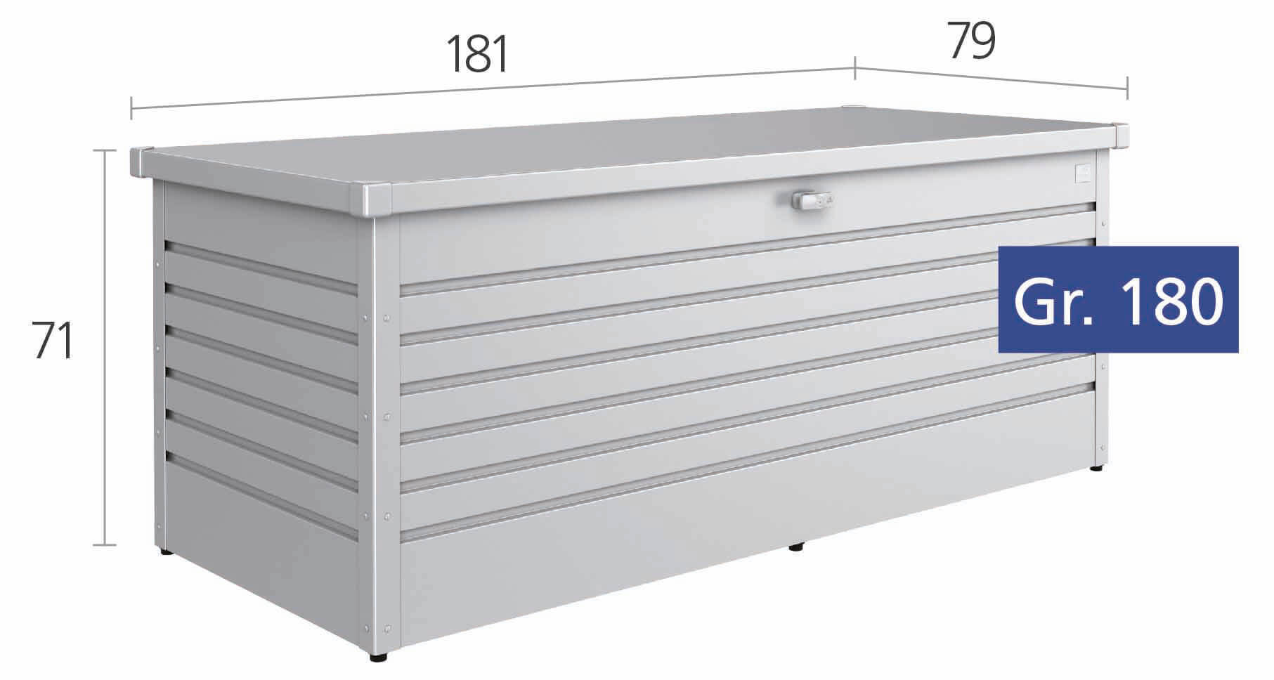Die Kissenbox von Biohort ist der ideale Aufbewahrungsort für die Dinge, die sonst keinen Platz finden. Die eindrucksvolle Optik ist garantiert ein Highlight auf jeder Terrasse. Bestens geeignet für Sitzkissen, Spielzeug, Sportutensilien und vieles mehr. Die Box ist regendicht und die unsichtbare Durchlüftung vermeidet Schimmelbildung. Der abschließbare Deckel mit Scharnieren aus Edelstahl lässt sich leicht durch Gasdruckfedern öffnen. Die Freizeitbox hat die Maße 181x79x71cm und besteht aus feuerverzinktem Stahlblech mit einer Polyamid-Einbrennlackierung in "dunkelgrau-metallic" . Die Freizeitbox 180 ist wartungsfrei und der Hersteller gewährt eine Garantie von 20 Jahren. Artikel-Nr.:65030