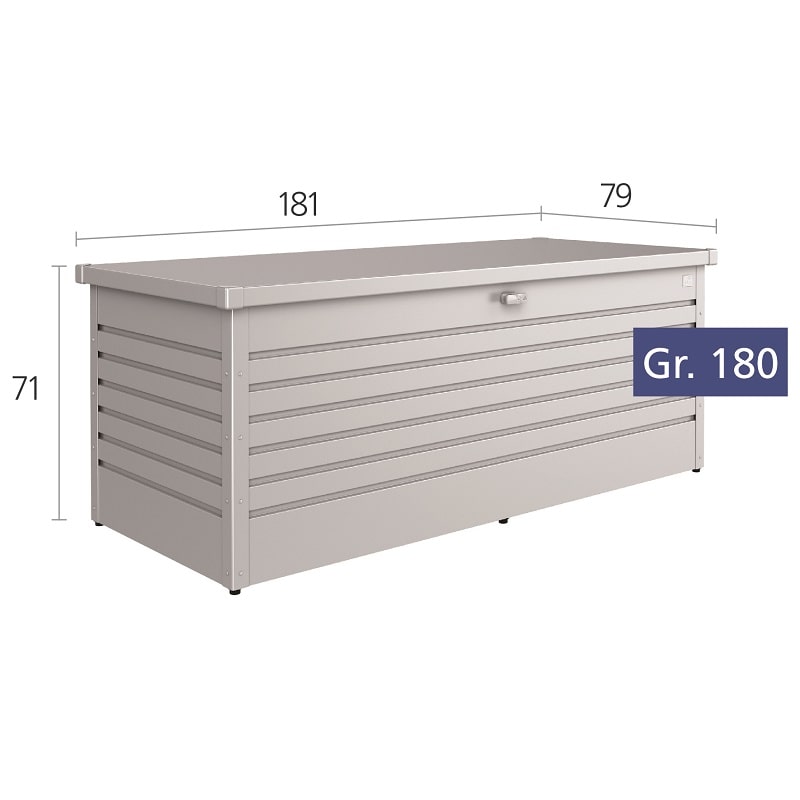 Die Kissenbox von Biohort ist der ideale Aufbewahrungsort für die Dinge, die sonst keinen Platz finden. Die eindrucksvolle Optik ist garantiert ein Highlight auf jeder Terrasse. Bestens geeignet für Sitzkissen, Spielzeug, Sportutensilien und vieles mehr. Die Box ist regendicht und die unsichtbare Durchlüftung vermeidet Schimmelbildung. Der abschließbare Deckel mit Scharnieren aus Edelstahl lässt sich leicht durch Gasdruckfedern öffnen. Die Freizeitbox hat die Maße 181x79x71cm und besteht aus feuerverzinktem Stahlblech mit einer Polyamid-Einbrennlackierung in "dunkelgrau-metallic" . Die Freizeitbox 180 ist wartungsfrei und der Hersteller gewährt eine Garantie von 20 Jahren. Artikel-Nr.:65030