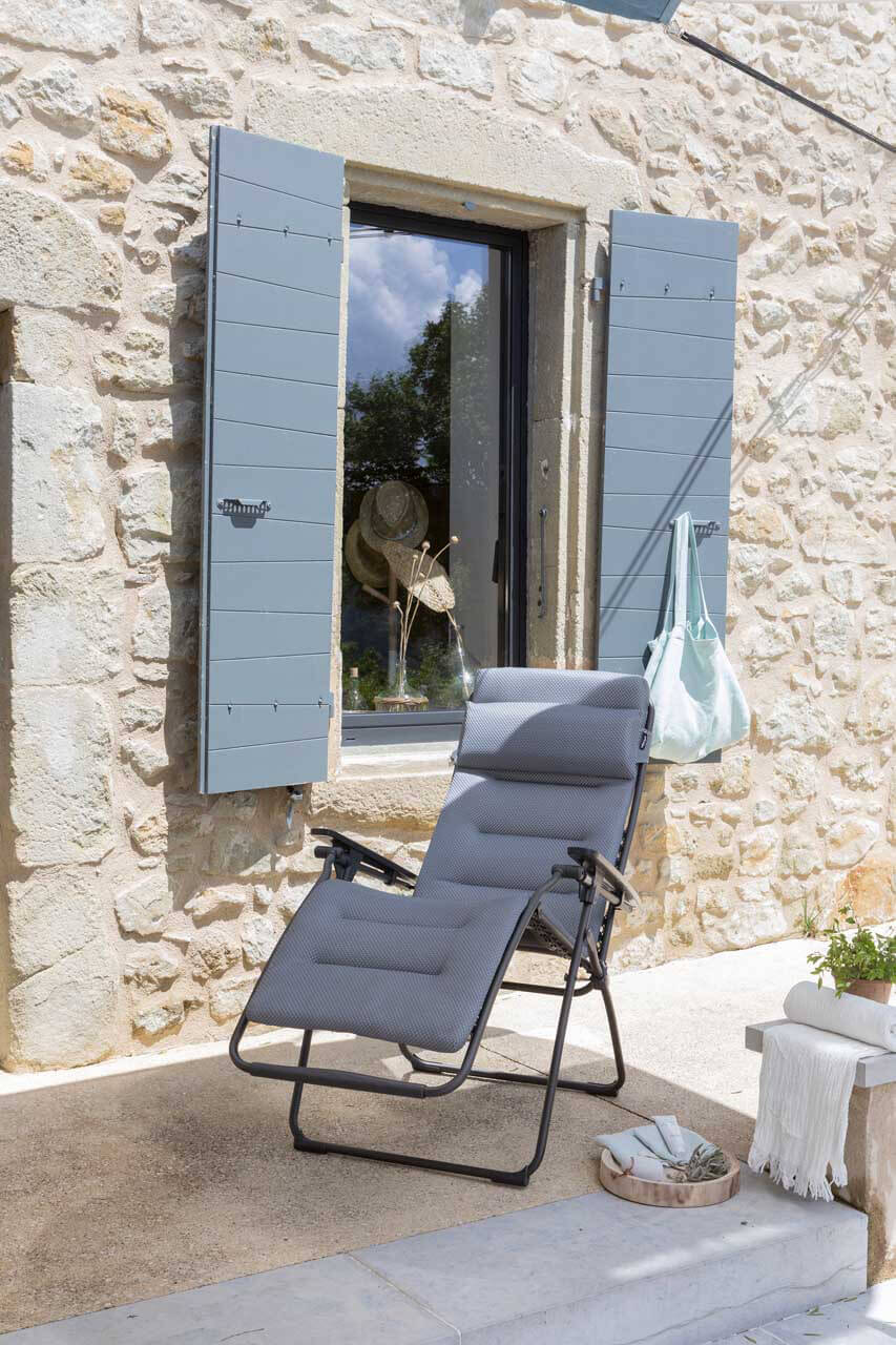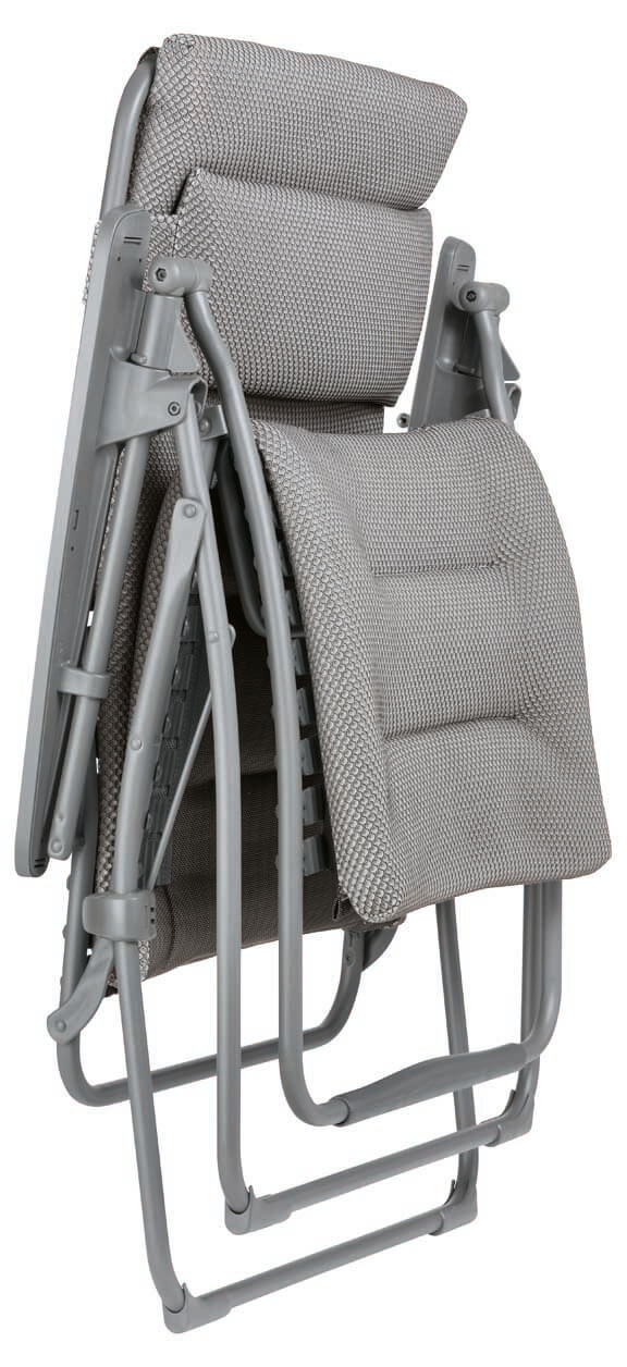 Der wichtigste Vorteil des Futura XL Be Comfort Relaxsessels besteht in dem von ihm erbrachten unvergleichlichen Komfort. Durch die große Verstellmöglichkeit erreichen Sie immer eine angenehme Liegeposition um Rücken, Beine und Nacken optimal zu entlasten. Dank eines ausgeklügelten Befestigungssystems für den Bezug findet der Rücken perfekten Halt und das Körpergewicht verteilt sich ideal. Mit dem verstellbaren Kopfstützkissen des Relaxsessels werden die Druckzonen des Körpers entlastet und der Nacken sanft gestützt. Die umweltfreundlich und stylische Auflage besteht aus drei Schichten. Ein 3D-Gewebe, ein atmungsaktive Polyesterwatte und dem Batyline® Gewebe. Die Auflage in der Farbe "dark grey" ist frei von giftigen Substanzen für Körper und Umwelt. Sie ist beständig gegen UV-Strahlen und Witterungseinflüsse, hat eine Dicke von 4 cm. Das robuste Gestell besteht aus einer titanfarbenen Stahlrohrkonstruktion mit 2mm Wandstärke. Sie können den Lafuma Relaxsessel an kühleren Abenden Drinnen als auch im Freien bei schönem Wetter verwenden.