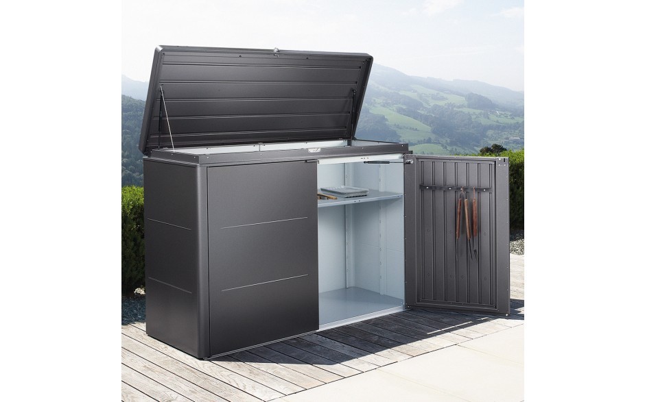 Die Einsatzmöglichkeiten des HighBoard160 von Biohort sind dank Flügeltüren und Deckelöffnung vielfältig: ob als Stauraum für Kissen, Gartenutensilien oder als ideale Ergänzung zu Ihrer Outdoor-Küche - alles ist witterungsgeschützt und ordentlich verstaut. Die edle Optik wurde von Industriedesignern entworfen und ist daher sicher ein Highlight auf Ihrer Terrasse. Eine integrierte, unsichtbare Durchlüftung und die absolute Dichtheit gegen Regenwasser schützen den Inhalt zuverlässig. Der Deckel sowie die Türen schließen mittels Gasdruckfeder und ein Drehknebel Zylinderschloß schützt vor ungewollter Öffnung oder Diebstahl. Die Maße des Highboard 160 Gartenschrank`s sind 160x70x118cm. Die hochwertige Oberfläche wird mittels einer Polyamid-Einbrennlackierung erstellt. Die Farbe der Box ist "dunkelgrau-metallic". Die Kissenbox ist wartungsfrei und der Hersteller gewährt eine Garantie von 20 Jahren.