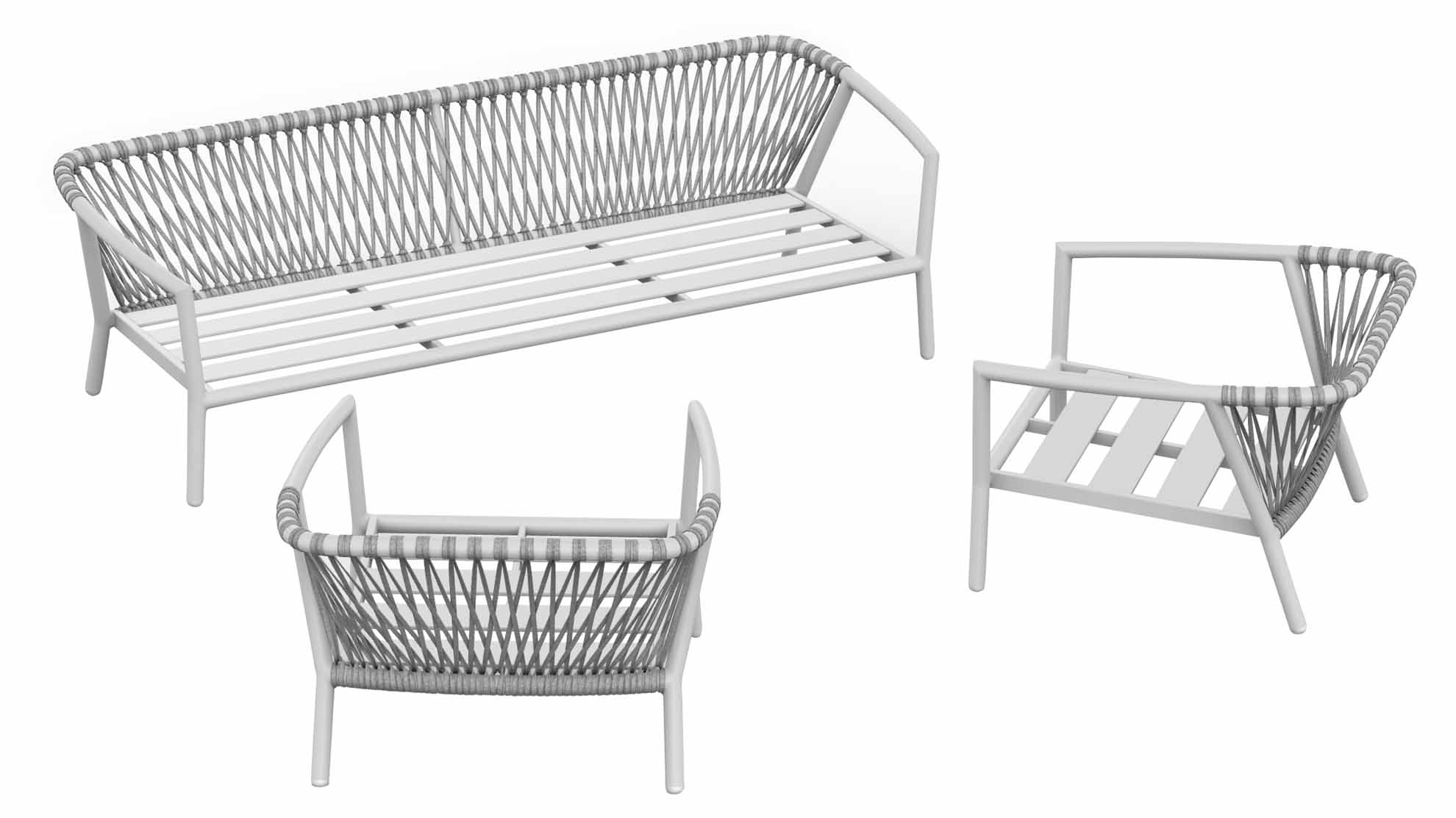Kapra von Jati&Kebon zeigt, wie apart und wohnlich eine Lounge-Garnitur sein kann. Das Design ist zurückhaltend und wirkt doch sehr elegant. Die Struktur des 2,5-Sitzer Lounge Sofas besteht aus einem robusten Aluminiumrahmen in Rundform mit einer Sitzfläche aus rechteckigem Aluminiumprofilen. Die Oberflächen sind pulverbeschichtet in der Farbe weiß-matt. Die Pulverbeschichtung bietet im Gegensatz zu einer herkömmlichen Lackierung einen wesentlich höheren Schutz gegen Verwitterung und Beschädigungen und sorgt für eine langjährige Haltbarkeit. Die Bespannung besteht aus Rope in der Farbe light grey melange. Rope-Geflecht besteht zu 100% aus Polyolefinfasern, dieses Material nimmt keinerlei Feuchtigkeit auf, ist UV-Beständig und fühlt sich zudem auch sehr weich an. Dieser Materialmix macht Kapra daher zu pefekten Outdoor-Möbeln. Maßgefertigte Kissen in unterschiedlichen Farben und mit EverDry Füllung sind im Zubehör bestellbar.