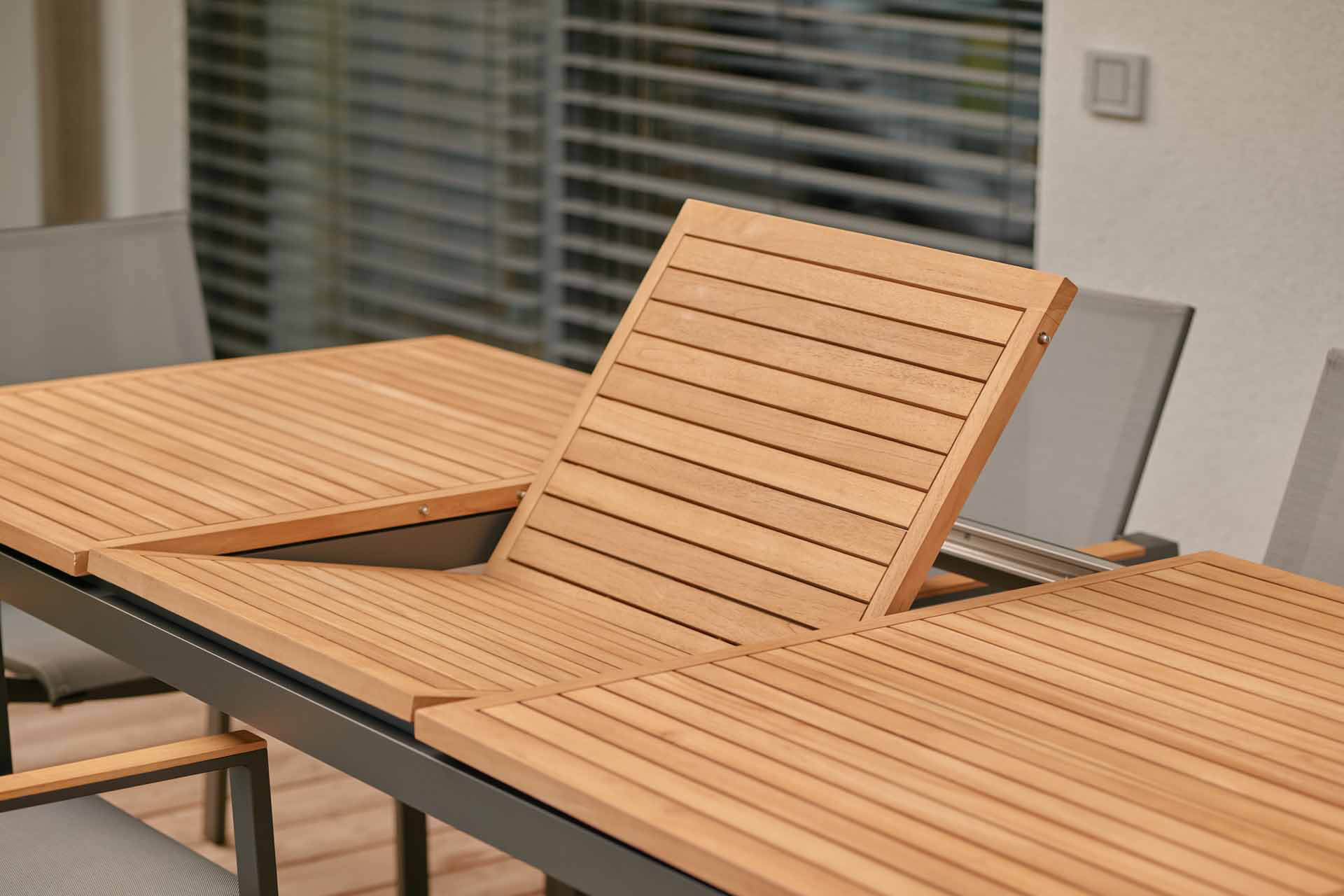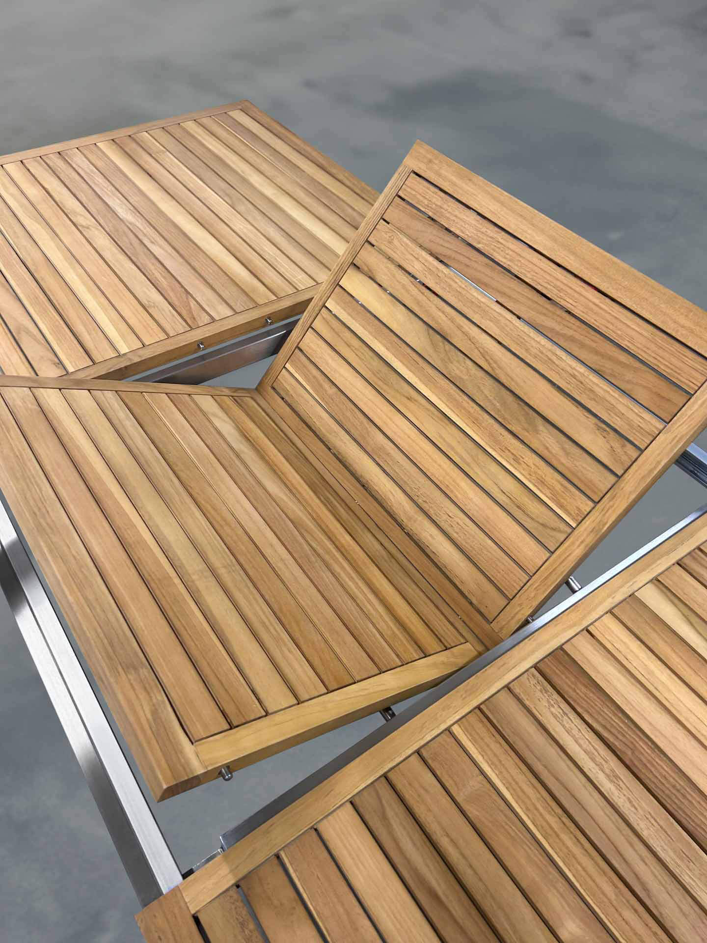 Die Tischplatte des Kreta Ausziehtischs besteht aus hochwertigem Teakholz, das für seine natürliche Widerstandsfähigkeit gegenüber Witterungseinflüssen bekannt ist und eine zeitlose Schönheit ausstrahlt. Die gelungene Kombination aus dem Edelstahlgestell und der Teakholzplatte verleiht dem Tisch eine harmonische und ansprechende Ästhetik.