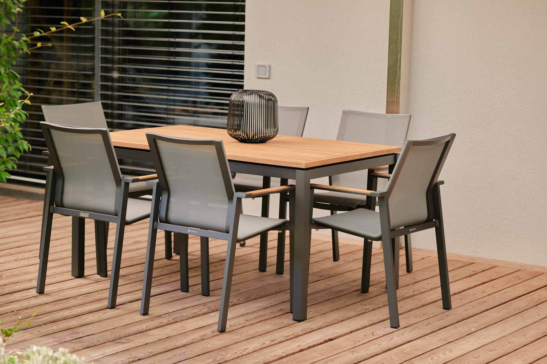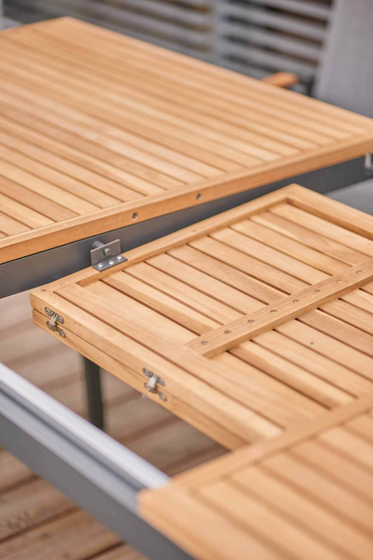 Der Kreta Ausziehtisch vereint Funktionalität mit ästhetischem Design und ist besonders gut für kleinere Platzverhältnisse geeignet. Mit seiner flexiblen Größe und der hochwertigen Verarbeitung aus Aluminium und Teakholz ist er eine perfekte Ergänzung für Ihren Außenbereich. Egal, ob Sie kleine Familienessen oder große Gartenpartys planen, dieser Ausziehtisch bietet Ihnen den benötigten Platz und verleiht Ihrem Outdoor-Bereich Stil und Klasse.