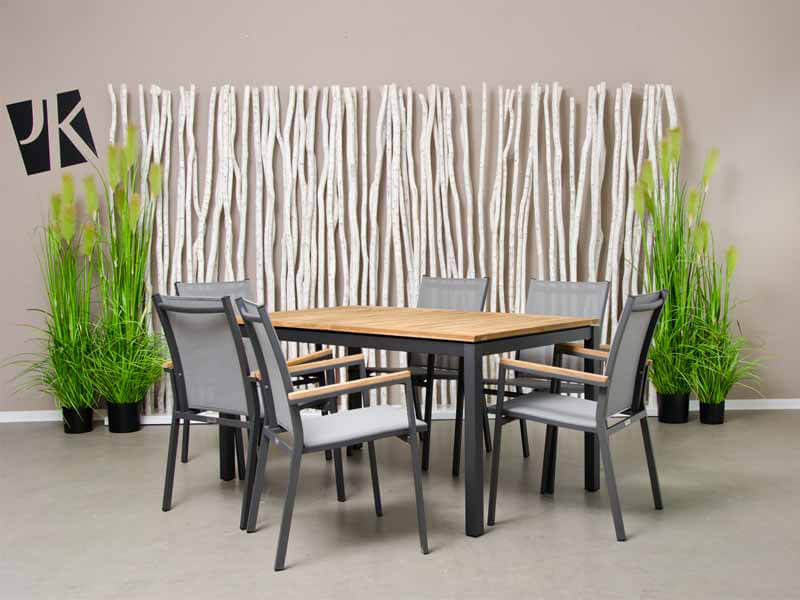 Wir verwenden ausschließlich Teakholz aus kontrolliertem Anbau. Teakholz gehört zu den wertvollsten Nutzhölzern der Welt. Ein hoher Kautschukgehalt bewirkt unter anderem eine starke Wasserabweisung. Das Holz widersteht nicht nur problemlos Nässe, Sonne, Frost und Temperaturschwankungen, sondern besitzt auch eine hohe Resistenz gegen Ungeziefer und Insekten. Teakholz ist zum Dauereinsatz im Freien besonders geeignet. Die meisten Teakmöbel werden naturbelassen geliefert. Im Laufe der Zeit bekommt das Holz durch Witterungseinflüsse eine silbergraue Patina.