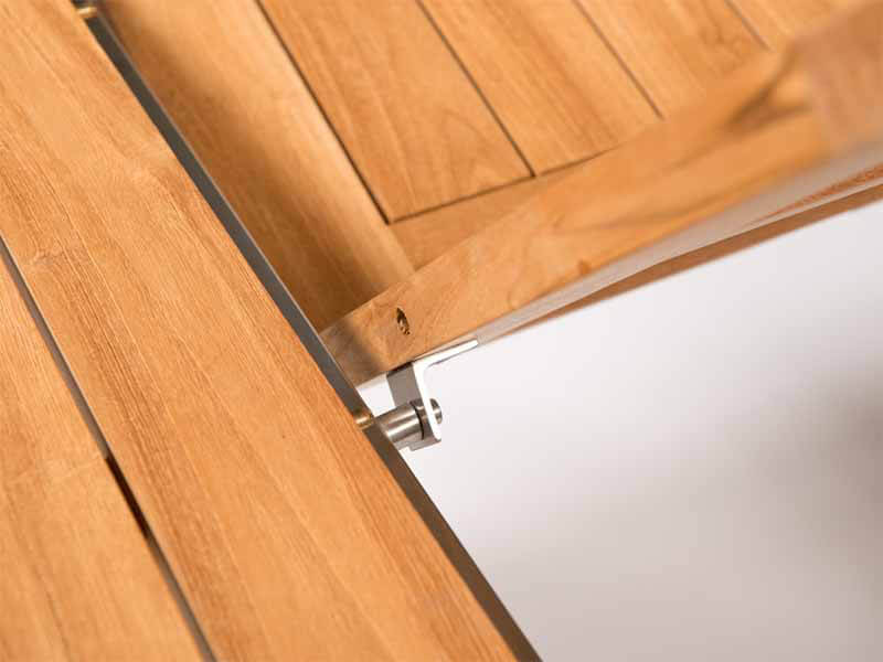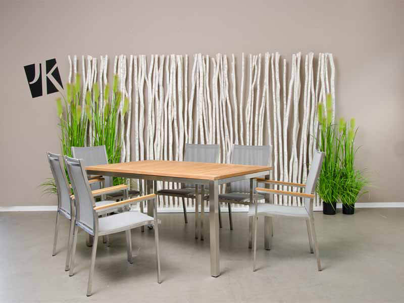Wir verwenden ausschließlich Teakholz aus kontrolliertem Anbau. Teakholz gehört zu den wertvollsten Nutzhölzern der Welt. Ein hoher Kautschukgehalt bewirkt unter anderem eine starke Wasserabweisung. Das Holz widersteht nicht nur problemlos Nässe, Sonne, Frost und Temperaturschwankungen, sondern besitzt auch eine hohe Resistenz gegen Ungeziefer und Insekten. Teakholz ist zum Dauereinsatz im Freien besonders geeignet. Die meisten Teakmöbel werden naturbelassen geliefert. Im Laufe der Zeit bekommt das Holz durch Witterungseinflüsse eine silbergraue Patina.