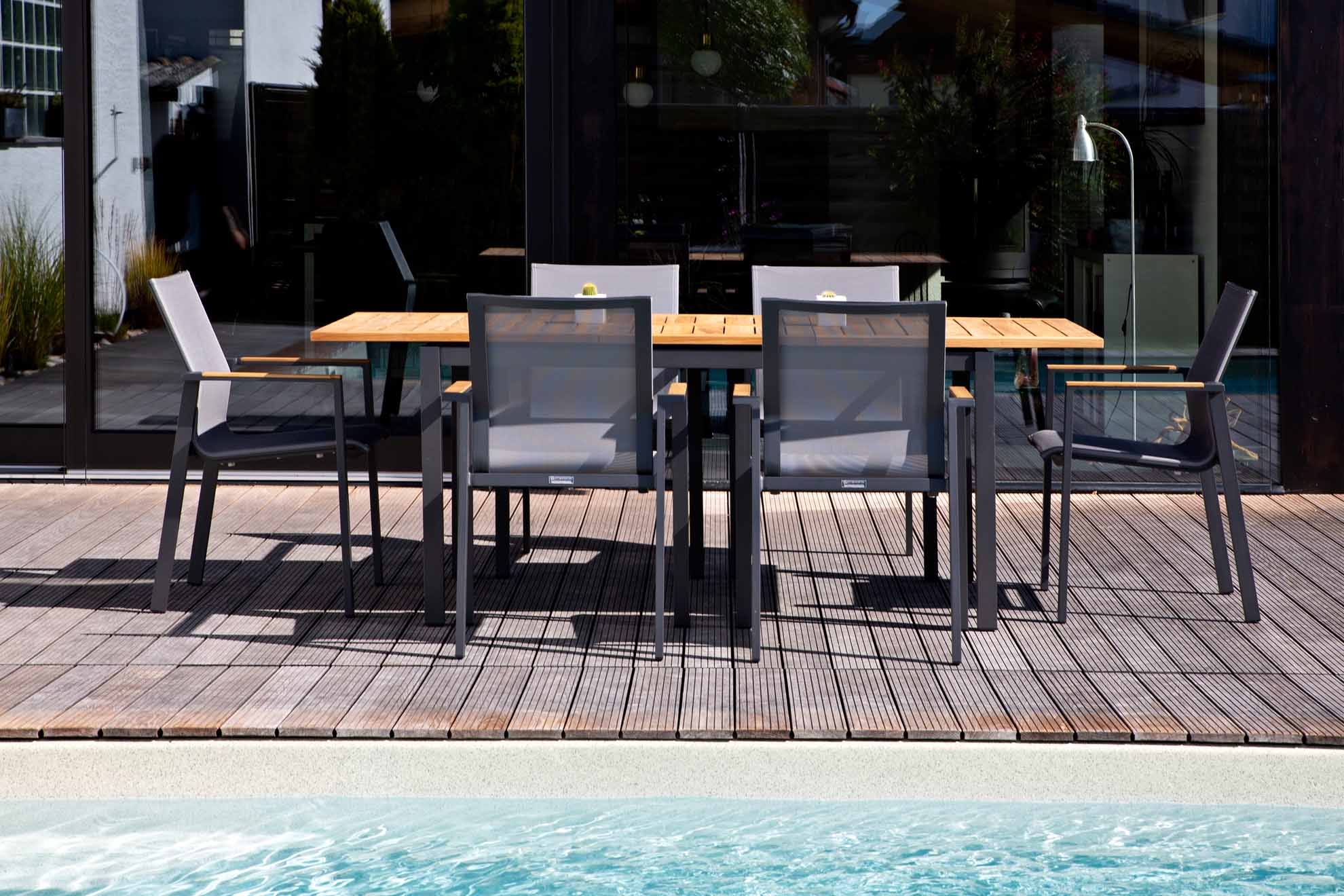 Wir verwenden ausschließlich Teakholz aus kontrolliertem Anbau. Teakholz gehört zu den wertvollsten Nutzhölzern der Welt. Ein hoher Kautschukgehalt bewirkt unter anderem eine starke Wasserabweisung. Das Holz widersteht nicht nur problemlos Nässe, Sonne, Frost und Temperaturschwankungen, sondern besitzt auch eine hohe Resistenz gegen Ungeziefer und Insekten. Teakholz ist zum Dauereinsatz im Freien besonders geeignet. Die meisten Teakmöbel werden naturbelassen geliefert. Im Laufe der Zeit bekommt das Holz durch Witterungseinflüsse eine silbergraue Patina.