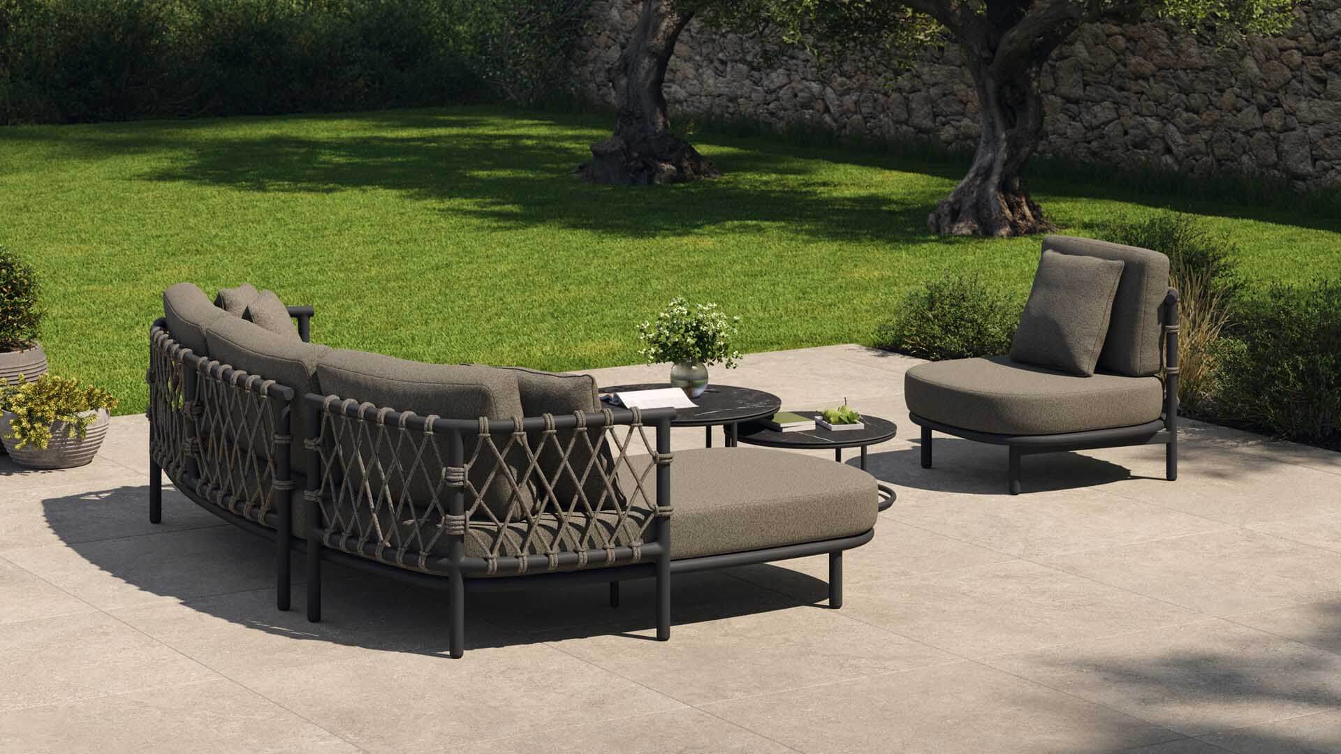 Das Mezzo Recamieren-Set rechts ergänzt die modulare Mezzo Kollektion von Jati & Kebon um ein großzügiges Loungeelement mit seitlichem Rope-Geflecht auf der rechten Seite. Das stabile Aluminiumgestell in eisengrau sorgt für langlebige Wetterbeständigkeit, während das kunststoffgeflecht in mocca dem Modul seine markante und zugleich warme Optik verleiht.