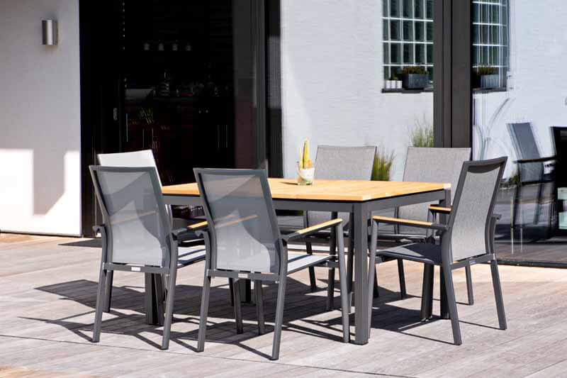 Wir verwenden ausschließlich Teakholz aus kontrolliertem Anbau. Teakholz gehört zu den wertvollsten Nutzhölzern der Welt. Ein hoher Kautschukgehalt bewirkt unter anderem eine starke Wasserabweisung. Das Holz widersteht nicht nur problemlos Nässe, Sonne, Frost und Temperaturschwankungen, sondern besitzt auch eine hohe Resistenz gegen Ungeziefer und Insekten. Teakholz ist zum Dauereinsatz im Freien besonders geeignet. Die meisten Teakmöbel werden naturbelassen geliefert. Im Laufe der Zeit bekommt das Holz durch Witterungseinflüsse eine silbergraue Patina.