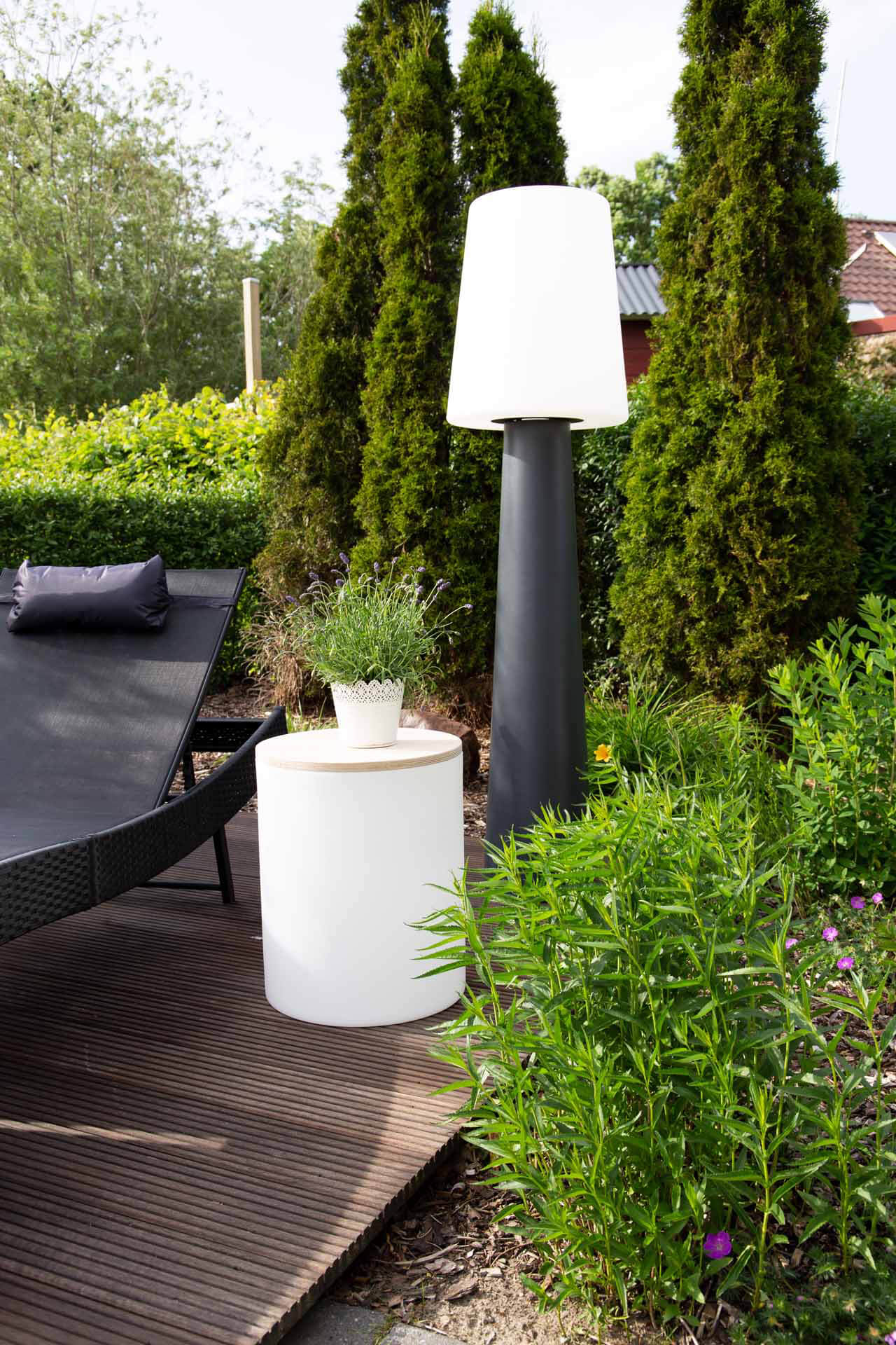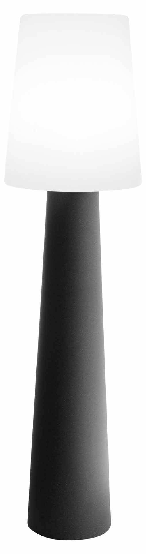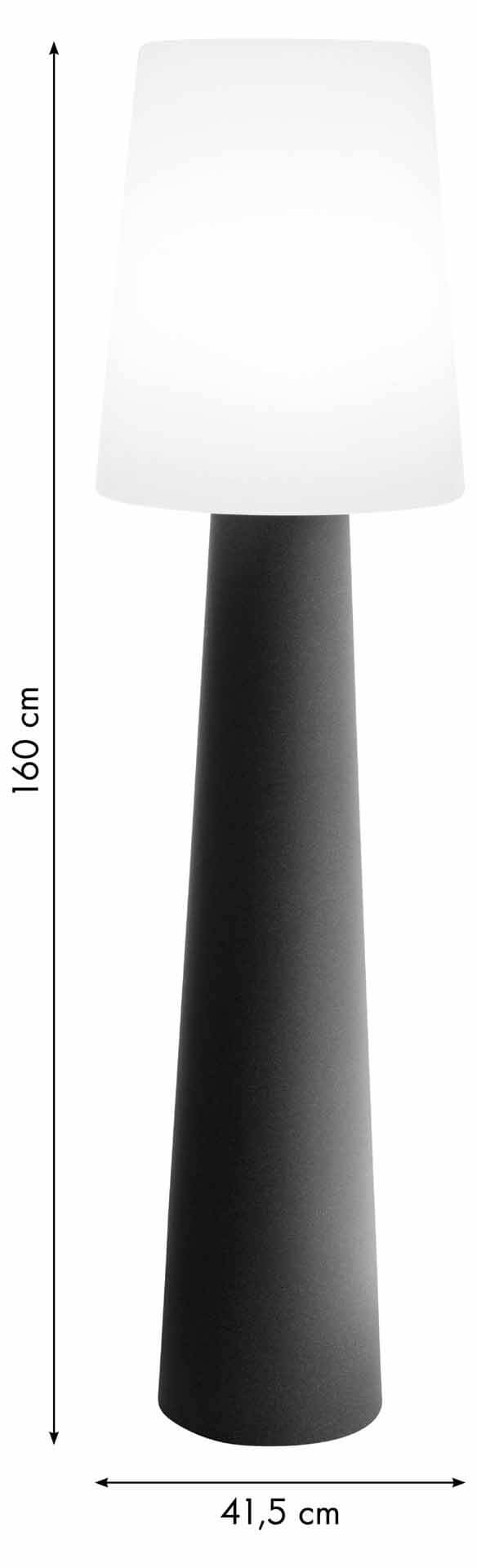 Die moderne Stehlampe No.1 in der Farbe anthrazit von 8Seasons ist sowohl im Außenbereich als auch im Innenbereich verwendbar. Durch ihre Höhe von 160cm ist sie ein außergewöhnlicher Blickfang. Die in Deutschland hergestellte Leuchte hat eine E27 Fassung inklusive RGB Leuchtmittel und besteht aus hochbelastbarem Polyethylen. Das macht sie robust gegenüber Sonne, Regenwetter oder Kälte. Mit der Stehlampe No.1 setzen sie Akzente und sorgen für ein stilvolles Ambiente im Garten oder auf Ihrer Terrasse. Je nach Geschmack lassen sich mit der Fernbedienung die Farben wechseln. Die Leuchte No.1 ist netzbetrieben, die Kabellänge beträgt 235cm. Eine Fernbedienung ist im Lieferumfang enthalten.