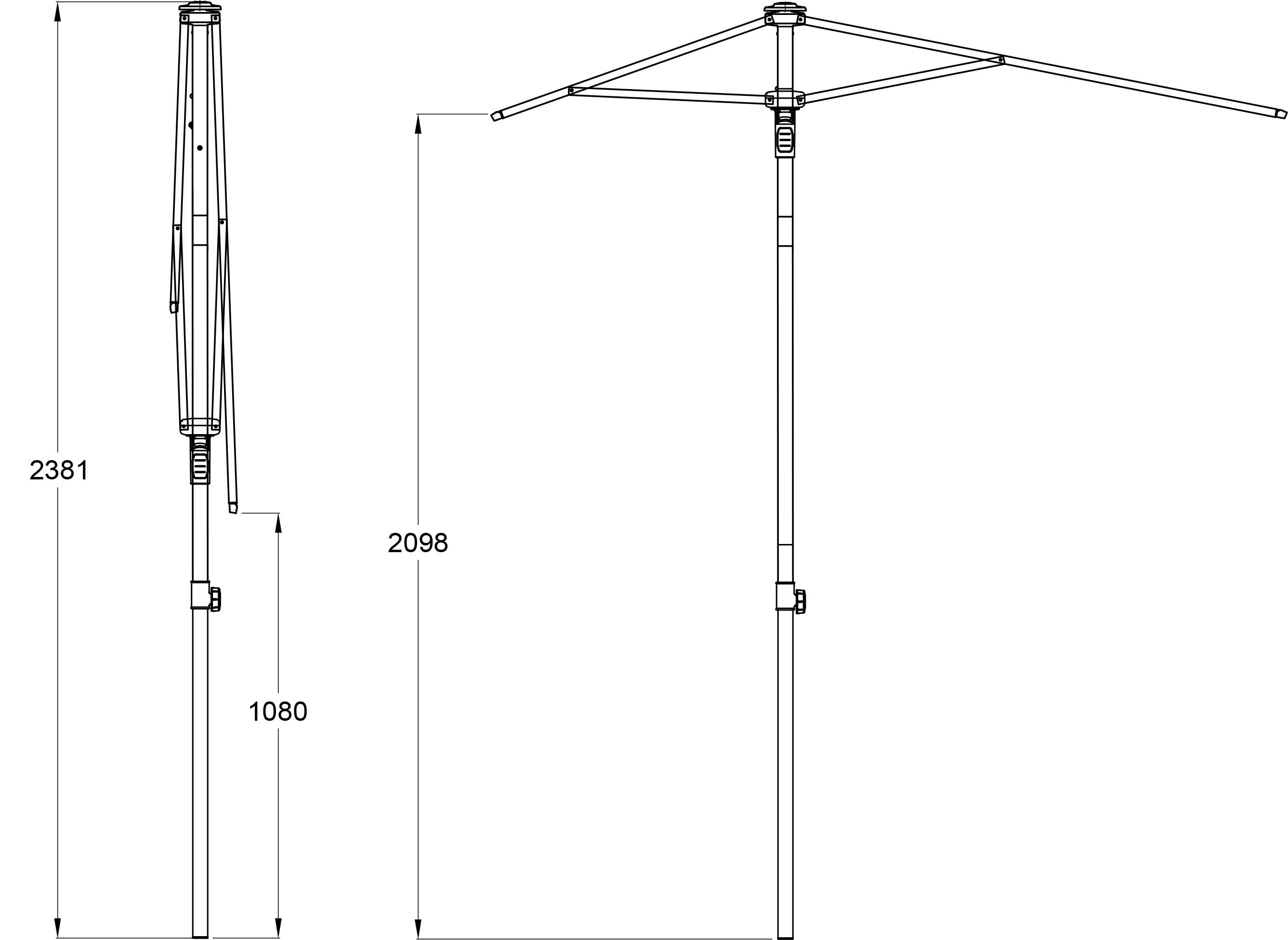 UNO: Pulverbeschichtetes Aluminium, Streben 14×20 mm, selbstspannende Strebenenden für ein dauerhaft straffes Schirmdach.