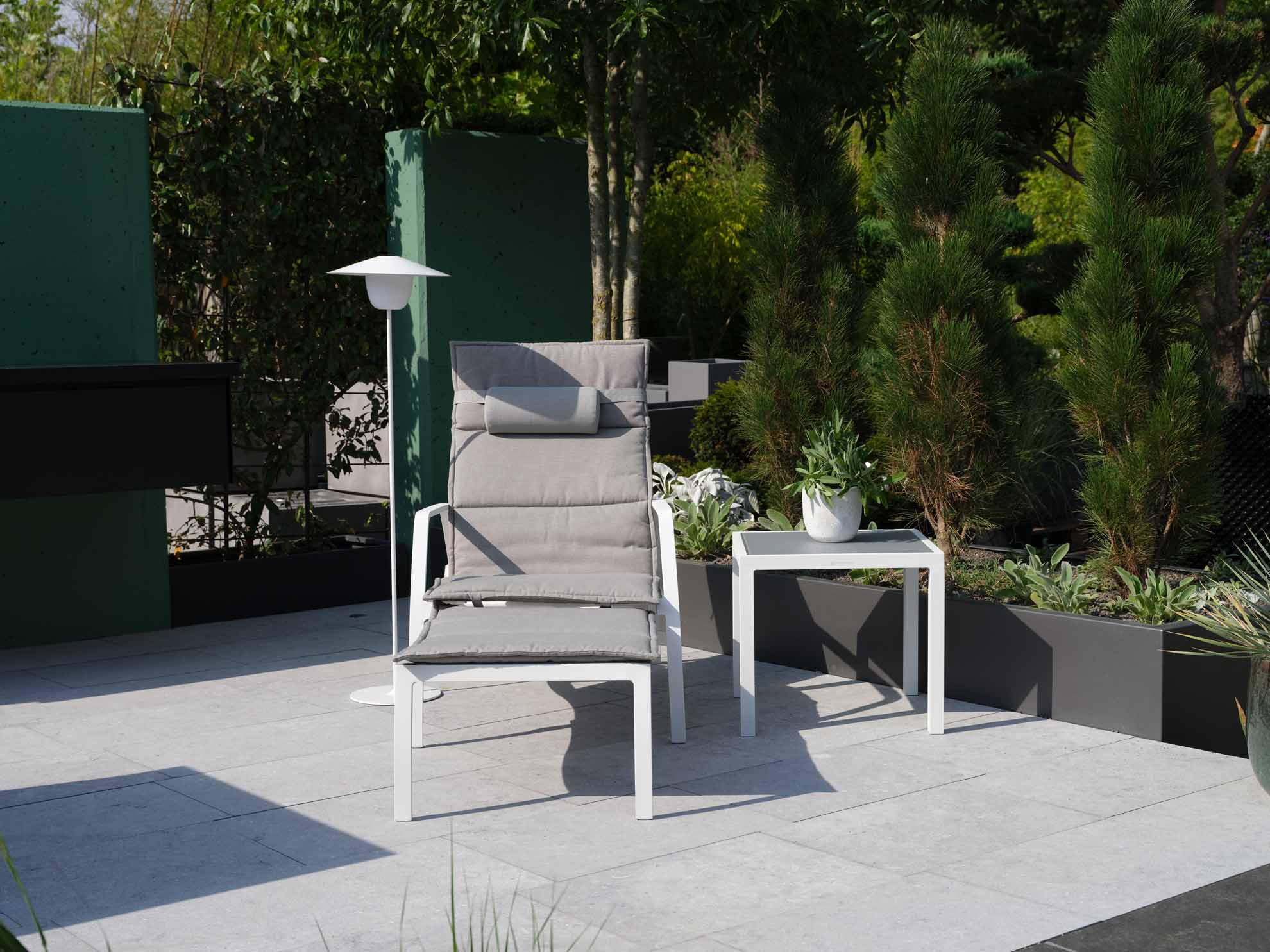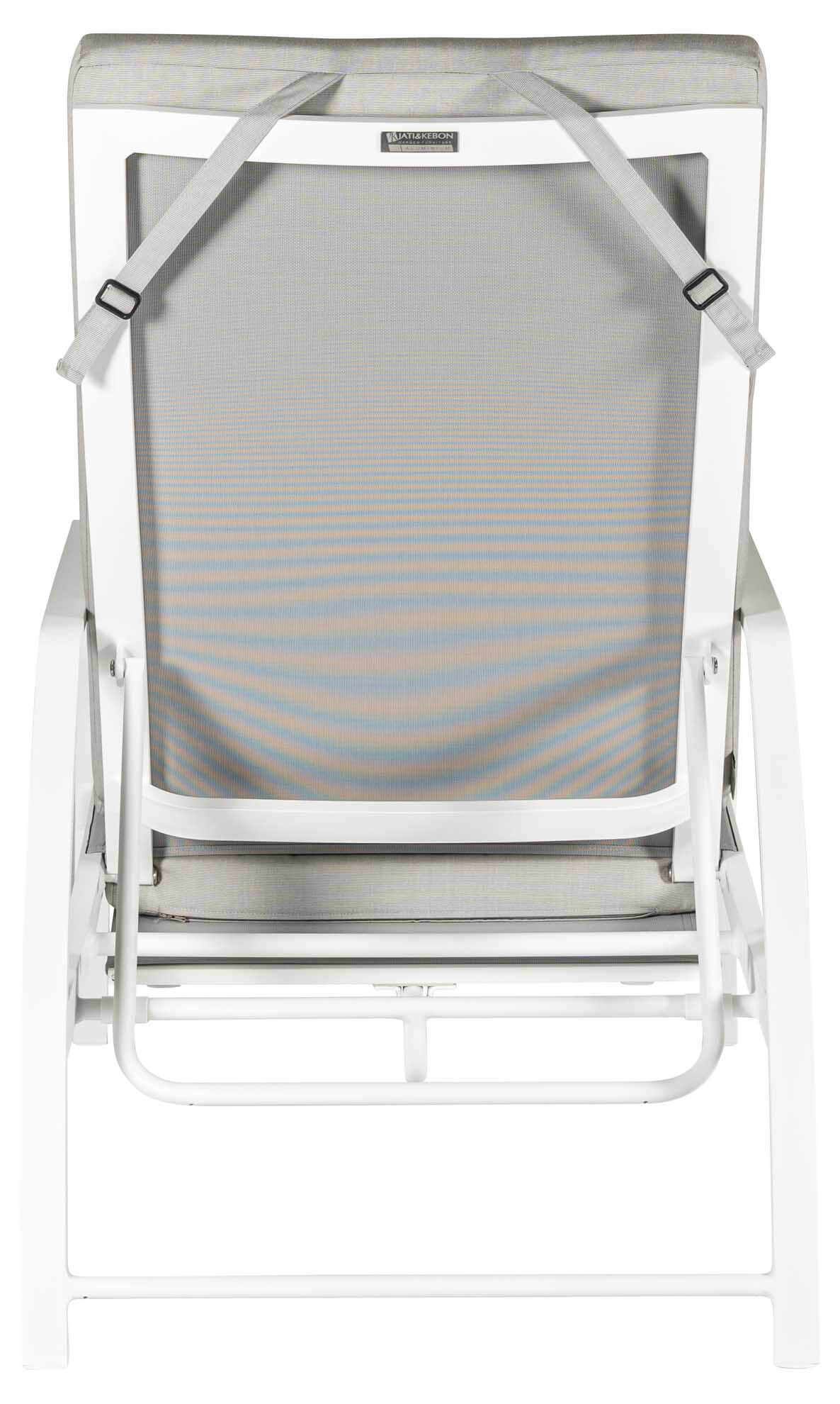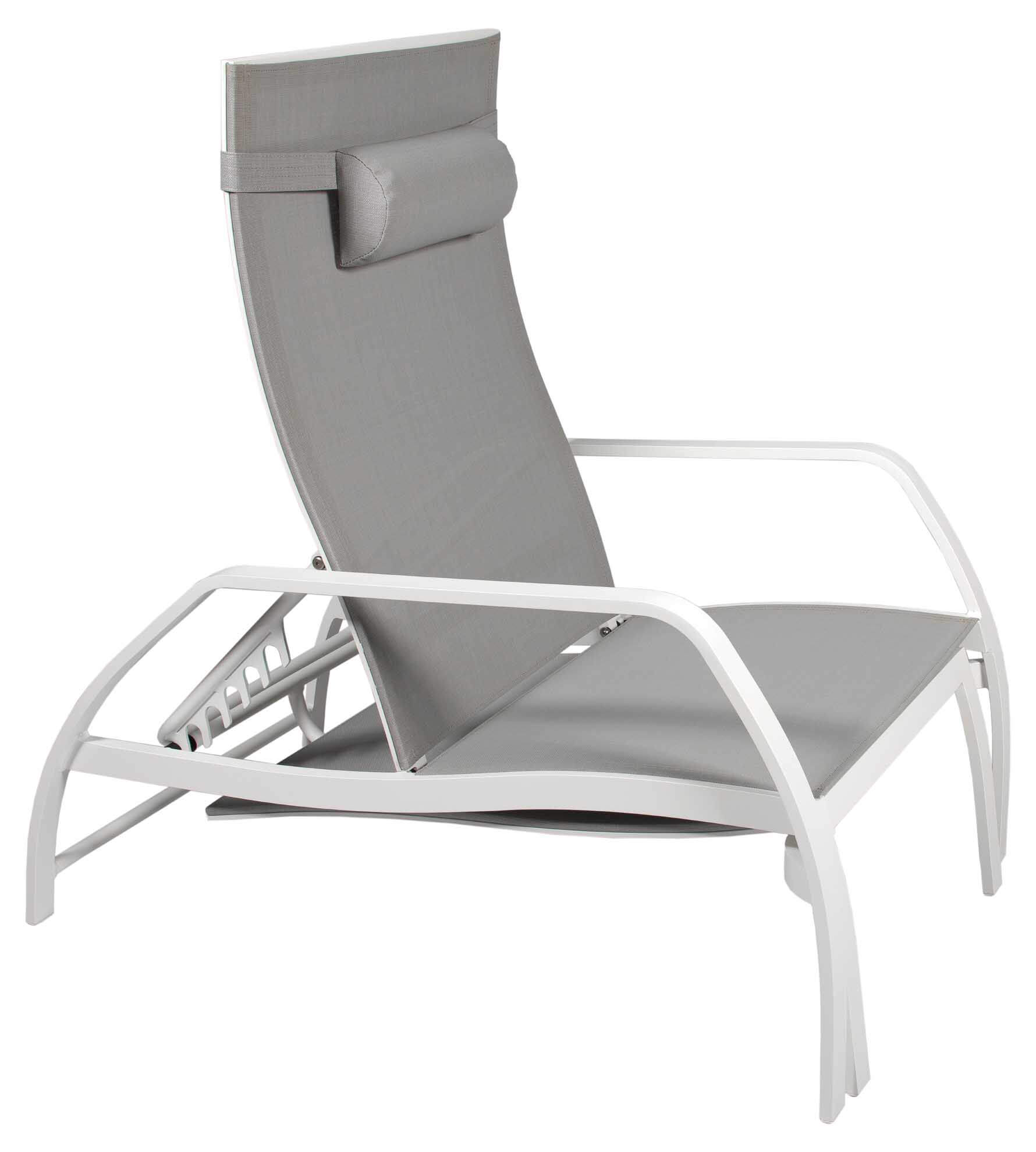 Deckchair Vedia von Jati&Kebon aus Aluminium mit verstellbarem Rückenteil und ausziehbarem Fußteil. Gestell eisengrau matt pulverbeschichtet, Jatex-Bespannung silbergrau.