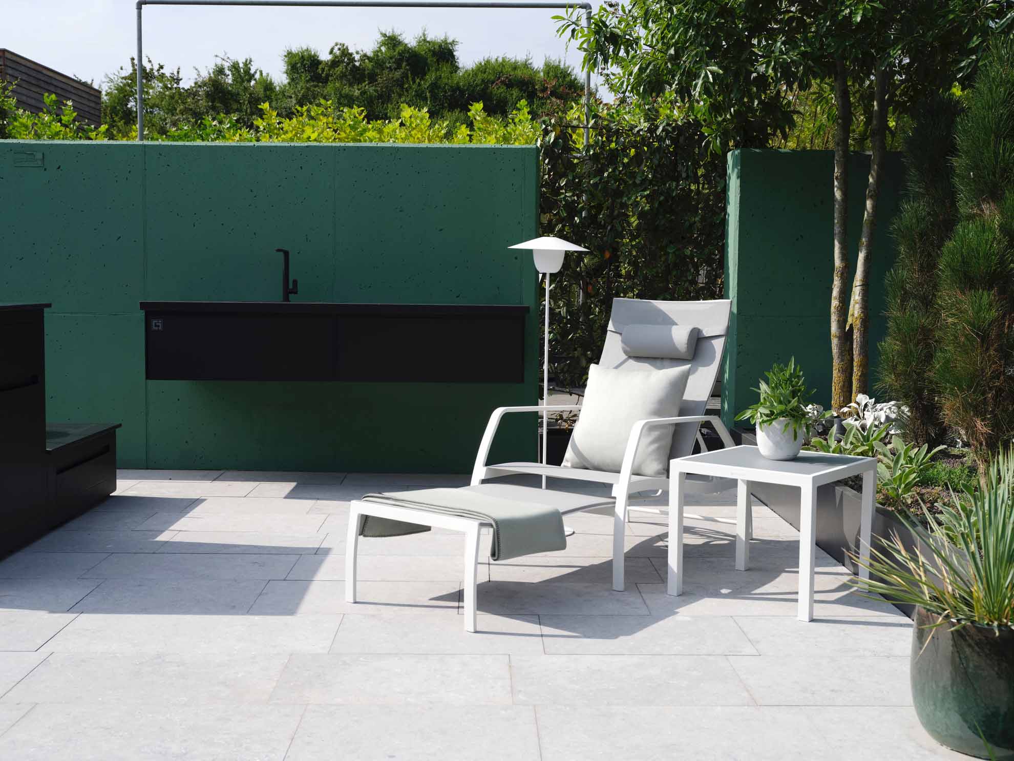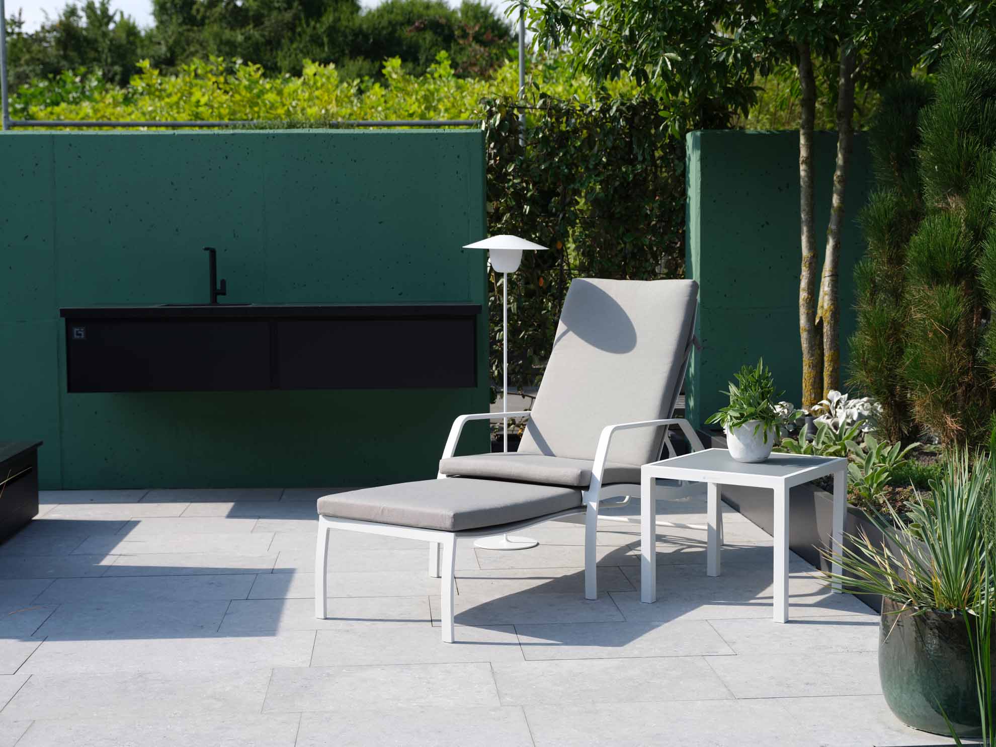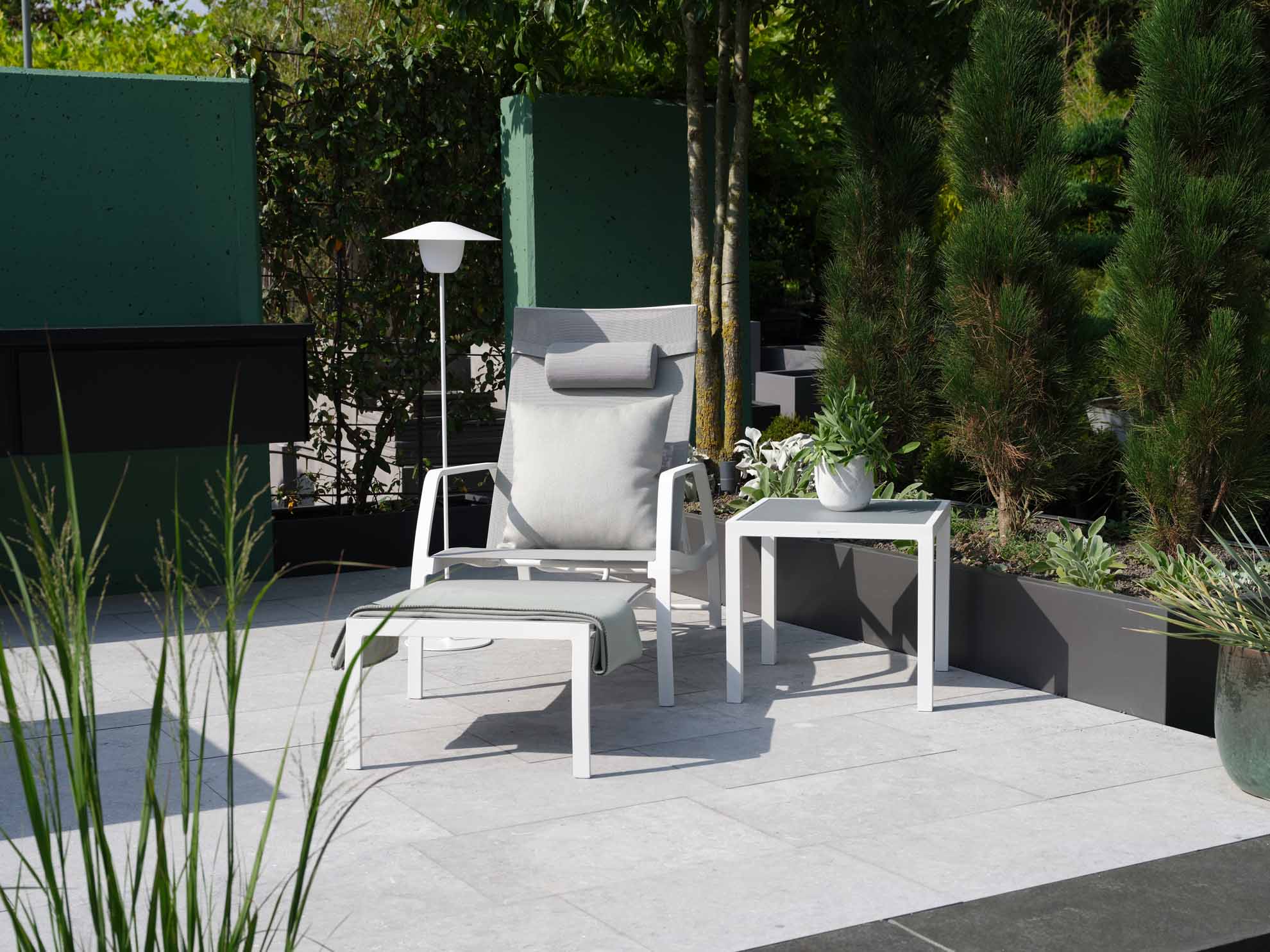 Deckchair Vedia von Jati&Kebon aus Aluminium mit verstellbarem Rückenteil und ausziehbarem Fußteil. Gestell eisengrau matt pulverbeschichtet, Jatex-Bespannung silbergrau.