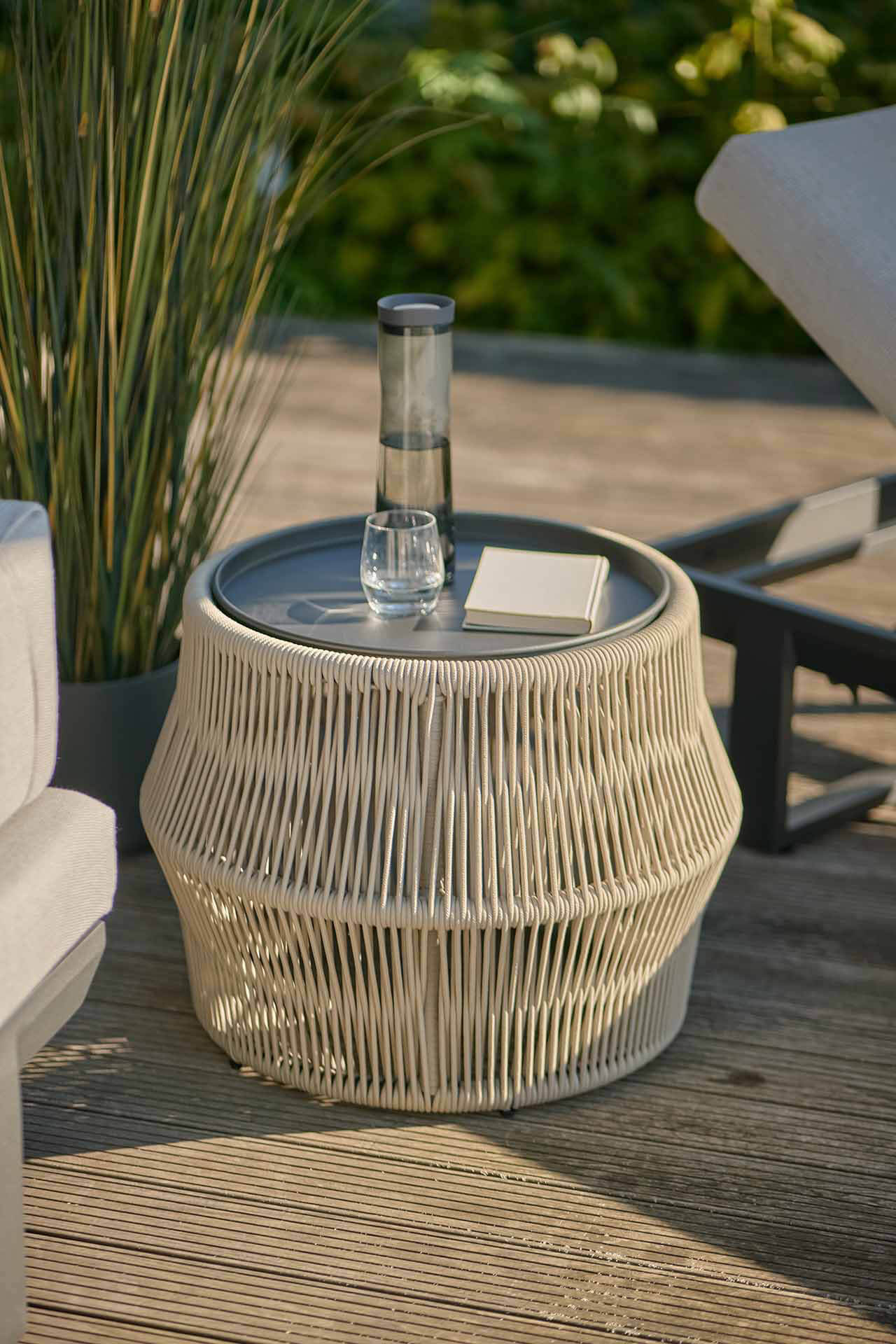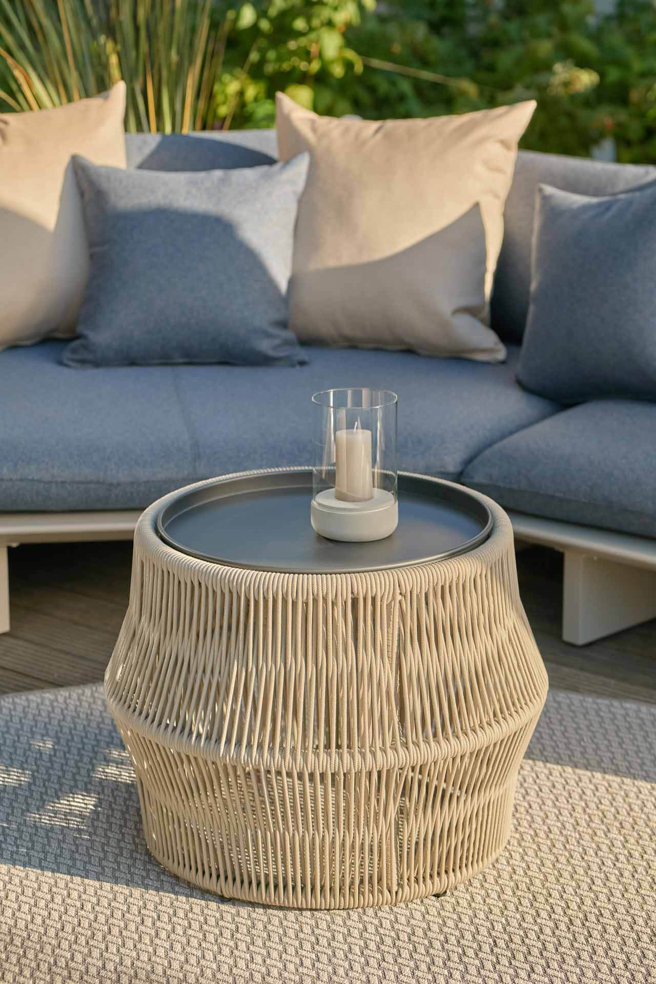 Das Gestell und die Platte des Beistelltisches Chaco überzeugen durch ihre eisengrau-matte Farbgebung. Das Seilgeflecht in Straight Weave in der sanften Unifarbe beige setzt dezente Akzente und schafft eine harmonische Atmosphäre.