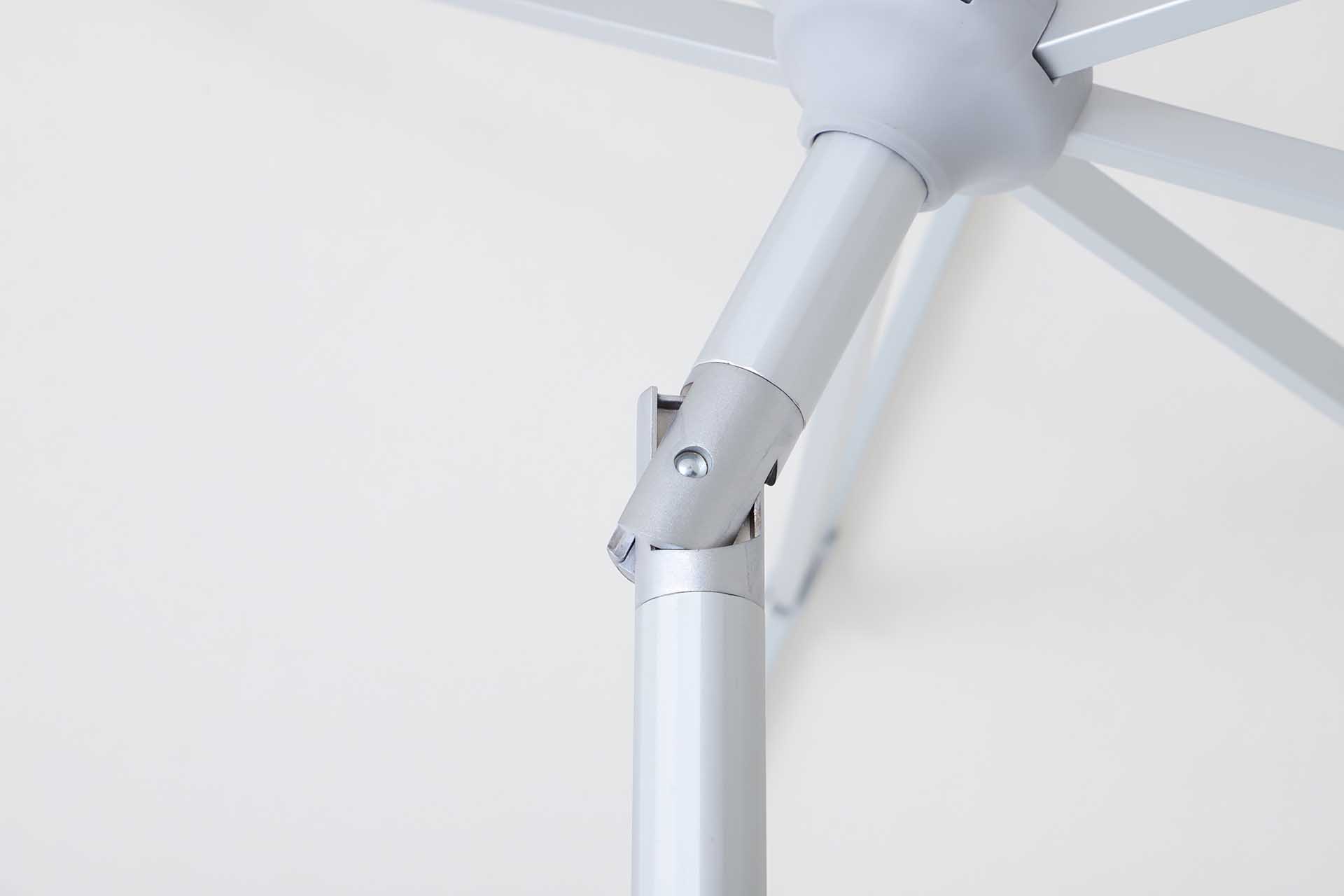 Der Komfort beginnt bereits beim Öffnen: Der Schirm verfügt über eine Kurbelmechanik, mit der sich das Dach bequem und sicher öffnen lässt. Zusätzlich bietet er einen Knickmechanismus, der über ein Drehrad oberhalb der Kurbel stufenlos einstellbar ist — so lässt sich das Schirmdach optimal zur Sonnenlage ausrichten.