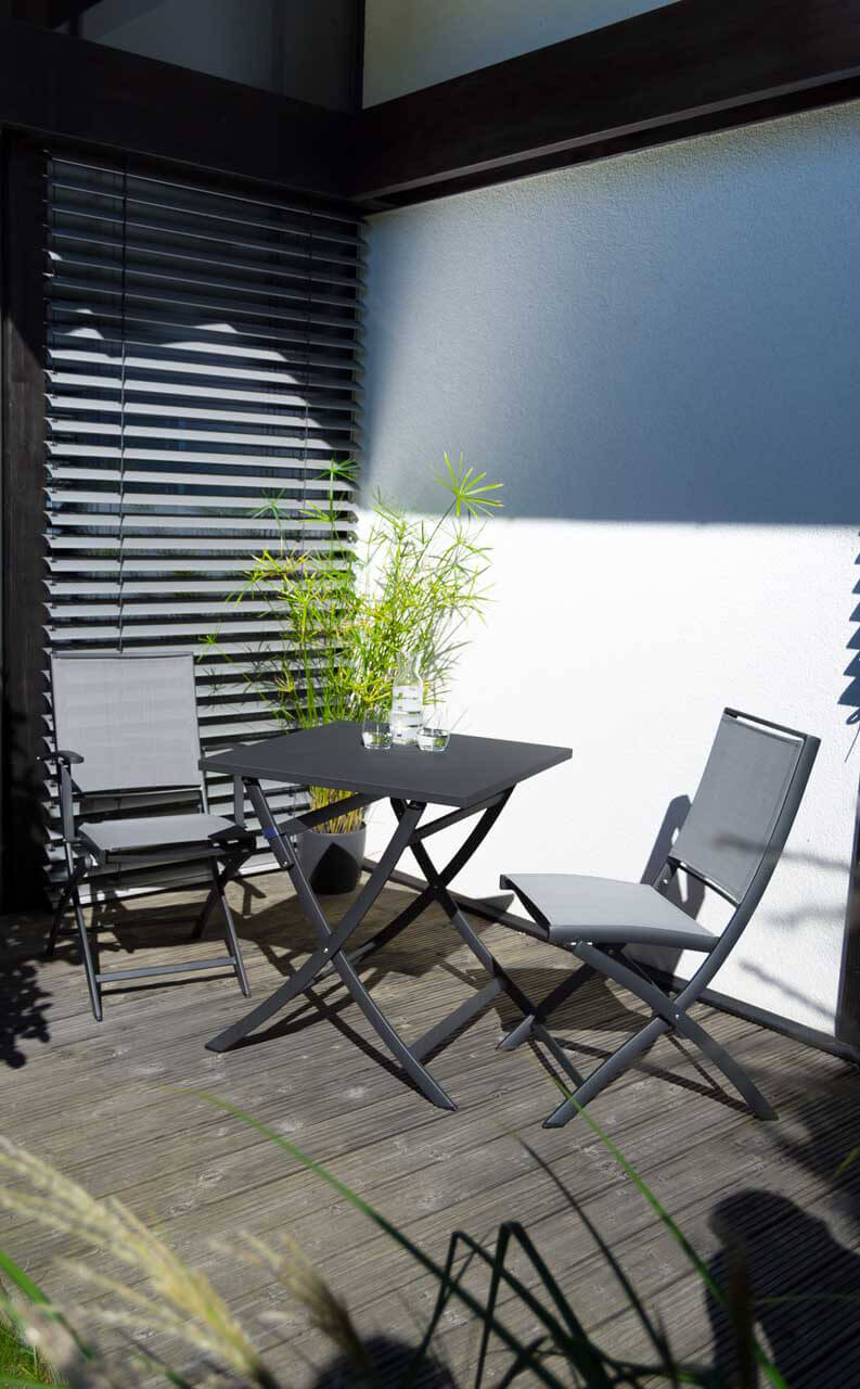 Der Feodal Klappstuhl von Jati & Kebon hat ein pulverbeschichtetes Aluminiumgestell in "eisengrau" und eine Bespannung aus Jatex Gewebe in "silbergrau". Diese beiden Materialien sind wetterfest und eignen sich hervorragend für die Nutzung im Garten oder auf der Terrasse. Auch im Haus kann dieser Klappstuhl natürlich zu Esstischen genutzt werden. Für ein bequemes Sitzgefühl ist dieses Modell mit Armlehnen ausgestattet.