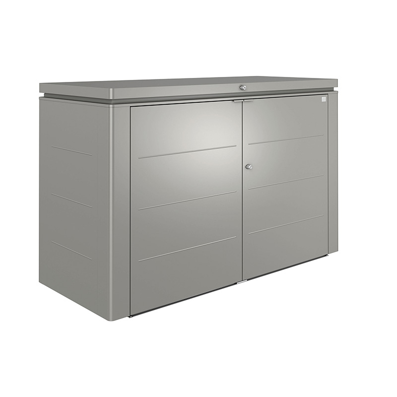 Die Einsatzmöglichkeiten des HighBoard 200 von Biohort sind dank Flügeltüren und Deckelöffnung vielfältig: ob als Stauraum für Kissen, Gartenutensilien oder als ideale Ergänzung zu Ihrer Outdoor-Küche - alles ist witterungsgeschützt und ordentlich verstaut. Die edle Optik ist garantiert ein Highlight auf jeder Terrasse. Eine integrierte, unsichtbare Durchlüftung und die absolute Dichtheit gegen Regenwasser schützen den Inhalt sicher und zuverlässig. Der Deckel sowie die Türen schließen mittels Gasdruckfeder und ein Drehknebel Zylinderschloß schützt vor ungewollter Öffnung oder Diebstahl. Die Maße des Highboard Gartenschrankes sind 200x84x127cm. Die hochwertige Oberfläche wird mittels einer Polyamid-Einbrennlackierung erstellt. Die Farbe der Box ist dunkelgrau-metallic. Bei dieser Größe (200cm) kann der Highboard Gartenschrank auch als Fahrradgarage oder Mülltonnenbox genutzt werden.