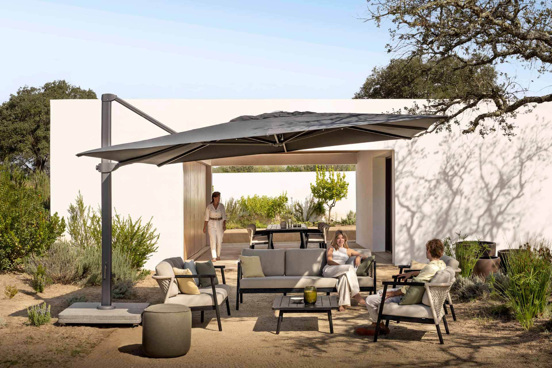 Dieser mehrteilige Schirmsockel für den Sonnenschirm LIMA von Jardinico hat ein Gesamtgewicht von 300kg. Auf der Grundplatte sind zwei zusätzliche Gewichtplatten aus Granit angebracht. Die Zusatzplatten sind mit Griffmulden versehen, um den Transport und das Aufstellen zu erleichtern. Die feststellbaren Rollen zum bequemen Verschieben des Schirms sind im Lieferumfang enthalten. Abmessungen des Sockels: 100x100x10cm (ohne Rollen).