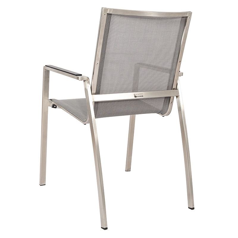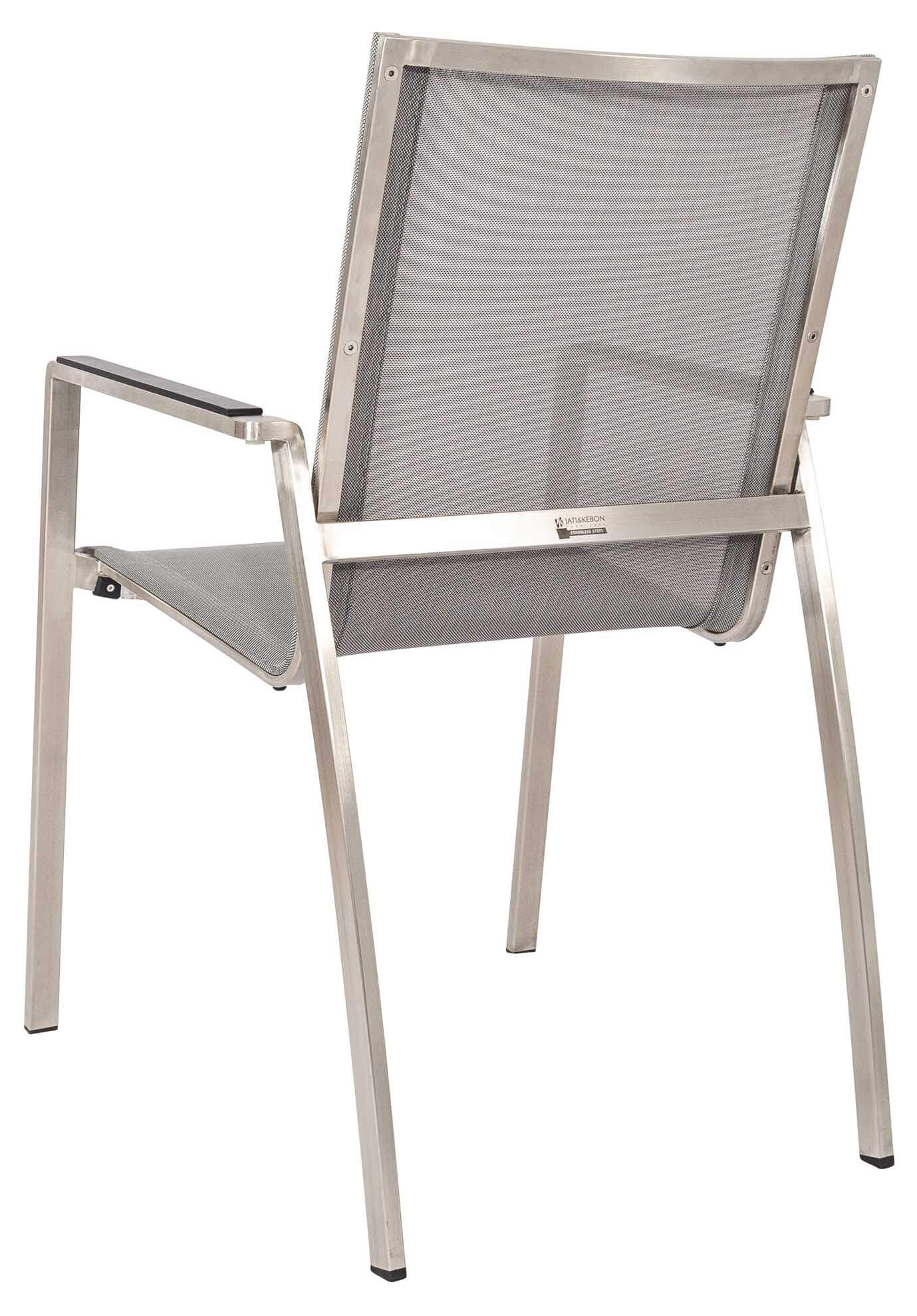 Monaco Stapelsessel aus Edelstahl von Jato & Kebon. Gestell gebürstet, Bespannung aus Jatex-Gewebe in silbergrau. Armlehnen aus Aluminium schwarz pulverbeschichtet.
