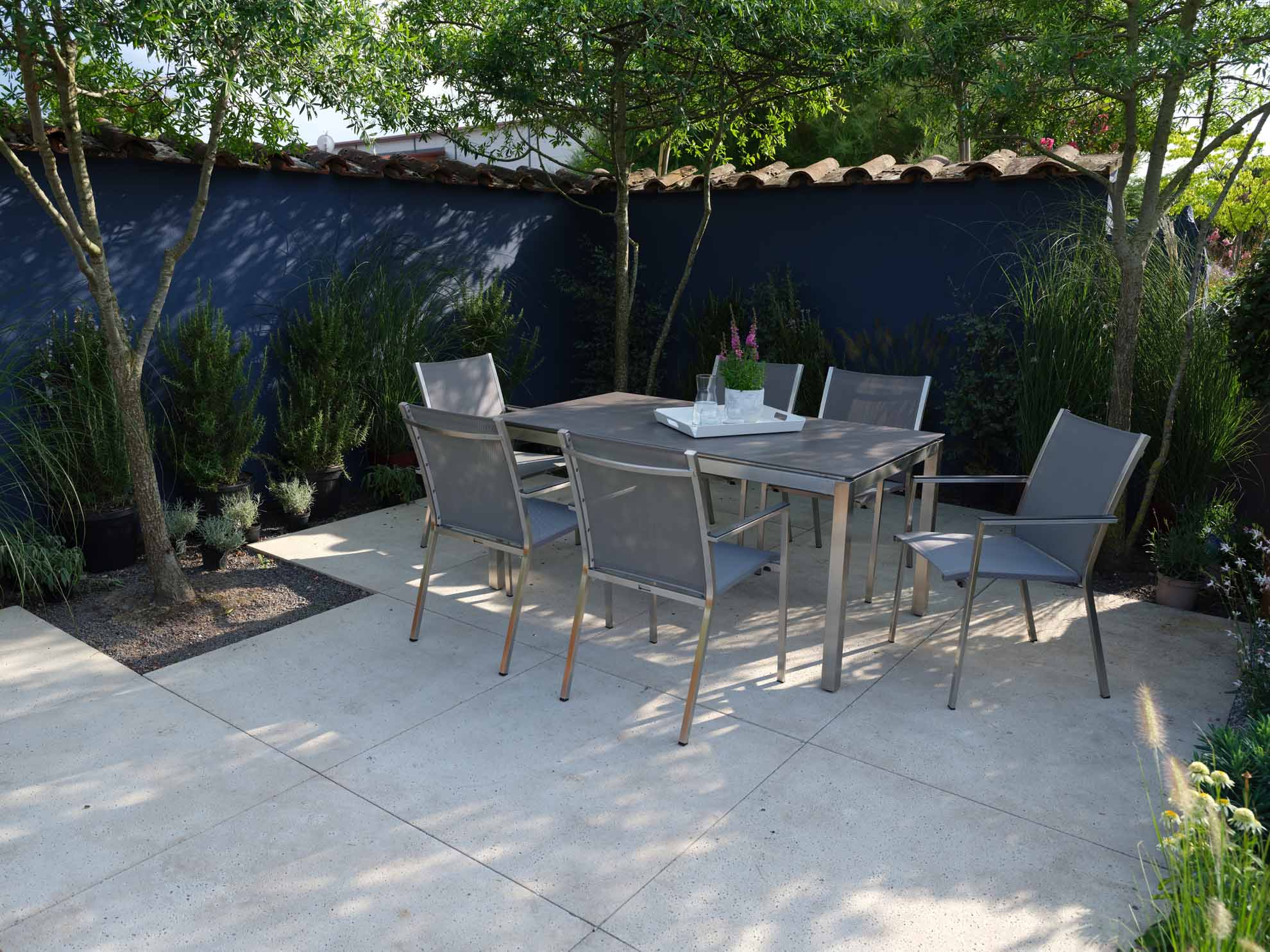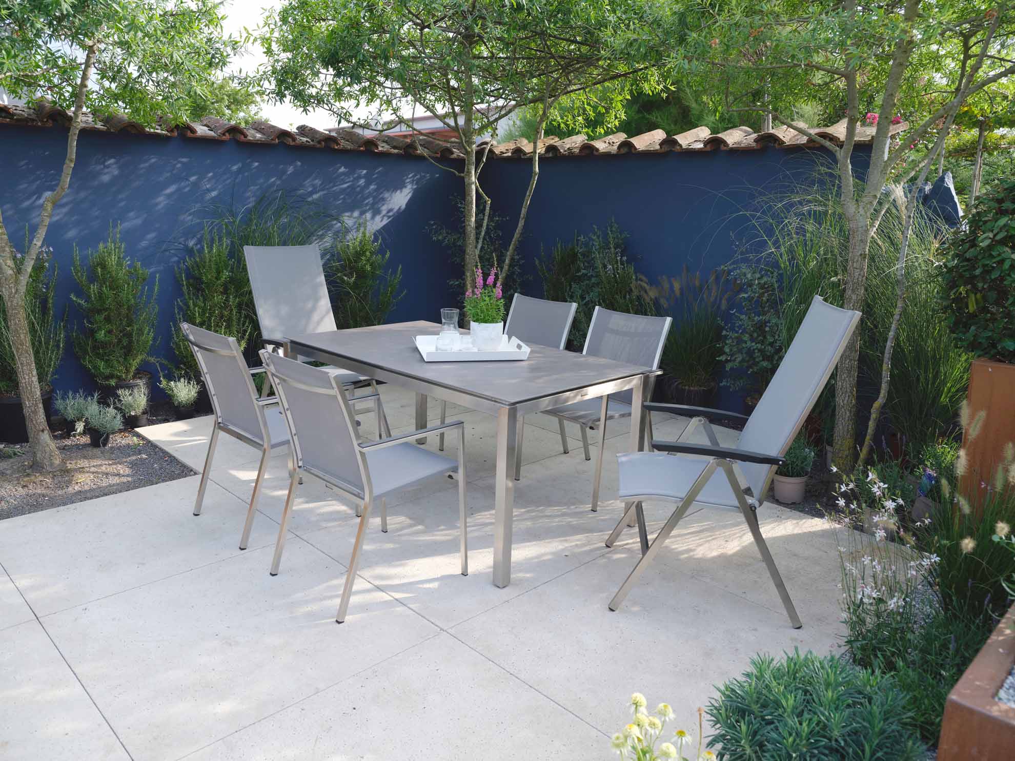 Gartenmöbel aus Edelstahl sind nicht nur wetterbeständig, sondern auch äußerst strapazierfähig. Das Material ist sehr stabil, deshalb können Edelstahl-Gartenmöbel mit viel kleineren Profilen hergestellt werden und wirken deutlich filigraner als andere Materialien. Die gebürstete Oberfläche verleiht dem Möbelstück eine exklusive Anmutung. Edelstahl ist unempfindlich gegen Schäden durch Anstoßen und Verkratzen, da die Oberfläche nicht lackiert ist. Kleine Beschädigungen können einfach mit einem metallfreien Reinigungsvlies bearbeitet werden. Die Edelstahl-Gartenmöbel in unserem Sortiment sind nicht für den Einsatz in Hallenbädern oder in Küstennähe am Meer geeignet!