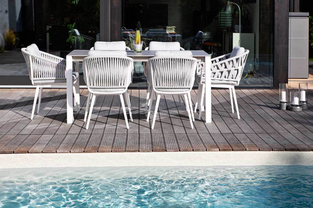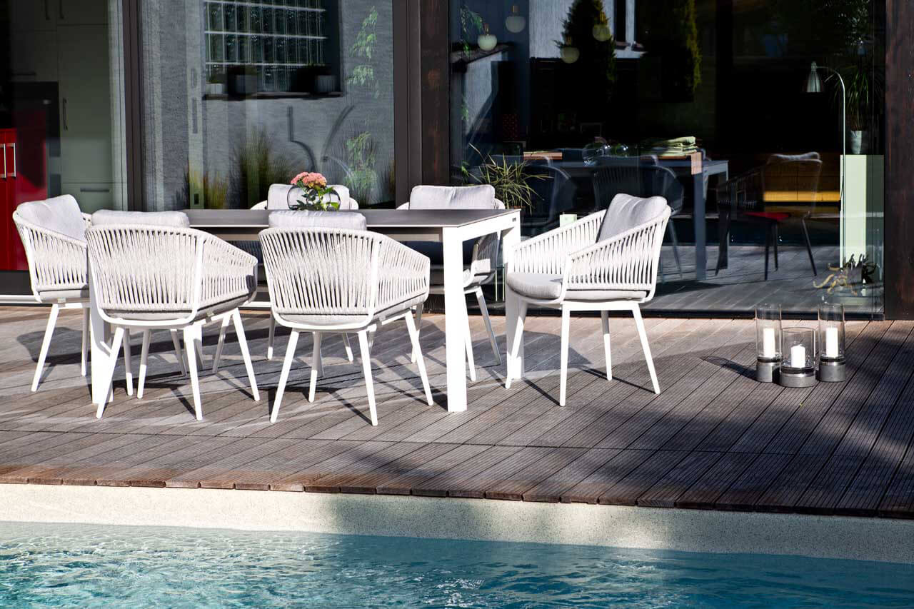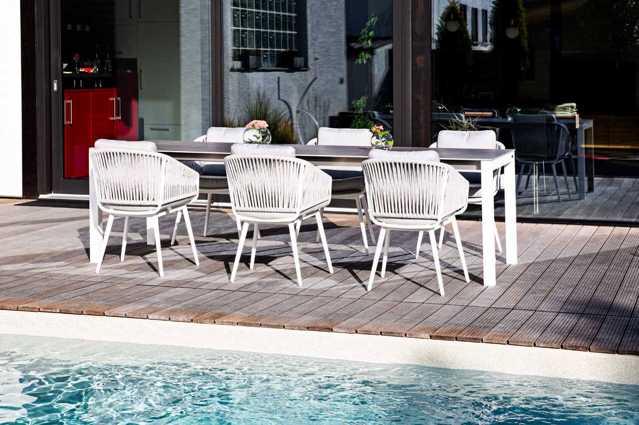 Seilmöbel - Qualitätsfasern mit natürlichem Aussehen. Die Polyolefinfaser hat ein natürliches Aussehen, ist jedoch pflegeleicht und unempfindlich gegen die Kräfte von Mutter Natur. Das Seil ist sowohl für den Innen- als auch für den Außenbereich geeignet. Wie keine andere synthetische oder natürliche Faser ist sie resistent gegen Pilze, Bakterien, Sonnenlicht, Feuchtigkeit, Chlor, Lebensmittelflecken und Schweiß. Es ist extrem leicht, waschbar, umweltfreundlich und vollständig recycelbar. Kombinieren Sie die Sitze und Stühle aus Rope-Geflecht mit maßgeschneiderten, wetterbeständigen Kissen.