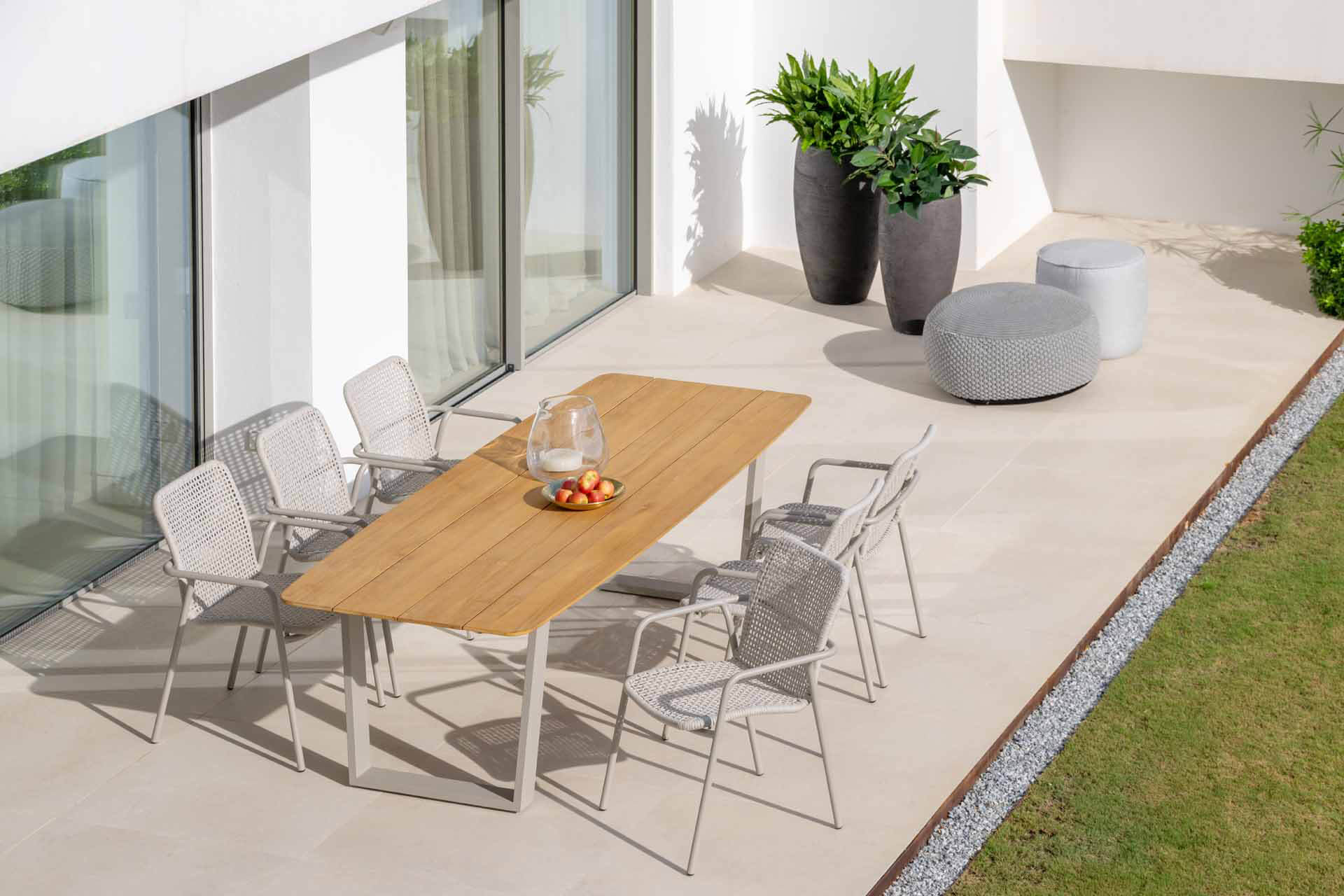 Seilmöbel - Qualitätsfasern mit natürlichem Aussehen. Die Polyolefinfaser hat ein natürliches Aussehen, ist jedoch pflegeleicht und unempfindlich gegen die Kräfte von Mutter Natur. Das Seil ist sowohl für den Innen- als auch für den Außenbereich geeignet. Wie keine andere synthetische oder natürliche Faser ist sie resistent gegen Pilze, Bakterien, Sonnenlicht, Feuchtigkeit, Chlor, Lebensmittelflecken und Schweiß. Es ist extrem leicht, waschbar, umweltfreundlich und vollständig recycelbar. Kombinieren Sie die Sitze und Stühle aus Rope-Geflecht mit maßgeschneiderten, wetterbeständigen Kissen.