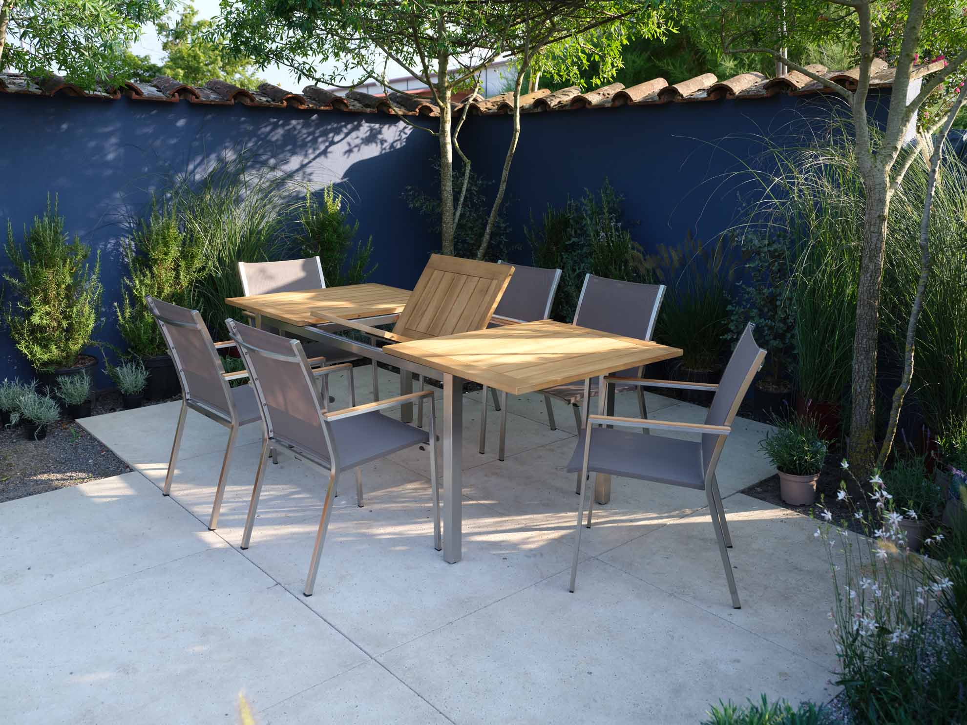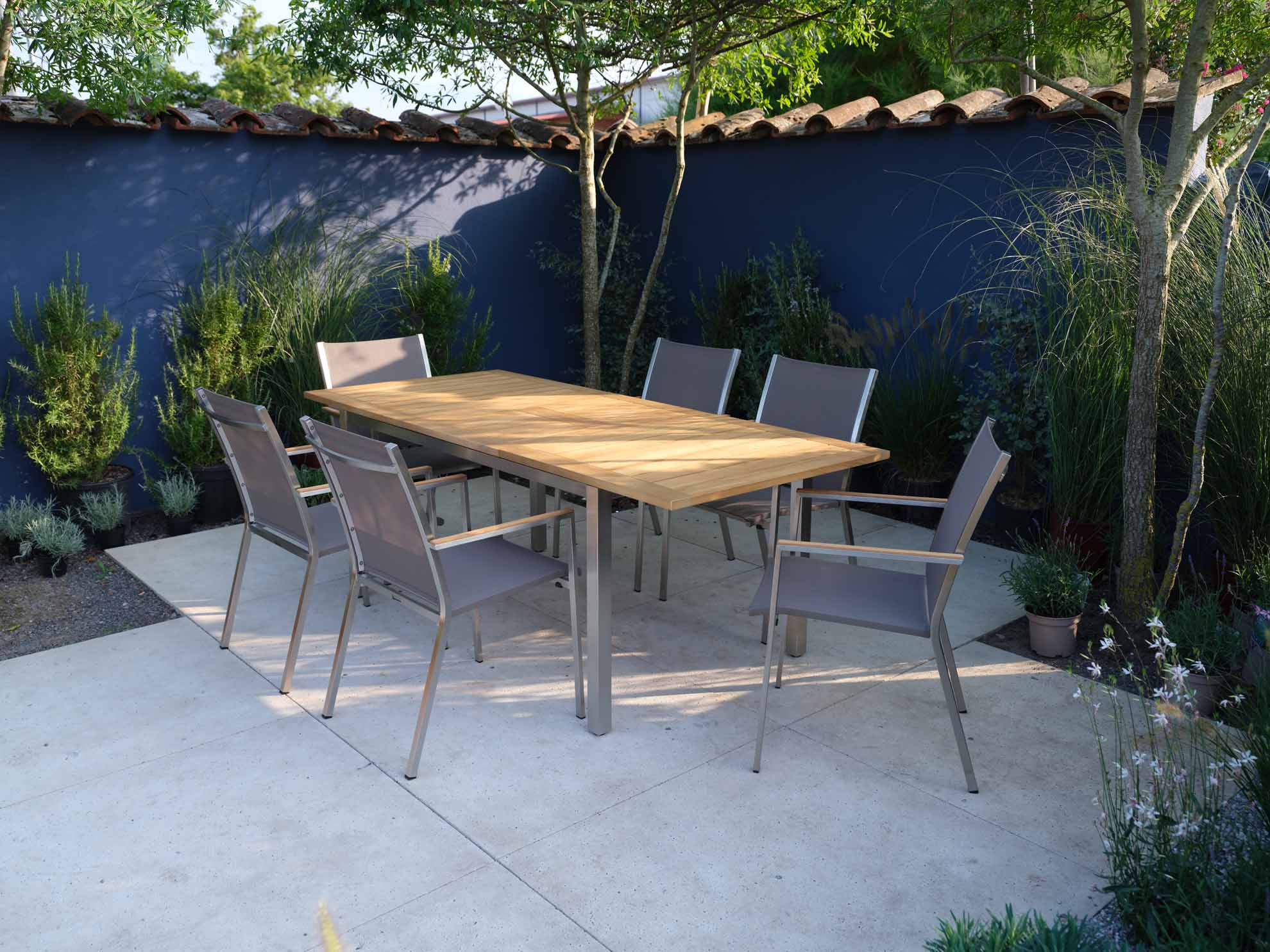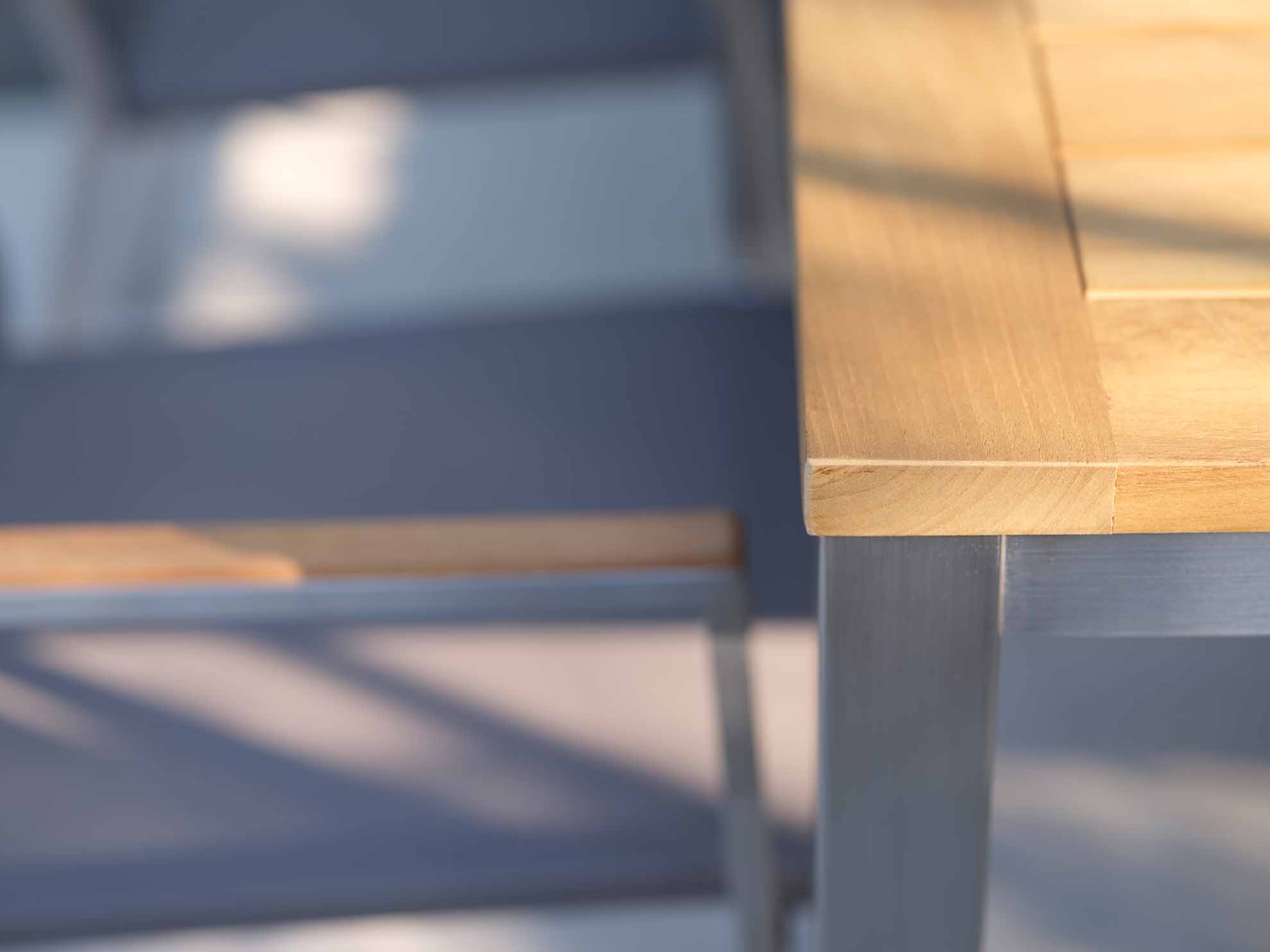 Wir verwenden ausschließlich Teakholz aus kontrolliertem Anbau. Teakholz gehört zu den wertvollsten Nutzhölzern der Welt. Ein hoher Kautschukgehalt bewirkt unter anderem eine starke Wasserabweisung. Das Holz widersteht nicht nur problemlos Nässe, Sonne, Frost und Temperaturschwankungen, sondern besitzt auch eine hohe Resistenz gegen Ungeziefer und Insekten. Teakholz ist zum Dauereinsatz im Freien besonders geeignet. Die meisten Teakmöbel werden naturbelassen geliefert. Im Laufe der Zeit bekommt das Holz durch Witterungseinflüsse eine silbergraue Patina.