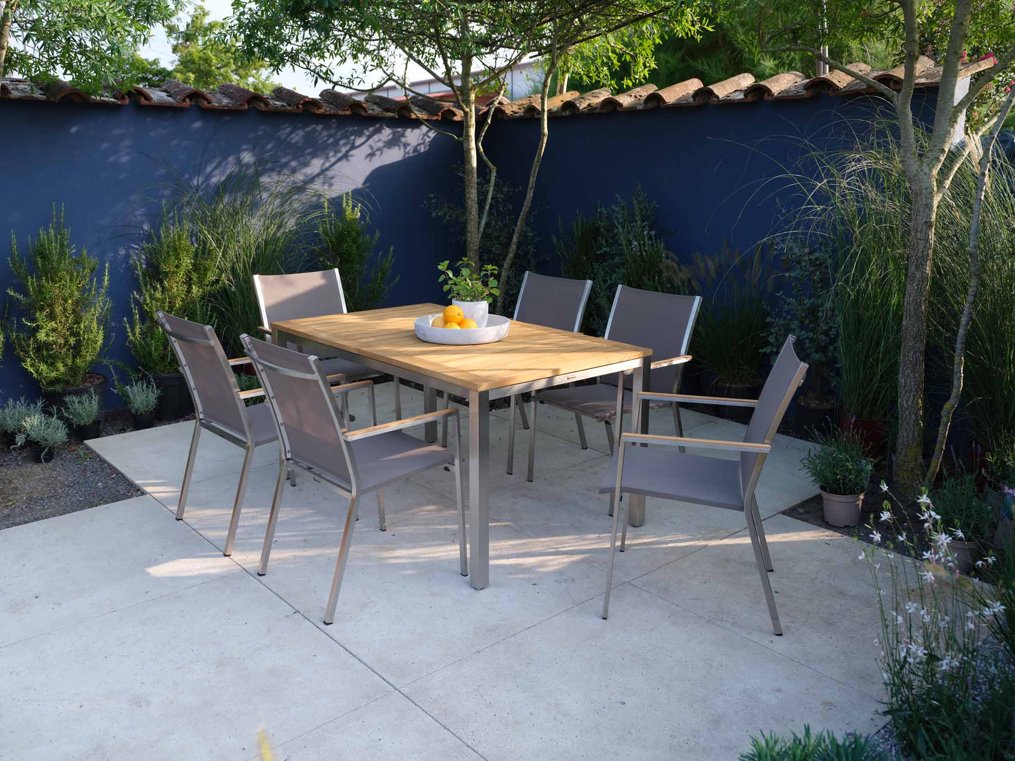 Gartenmöbel aus Edelstahl sind nicht nur wetterbeständig, sondern auch äußerst strapazierfähig. Das Material ist sehr stabil, deshalb können Edelstahl-Gartenmöbel mit viel kleineren Profilen hergestellt werden und wirken deutlich filigraner als andere Materialien. Die gebürstete Oberfläche verleiht dem Möbelstück eine exklusive Anmutung. Edelstahl ist unempfindlich gegen Schäden durch Anstoßen und Verkratzen, da die Oberfläche nicht lackiert ist. Kleine Beschädigungen können einfach mit einem metallfreien Reinigungsvlies bearbeitet werden. Die Edelstahl-Gartenmöbel in unserem Sortiment sind nicht für den Einsatz in Hallenbädern oder in Küstennähe am Meer geeignet!