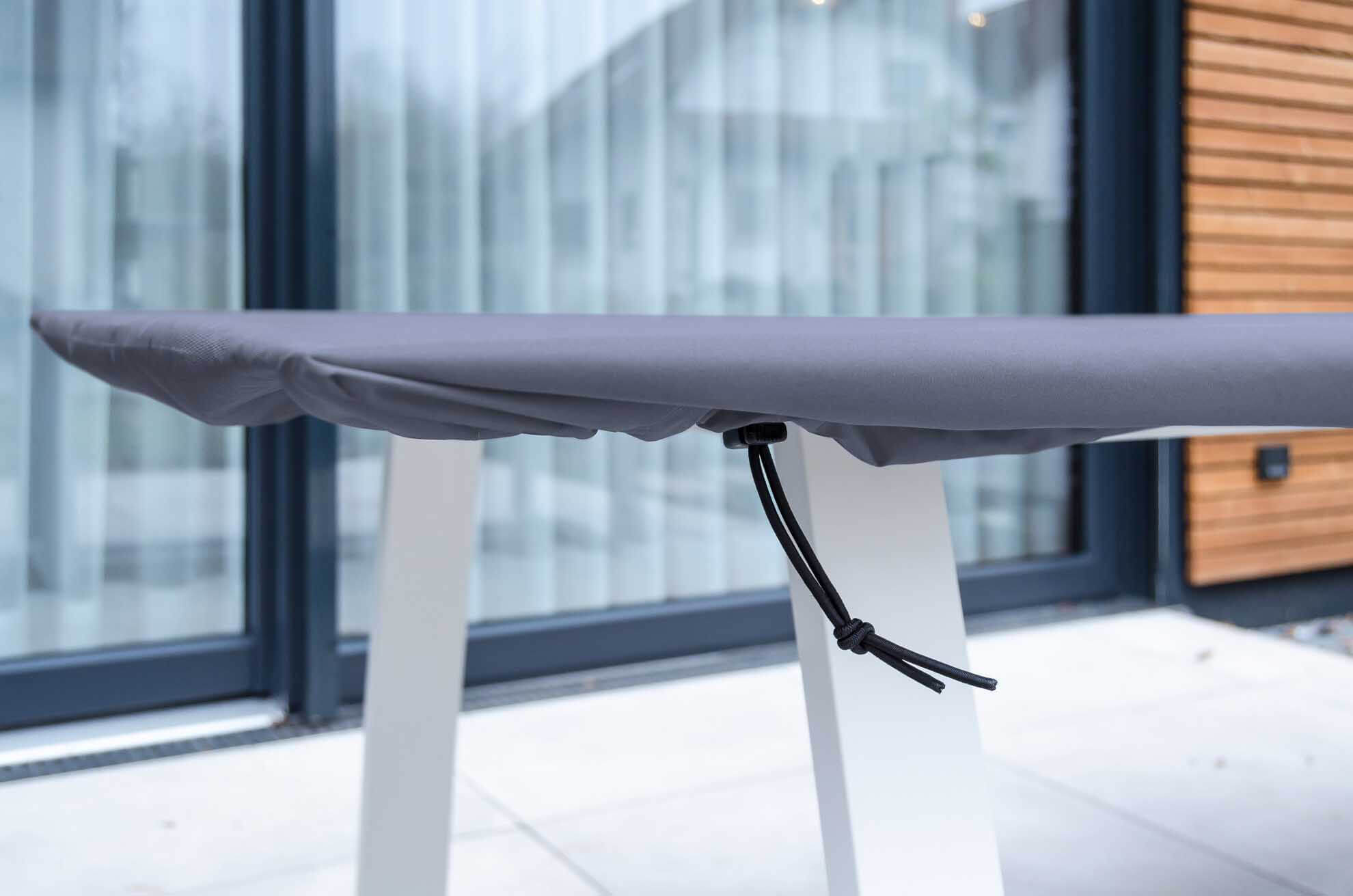 - Stellen Sie sicher, dass die Gartenmöbel vollständig trocken sind, bevor Sie die Schutzhülle anbringen. Feuchtigkeit, die bereits vorhanden ist, kann unter der Hülle eingeschlossen werden und zu Kondensation führen.