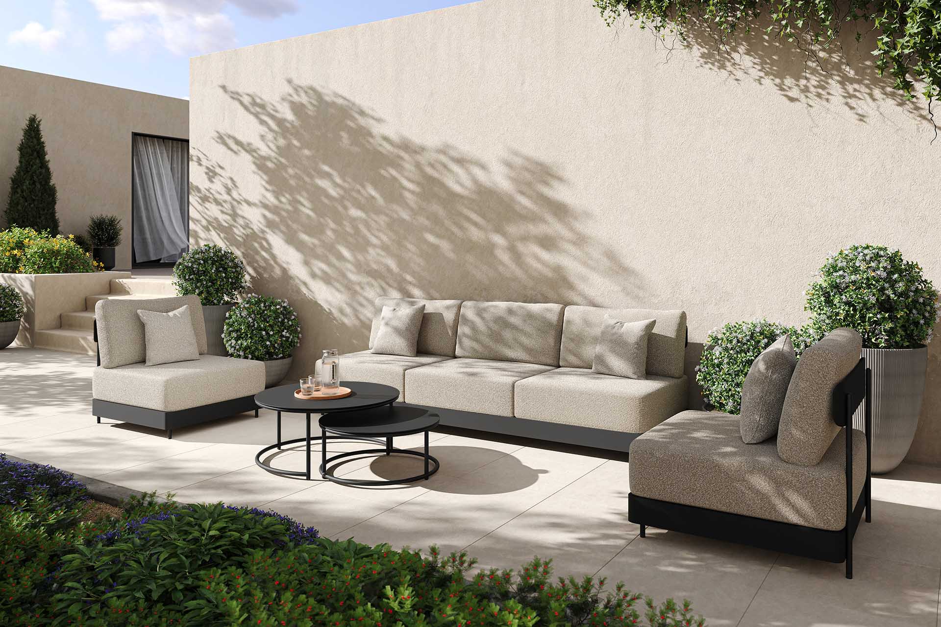 Die passenden Polster aus Bouclet sind im Lieferumfang enthalten: In der Variante mit Gestell in eisengrau Polster in cielo steel, in der Variante mit Gestell in dune Polster in cielo kit. Das Set eignet sich hervorragend für hochwertige Terrassen und moderne Gartenanlagen.