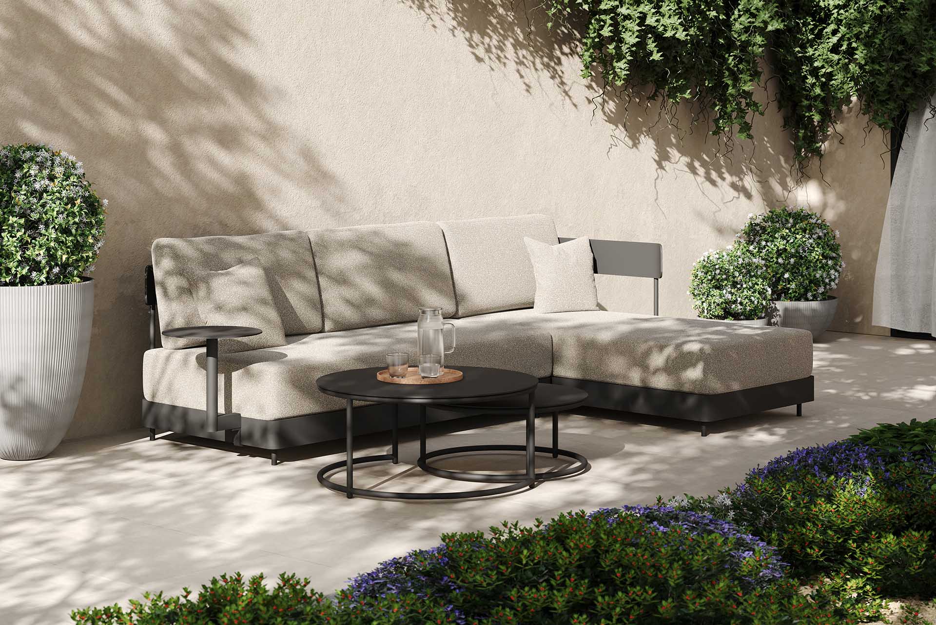 Das pulverbeschichtete Aluminiumgestell ist wetterfest, robust und leicht. Sitz- und Rückenflächen aus Aluminiumlamellen bieten Stabilität, schnelles Abtrocknen und eine klare, moderne Optik. Die Recamiere verfügt über eine Rückenlehne entlang der langen Seite sowie über eine kurze Seitenlehne auf der rechten Seite. Das 2-Sitzer-Modul besitzt eine durchgehende Rückenlehne, jedoch keine Seitenlehne, sodass es sich perfekt an die Recamiere anschließt.