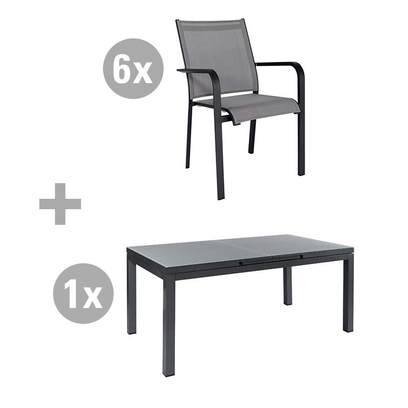 Produktname: Set Gabon 160/210x90cm grau/Glas hellgrau + 6 Dransy Stapelsessel