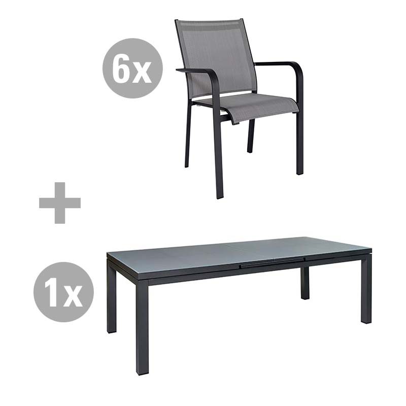 Produktinformationen "Set Gabon 220/280x100cm grau/Glas hellgrau + 6 Dransy Stapelsessel"