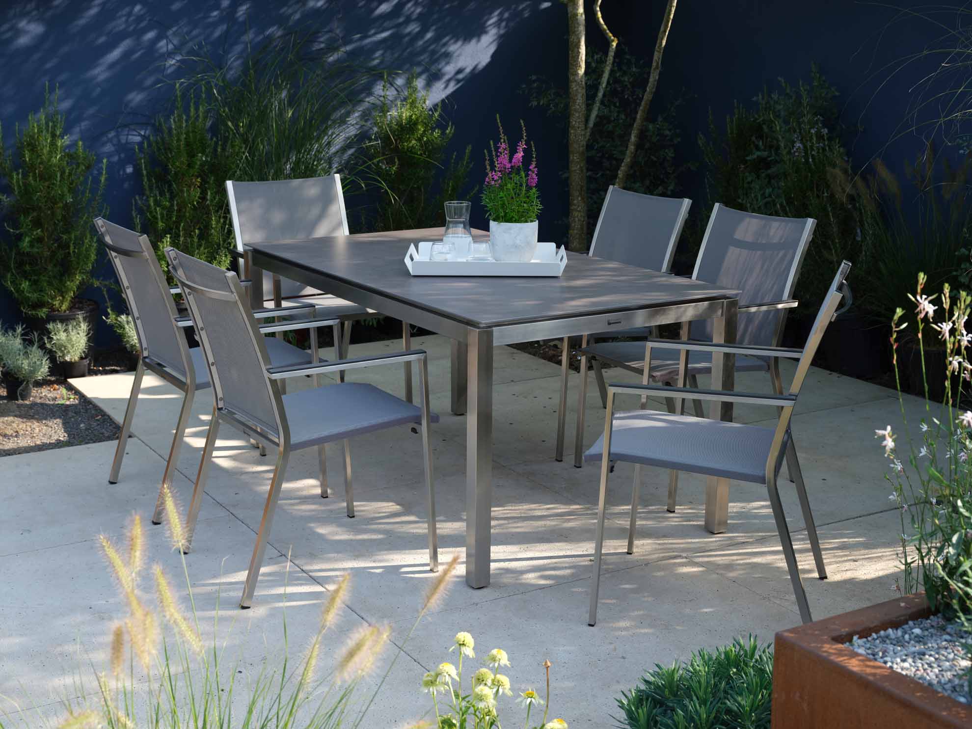 Eigenschaften "Set Muri 160x90cm Edelstahl/HPL granit dunkelgrau + 6 Rome Stapelsessel silber"