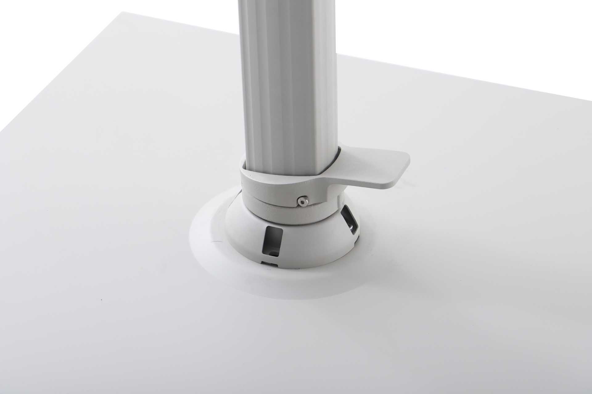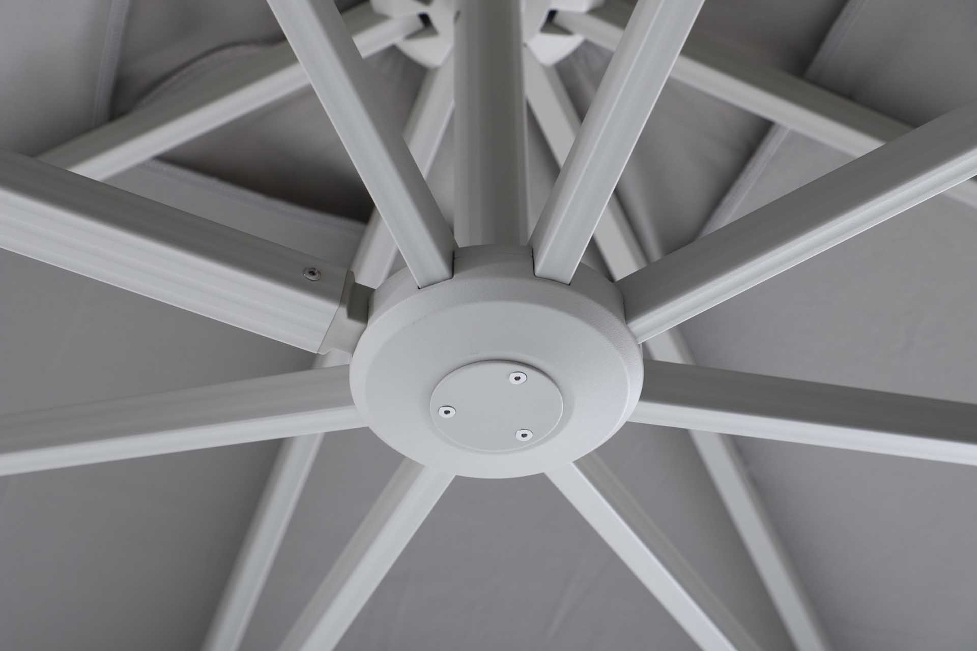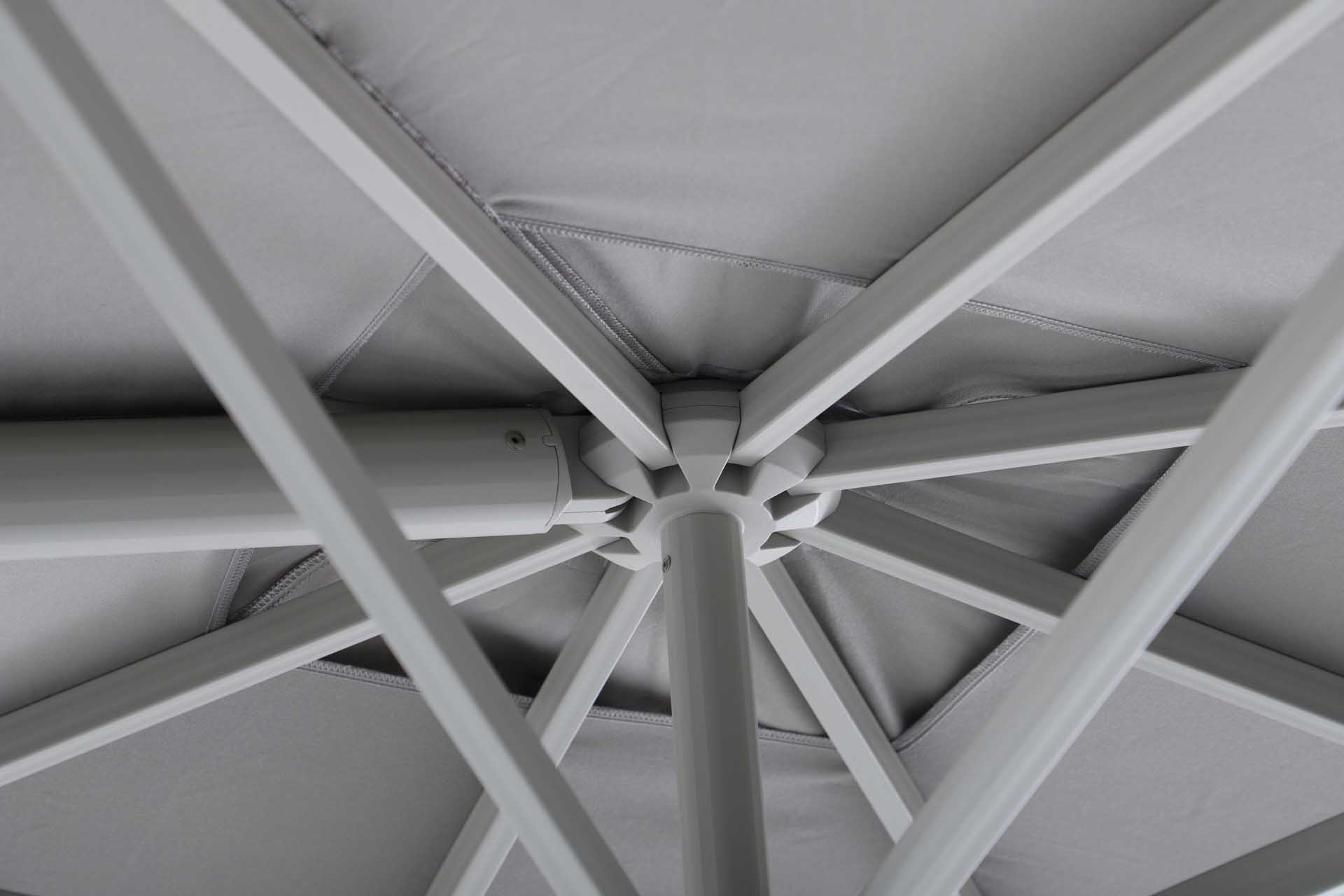 Das Gestell besteht aus pulverbeschichtetem Aluminium – robust, korrosionsbeständig und langlebig. Der Schirm öffnet sich leichtgängig über eine Kurbelmechanik, die komfortables Aufspannen und Schließen ermöglicht.