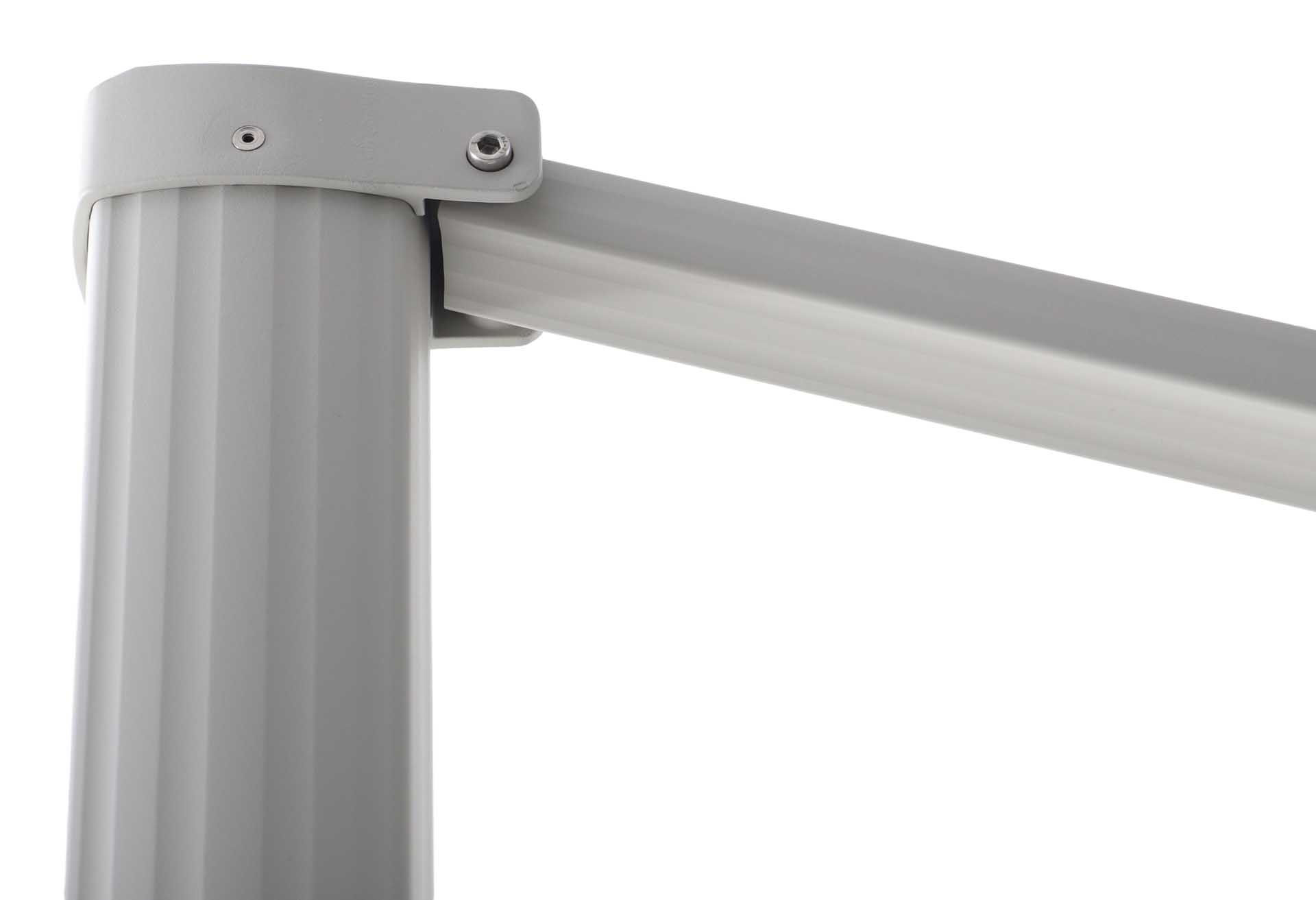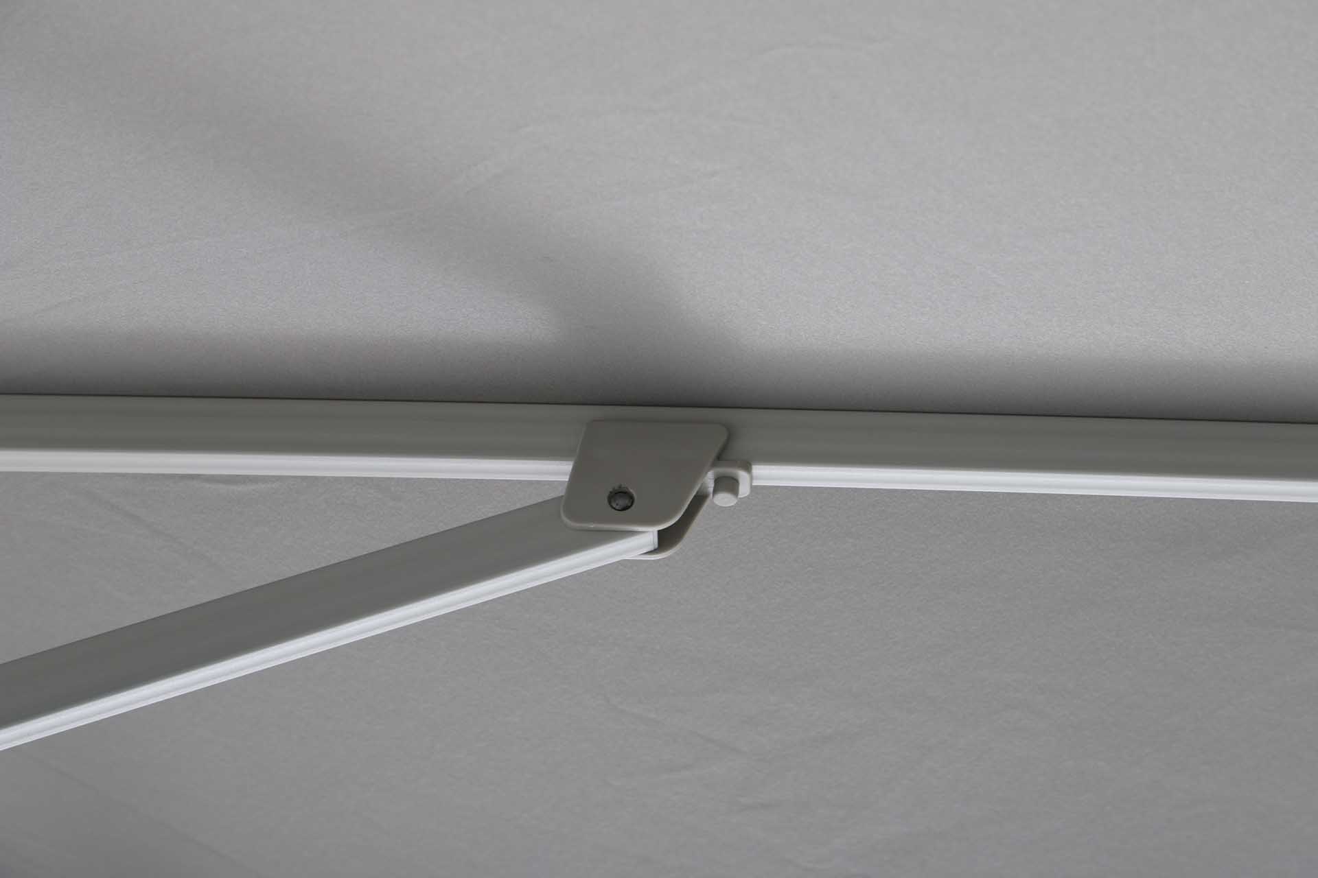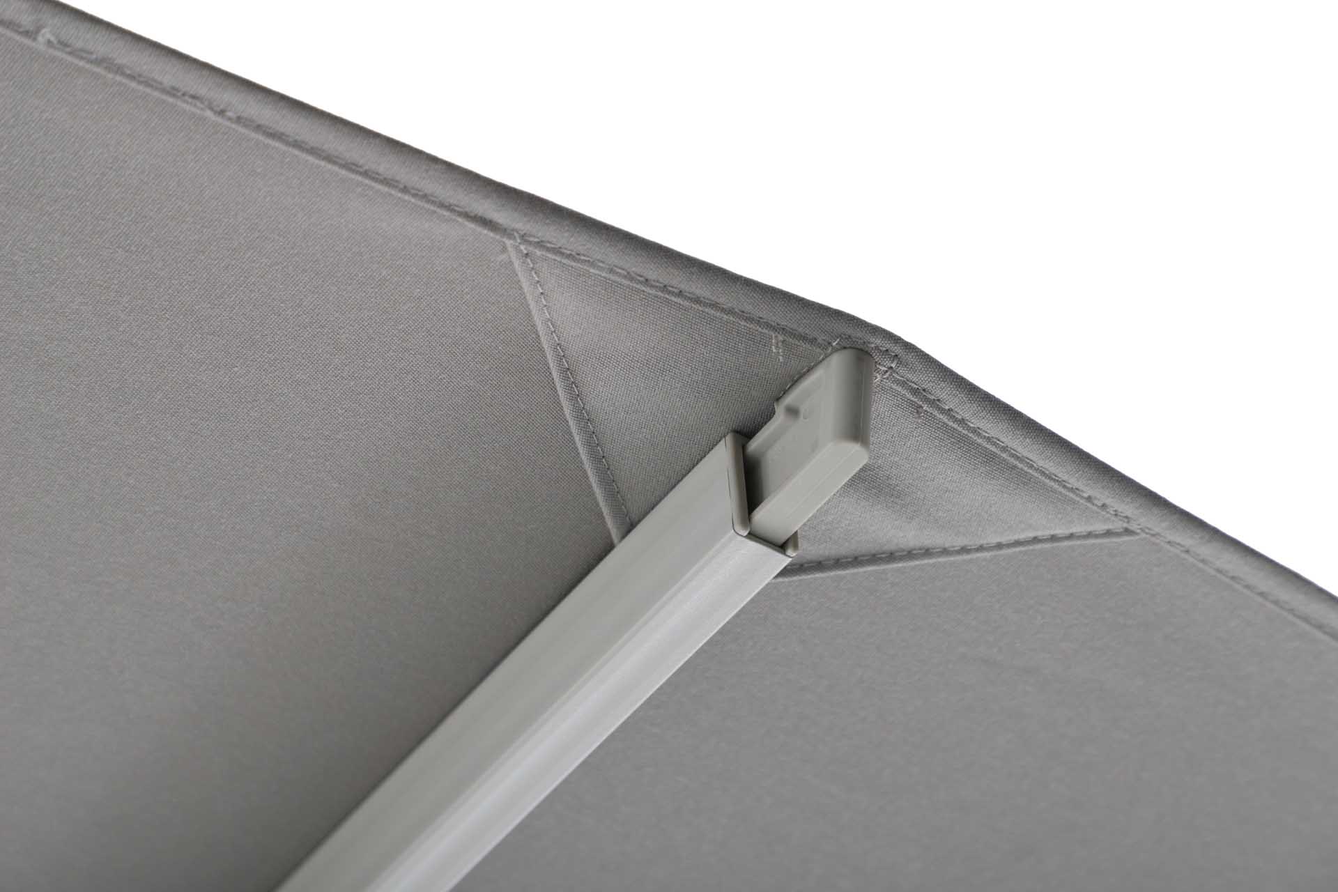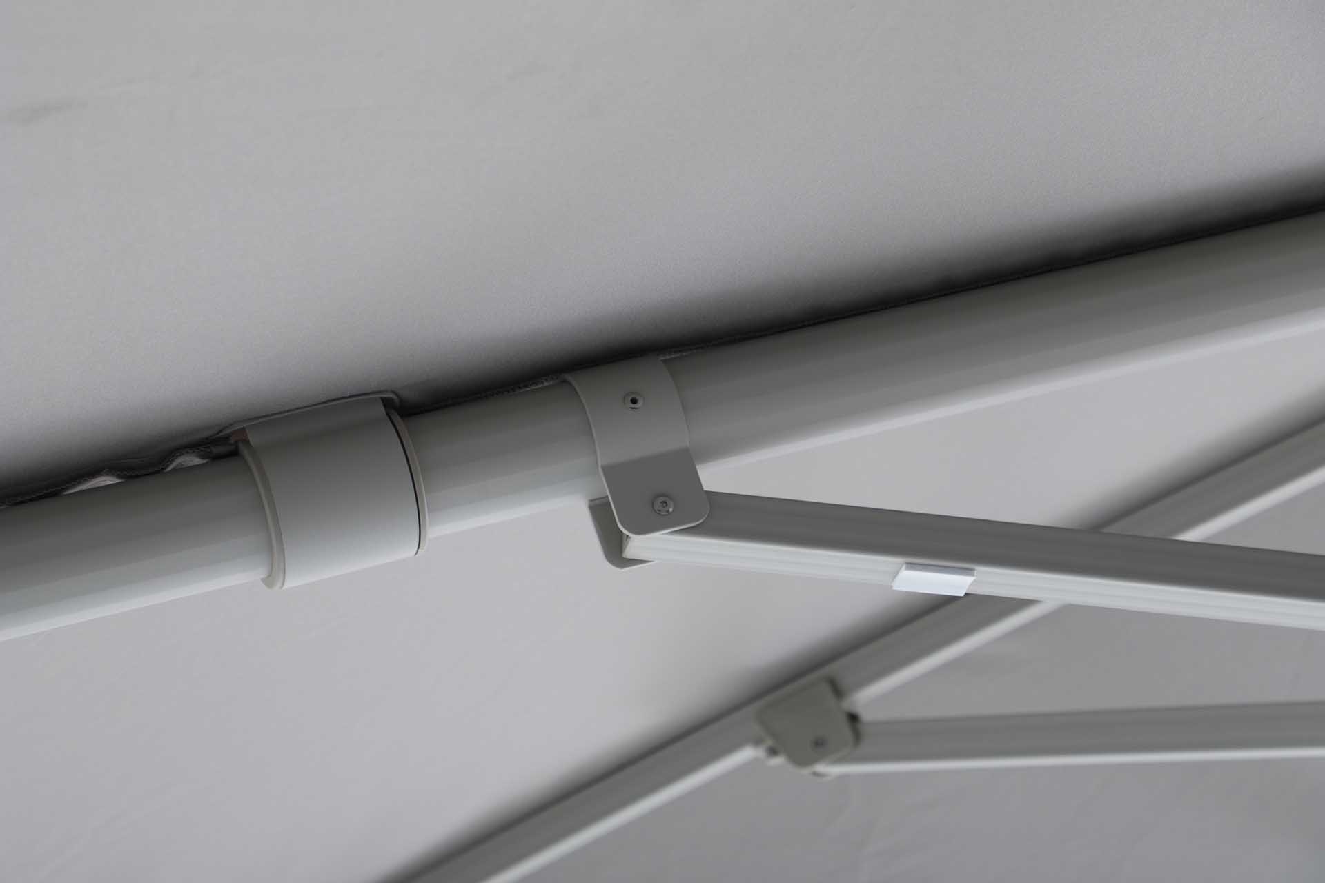 Das Gestell besteht aus pulverbeschichtetem Aluminium – robust, korrosionsbeständig und langlebig. Der Schirm öffnet sich leichtgängig über eine Kurbelmechanik, die komfortables Aufspannen und Schließen ermöglicht.