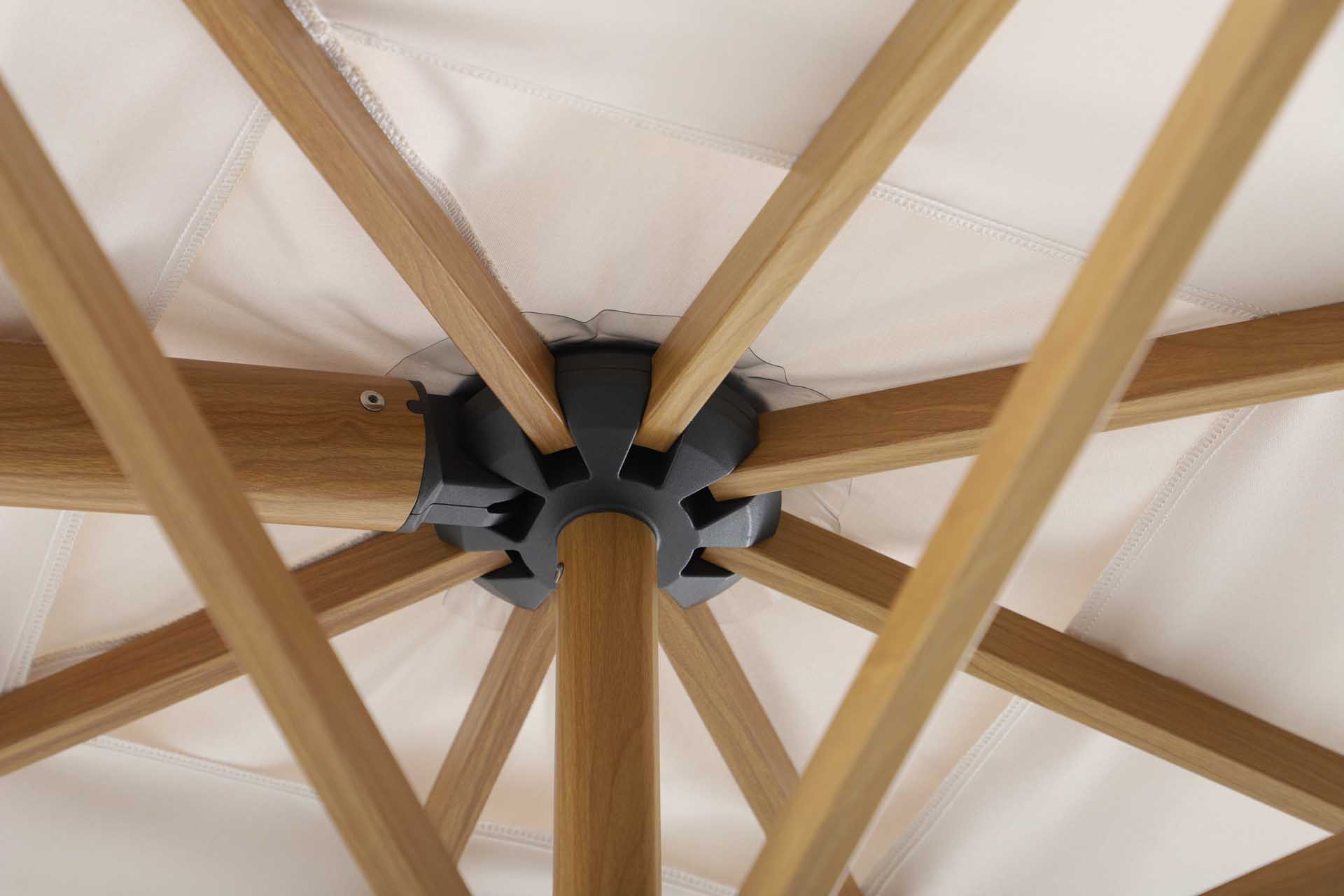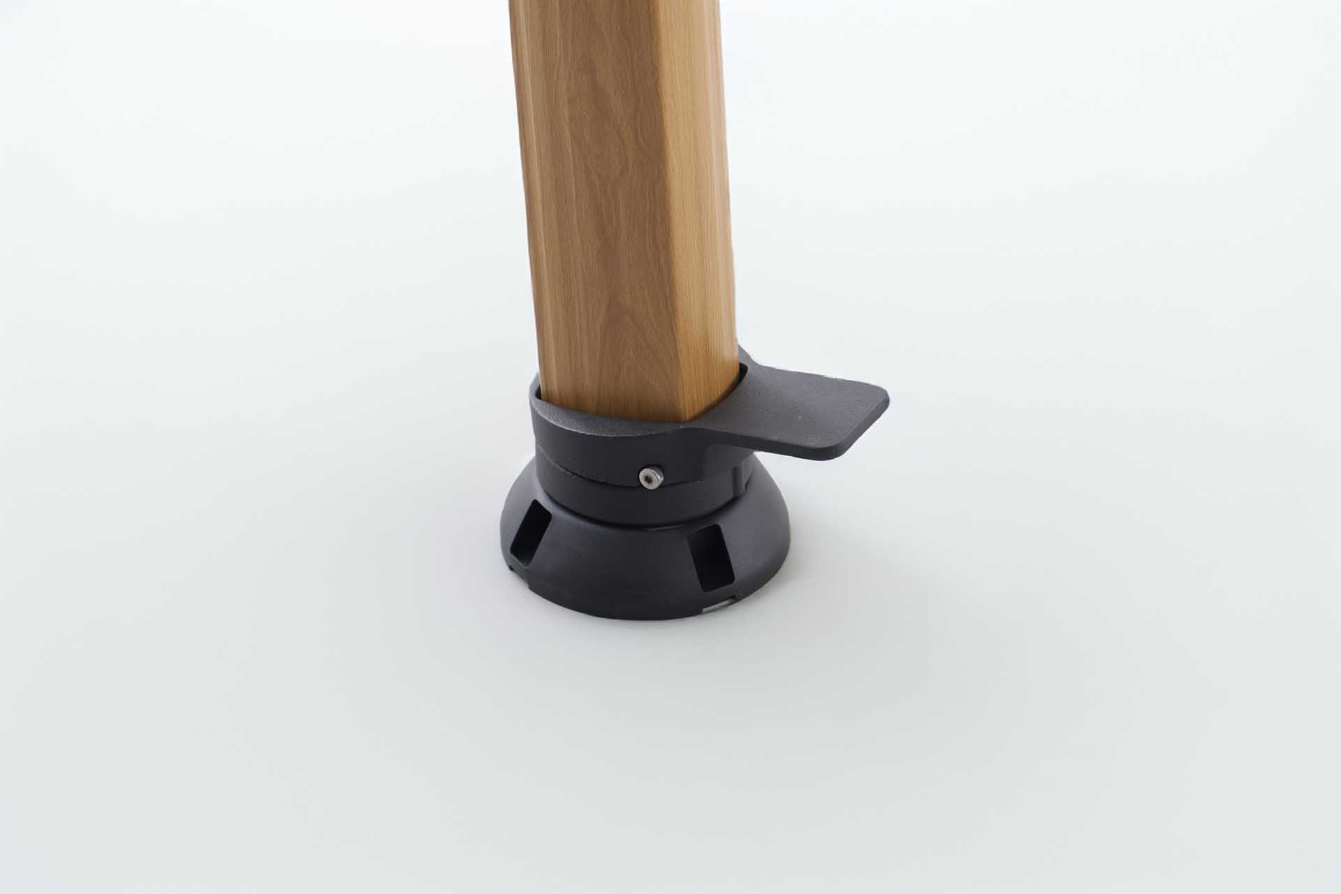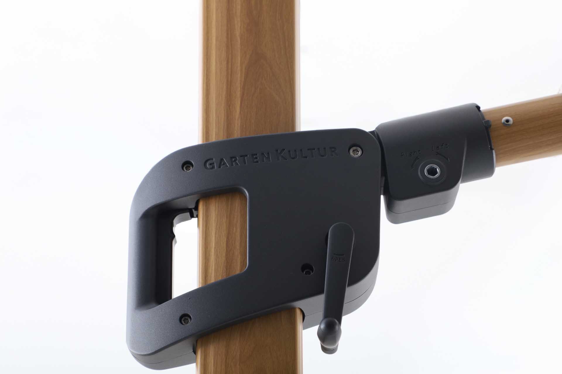 Das Gestell besteht aus pulverbeschichtetem Aluminium – robust, korrosionsbeständig und langlebig. Der Schirm öffnet sich leichtgängig über eine Kurbelmechanik, die komfortables Aufspannen und Schließen ermöglicht.