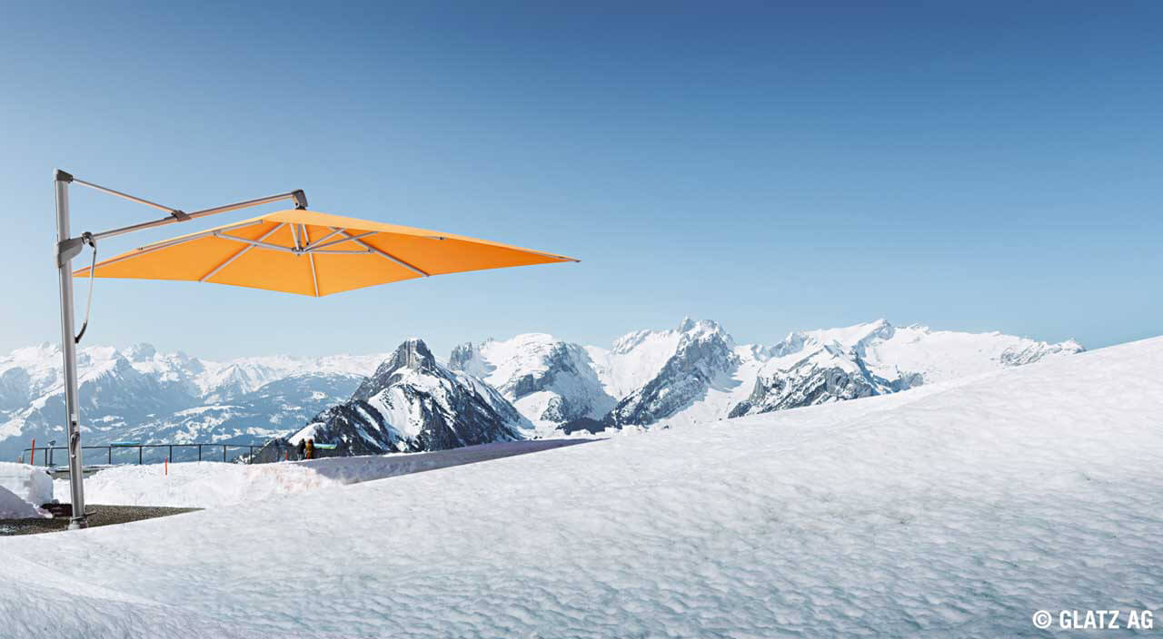 Der  SOMBRANO® S+ Sonnenschirm  ist ein großer, robuster Freiarmschirm  von   Glatz   mit vielen Verstellmöglichkeiten. Er kann in geöffnetem Zustand um 360° gedreht werden, außerdem lässt sich sein Schirmbach beidseitig um bis zu 54° zum Ausleger neigen. So sorgt er auch bei schräg einfallender Sonne für perfekten Schatten und optimalen Sonnenschutz.  Das Öffnen und Schliessen des Schirmes erfolgt leicht und komfortabel per Handkurbel. Der SOMBRANO® eignet sich sowohl für den Einsatz im Privatbereich als auch in der Gastronomie und im öffentlichen Raum.  Abhängig von der Größe des Schirmdaches oder der Art der Befestigung kann er selbst bei Windgeschwindigkeiten von bis zu 45km/h genutzt werden (Details finden Sie in den technischend Daten). Das Schirmgestell und die Streben des Schirmdaches bestehen beim SOMBRANO® S+ aus Aluminium. Beim Schirmdach stehen verschiedene Farben und Stoffqualitäten zur Auswahl. Weitere Details zur hier verwendeten Stoffklasse finden Sie unter "Material & Pflege". Eine Schutzhülle aus Polyester mit Stab und Reißverschluß gehört zum Lieferumfang des Schirmes.  Zur Befestigung stehen verschiedene Schirmständer, Rollensockel, Bodenhülsen und Wandbefestigungen zur Auswahl (nicht im Lieferumfang enthalten).
